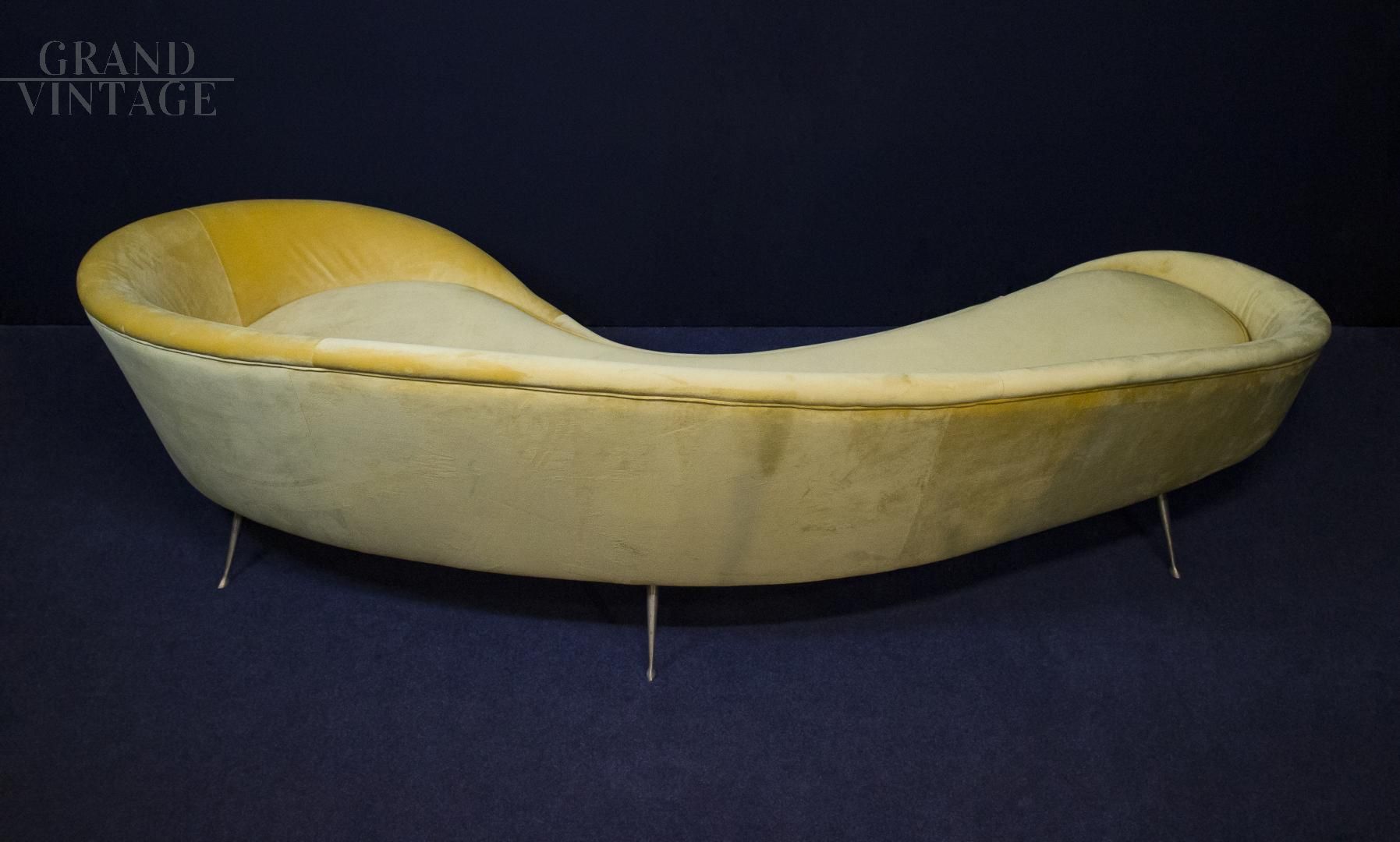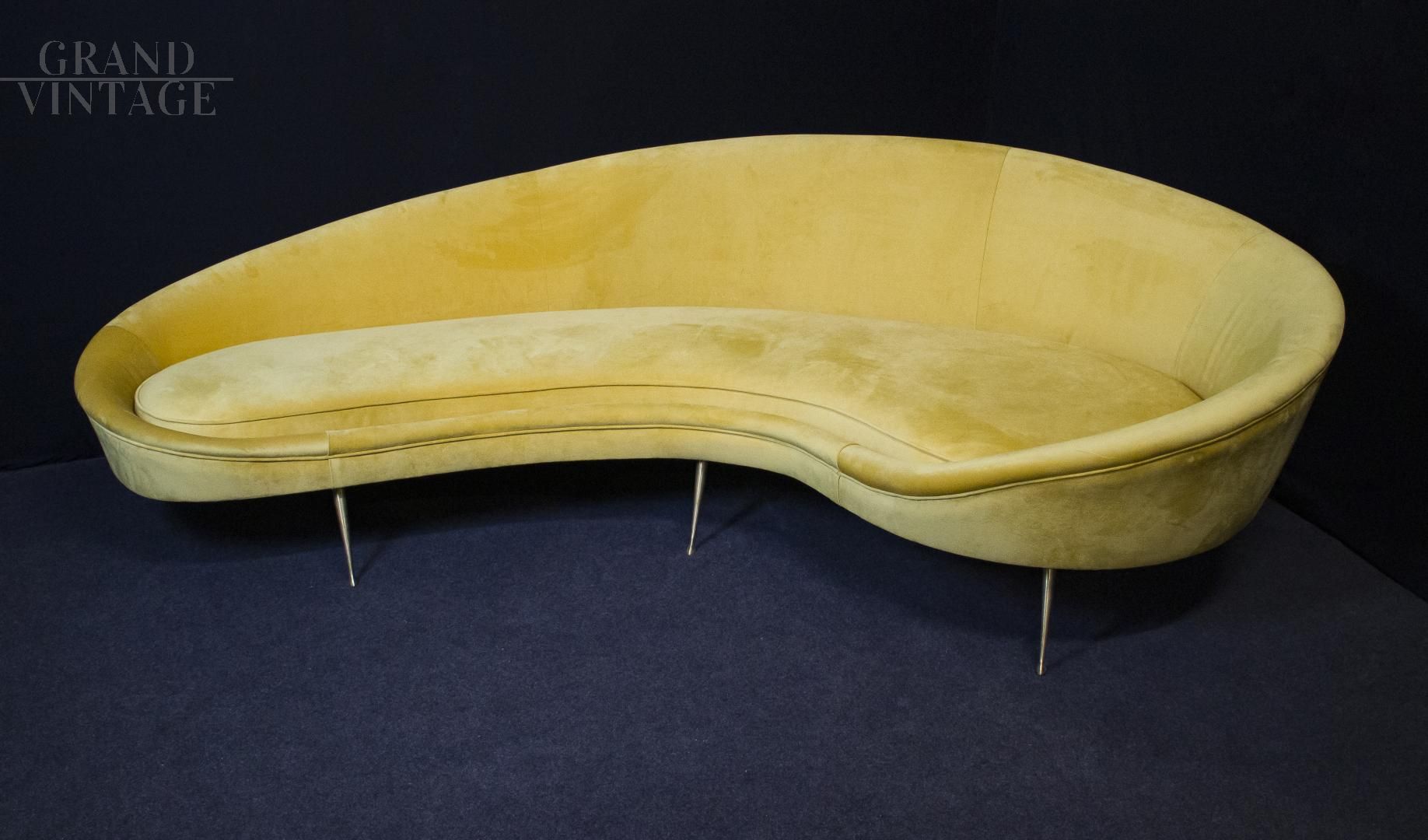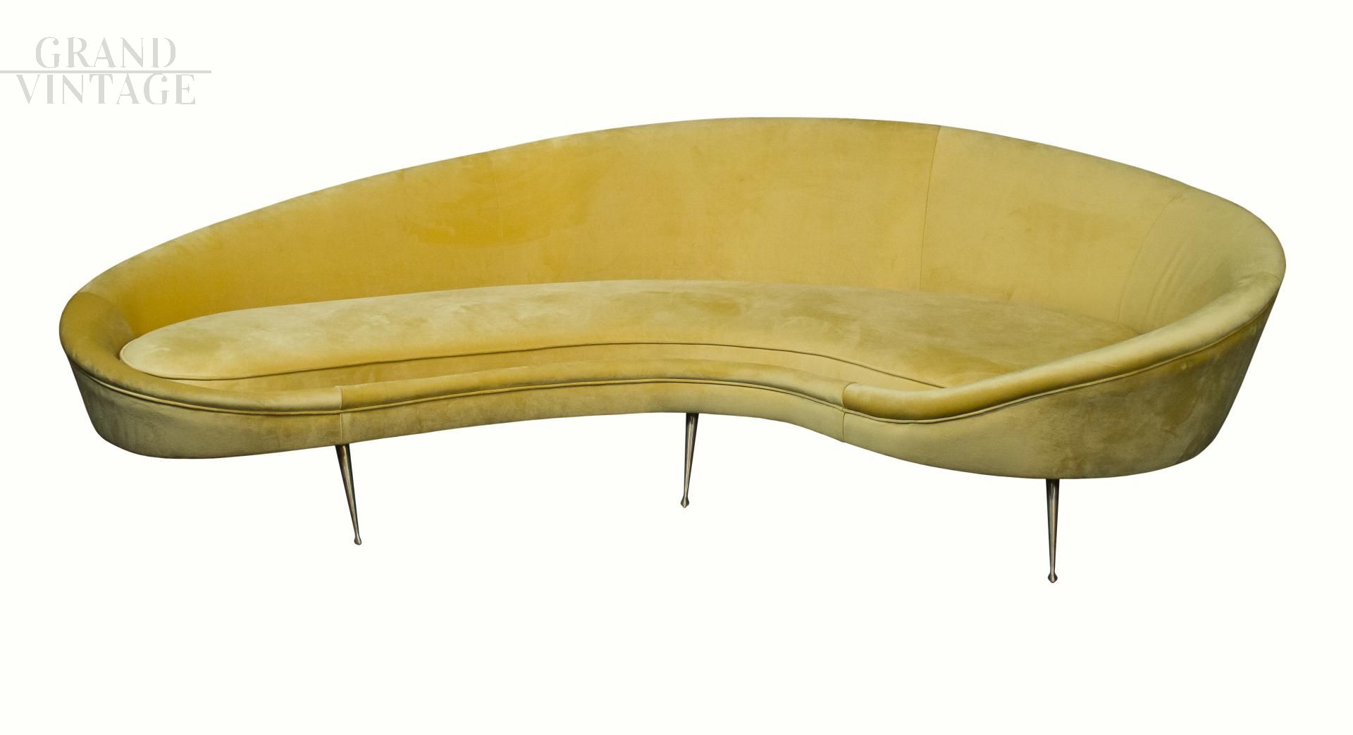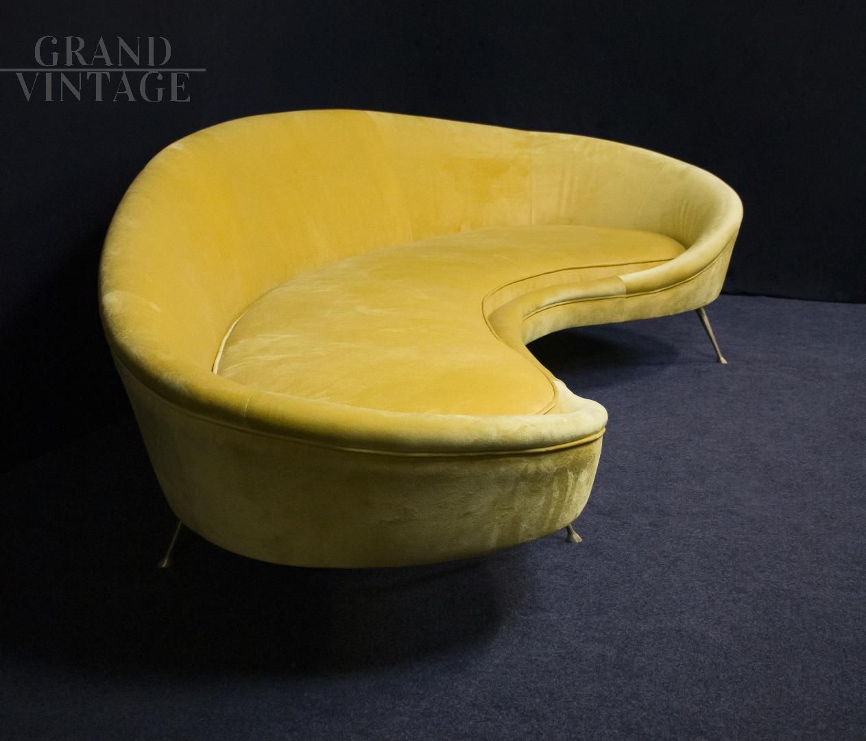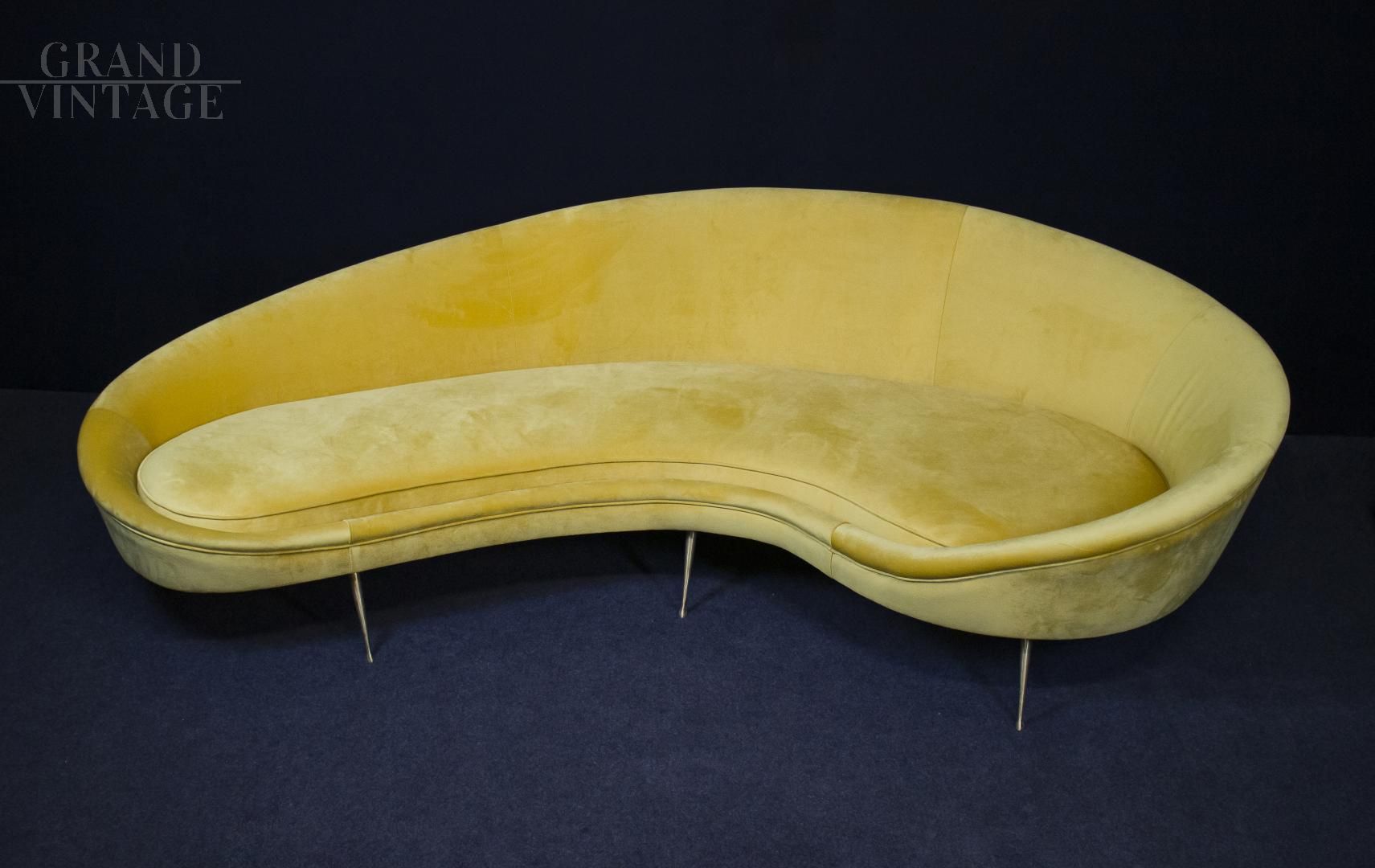 Vintage sofa with a beautiful shaped line, padded and upholstered in mustard / yellow fabric, with golden brass feet.