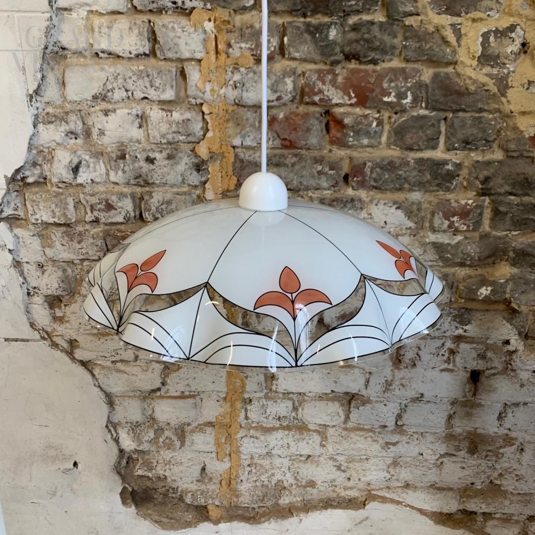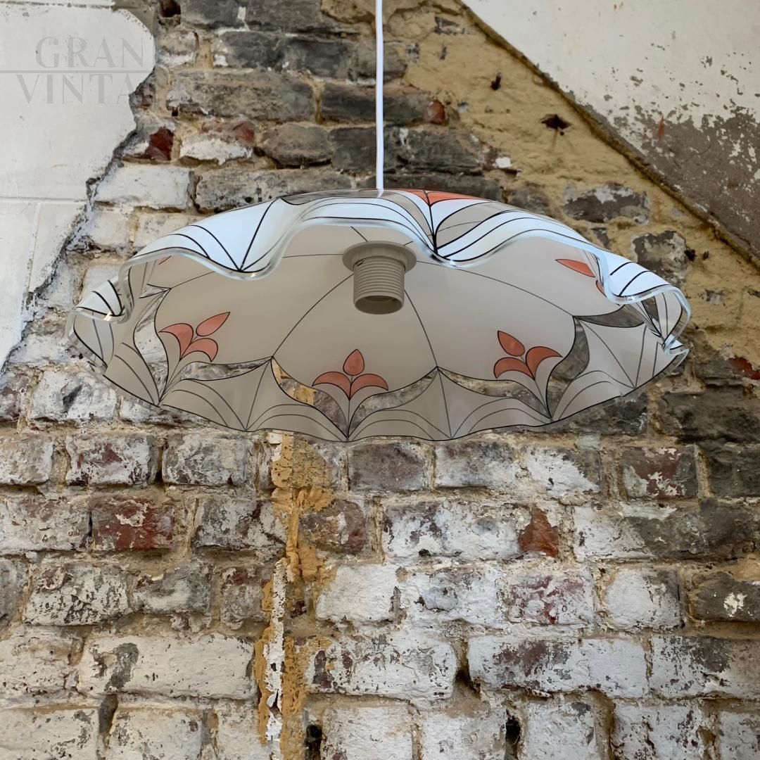 Vintage Yugoslavian pendant light in handkerchief shaped glass decorated in Art Nouveau style with flowers, made in the 1980s, in excellent condition with natural signs of aging, new wiring for E23 type bulb, not included.
