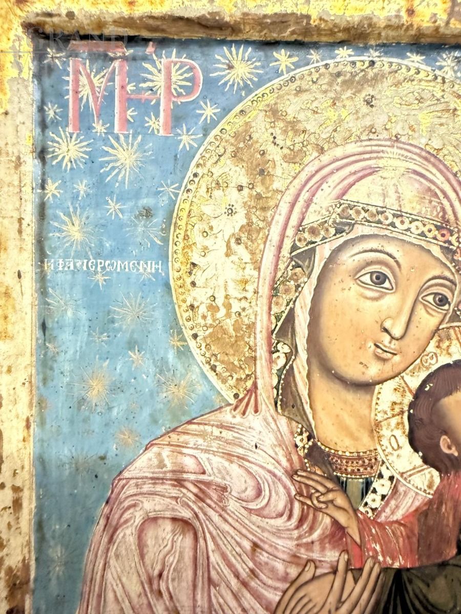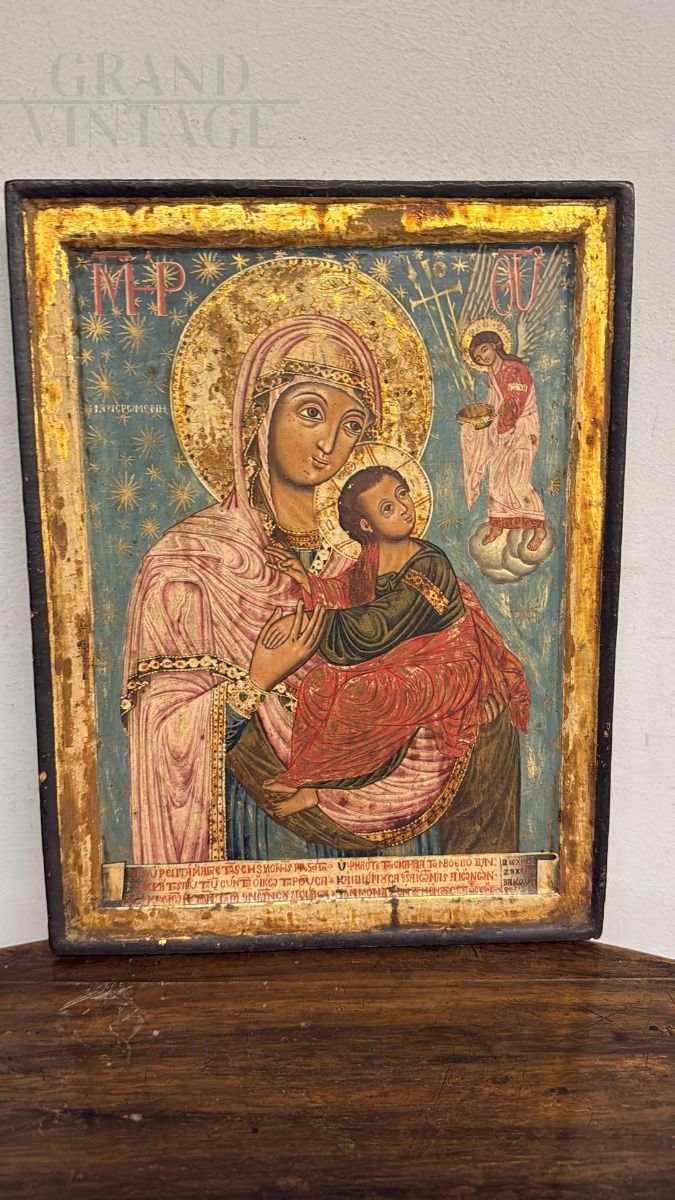Antique Russian icon depicting the Virgin and Child, painted, carved, and gilded in the 19th century. Beautifully crafted and colorful, in good condition, with natural signs of aging. Dimensions: 32 x 25 cm.