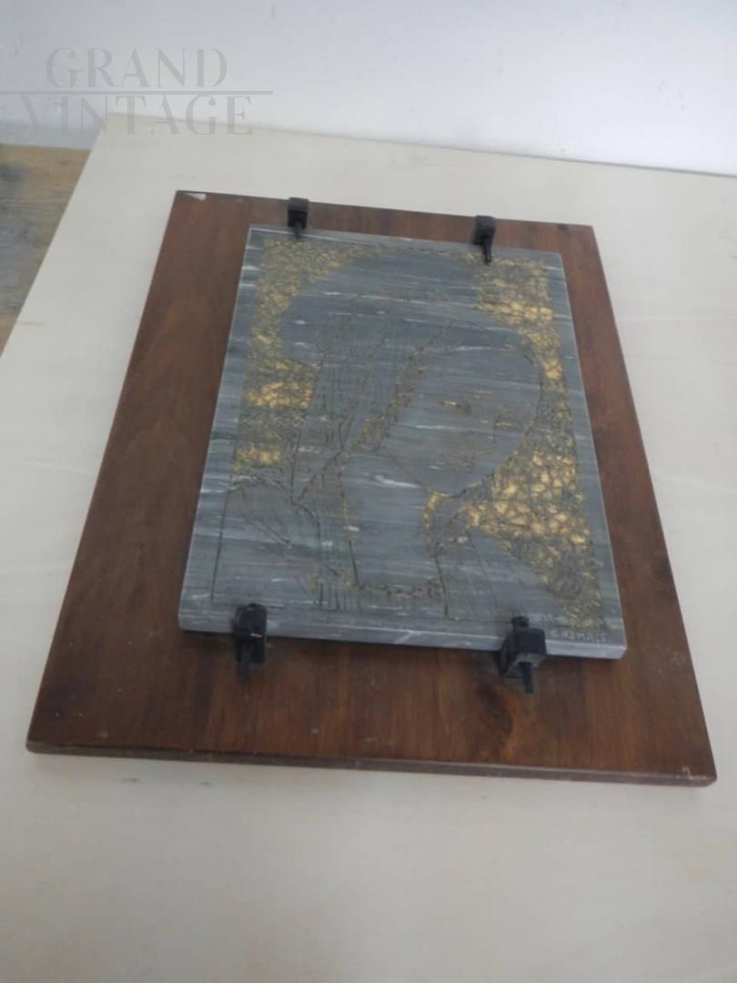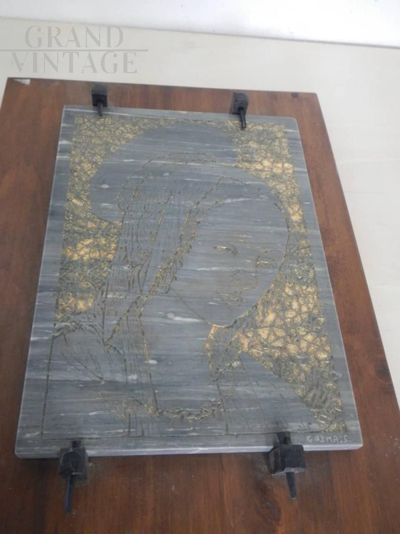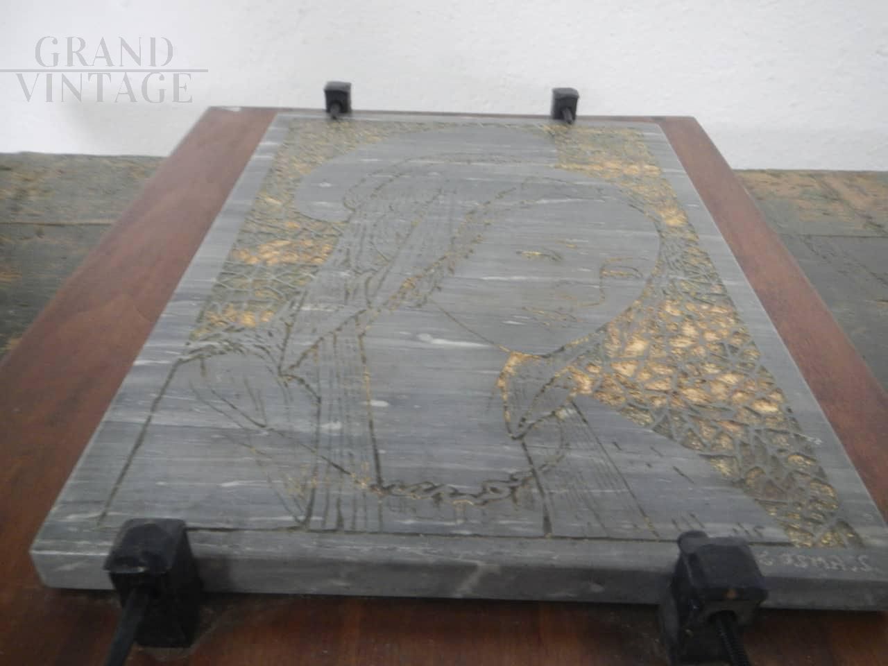 Sculpture with the Virgin Mary engraved on a marble plate with gold-colored designs, resting on a poplar wood tablet with handcrafted iron nails that support it. In excellent condition. The measurements refer to the sculpture. The total measure complete with wooden support is 36 x 48 cm, with a thickness of 4 cm.