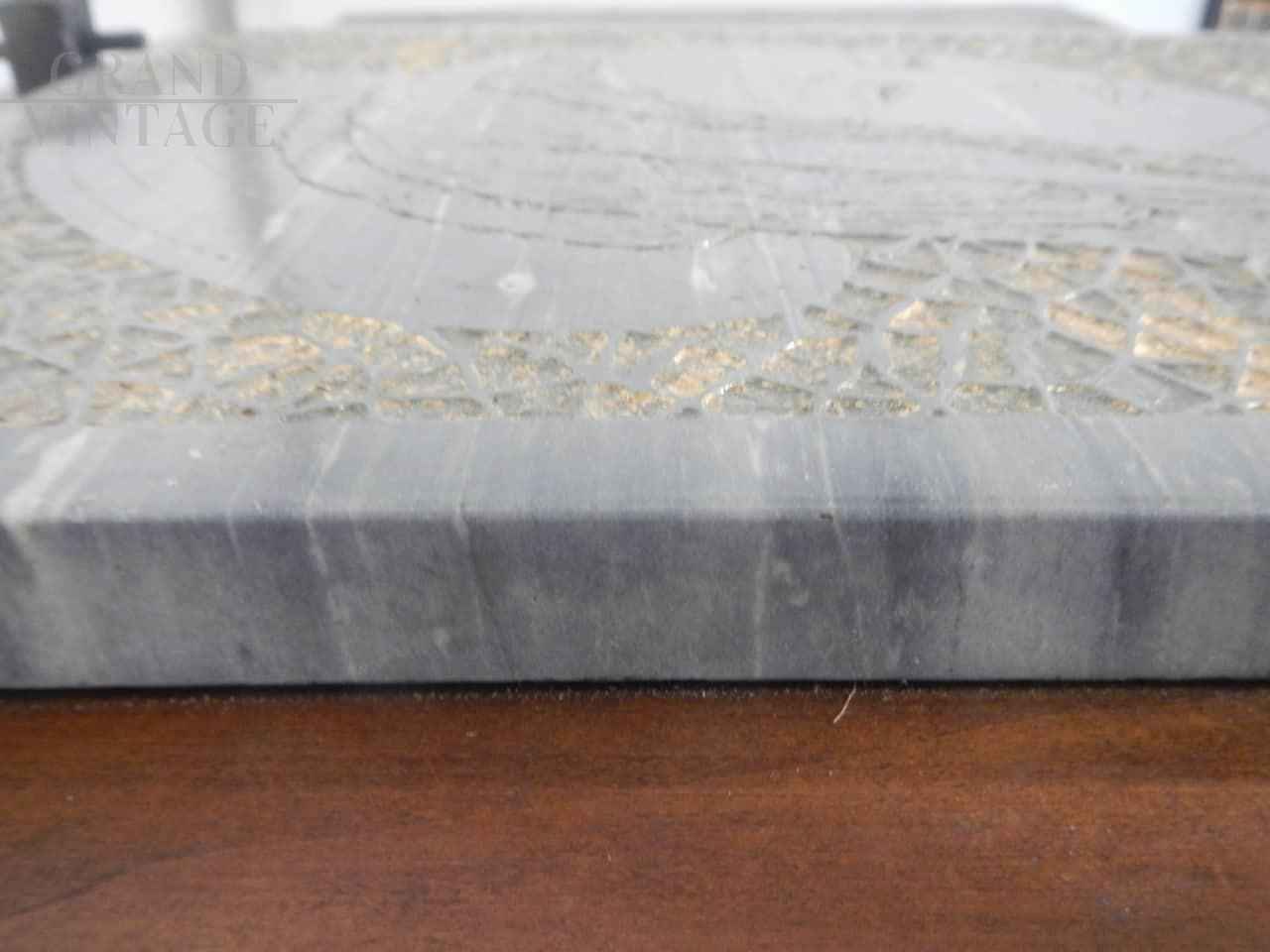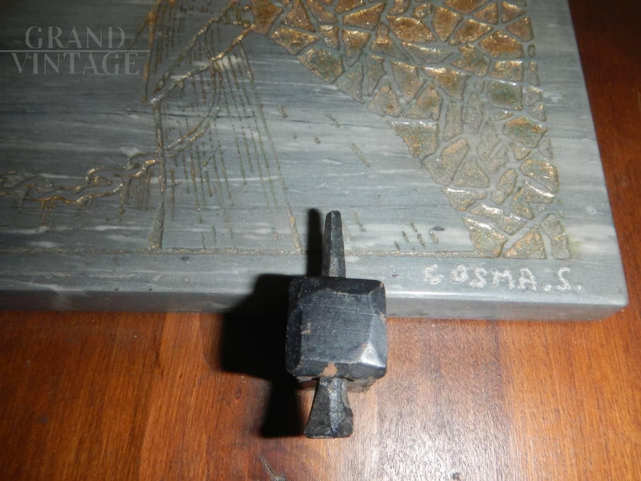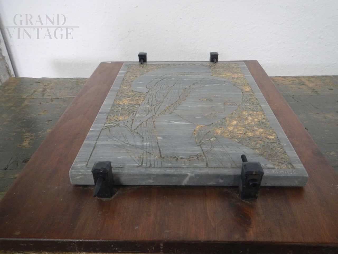 Sculpture with the Virgin Mary engraved on a marble plate with gold-colored designs, resting on a poplar wood tablet with handcrafted iron nails that support it. In excellent condition. The measurements refer to the sculpture. The total measure complete with wooden support is 36 x 48 cm, with a thickness of 4 cm.