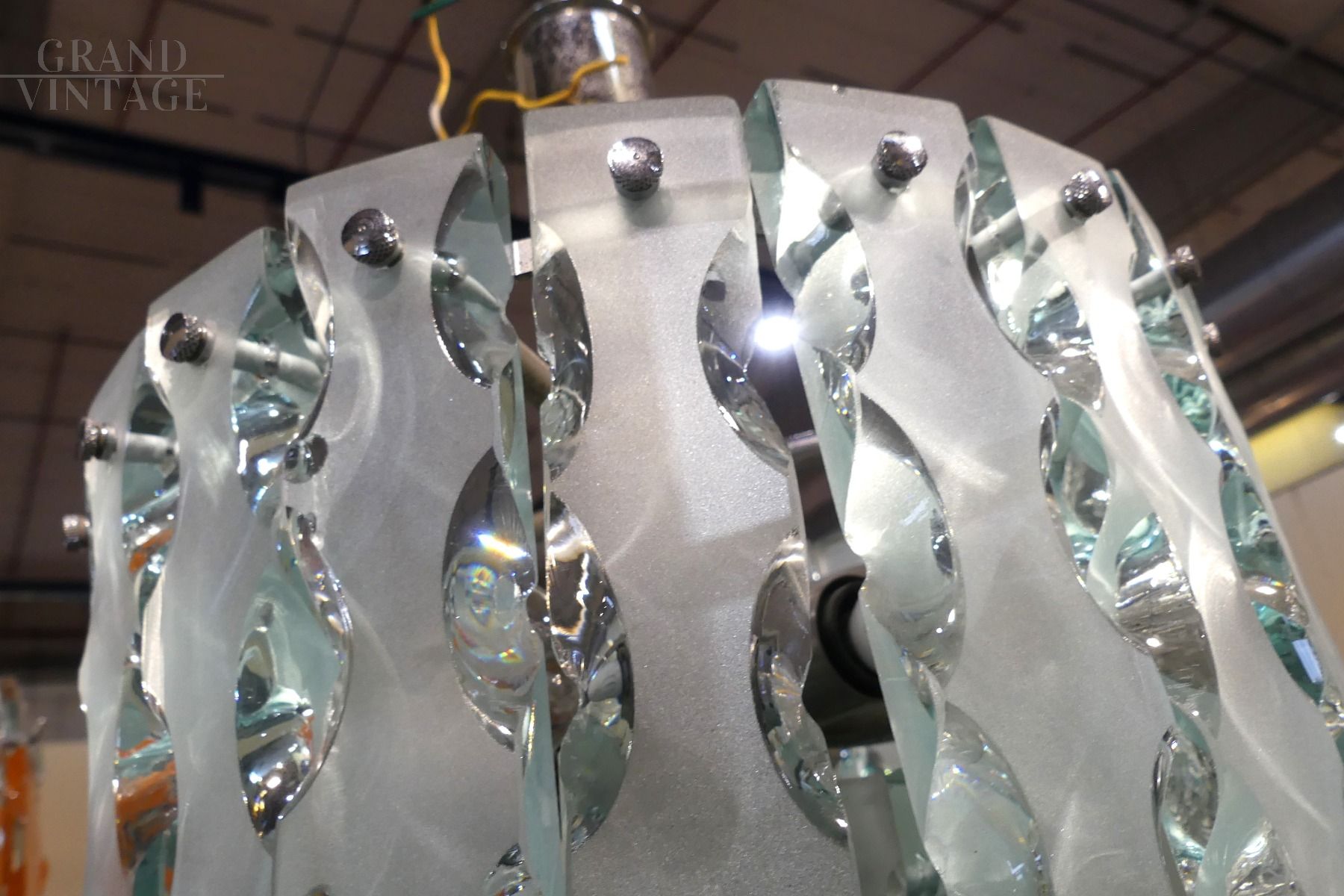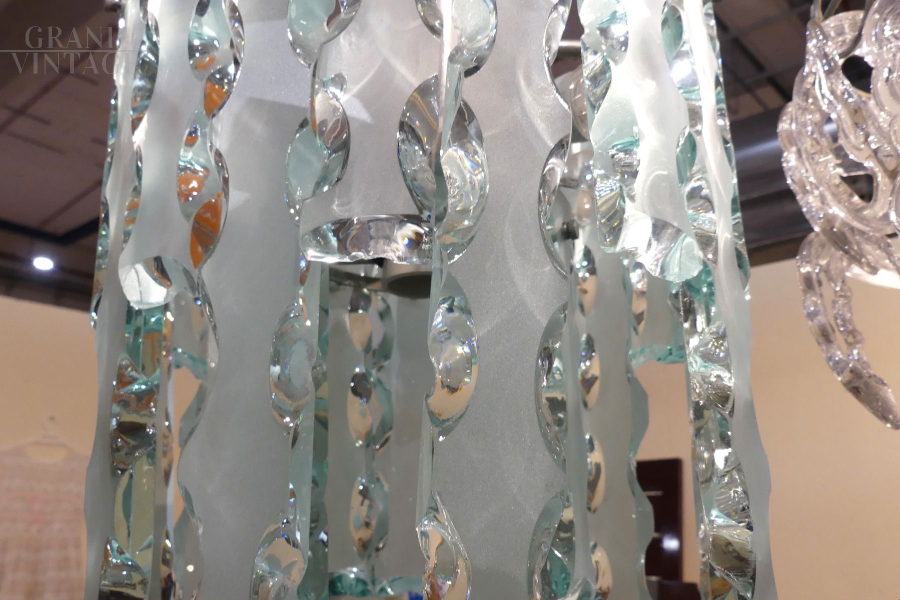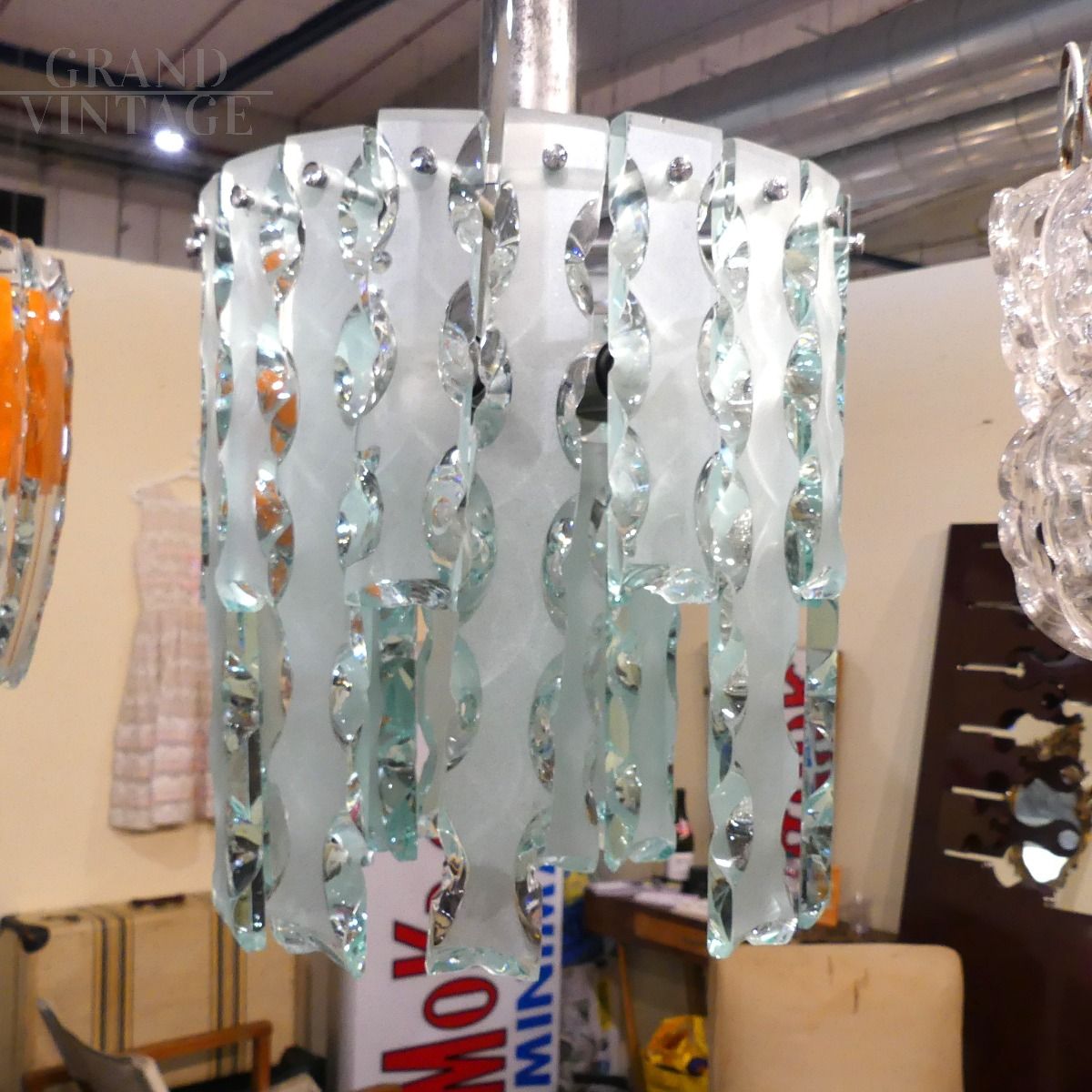 Vintage Vistosi chandelier with glass plates silk-screened on the surface and worked on the sides to show transparent areas in aqua green colour, Italy 1970s.