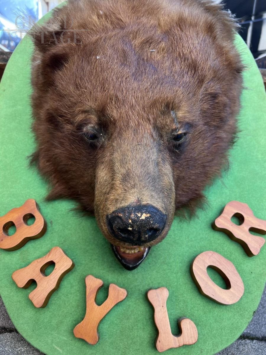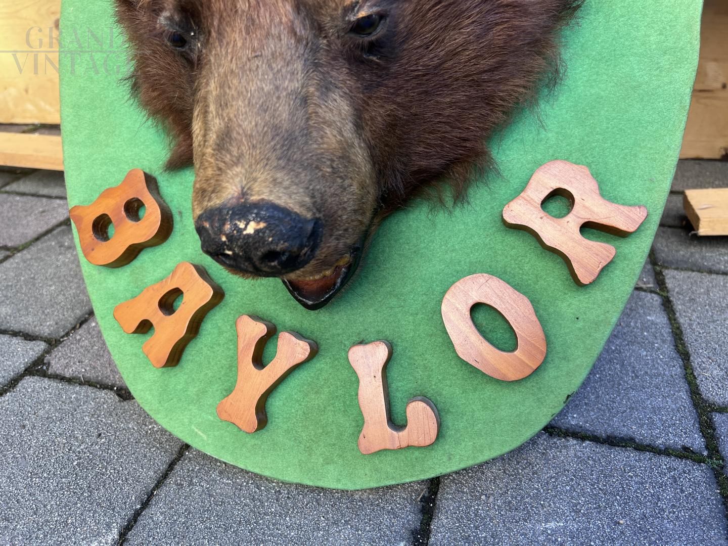 Real stuffed American bear head to hang on the wall on a green wooden support with Baylor writing.