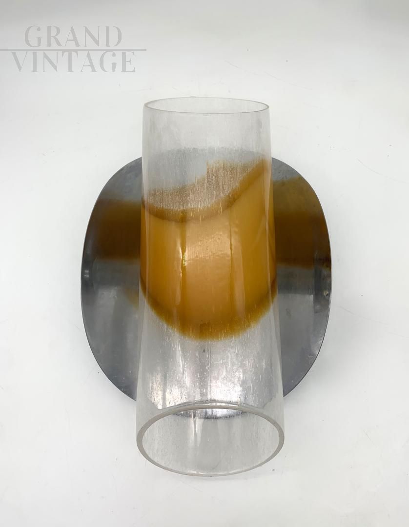 Fantastic and rare single wall light applique designed by Brotto attributed to Esperia with a transparent and amber orange Murano glass cylinder mounted on chromed metal base, a very particular item. Made in the 1980s, the lamp is in good condition with few signs of aging on the structure, it has a newly refurbished electrical system with a metal E27 bulb socket.
