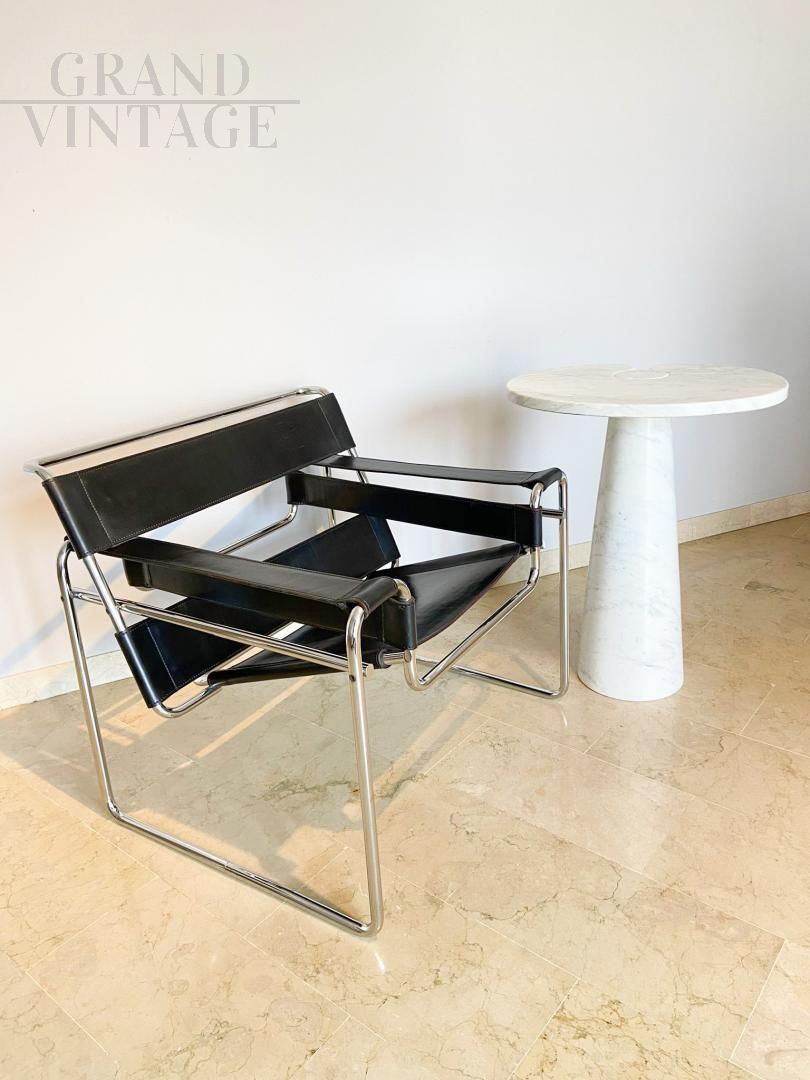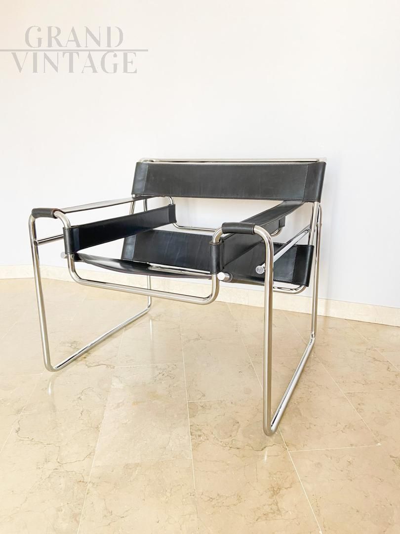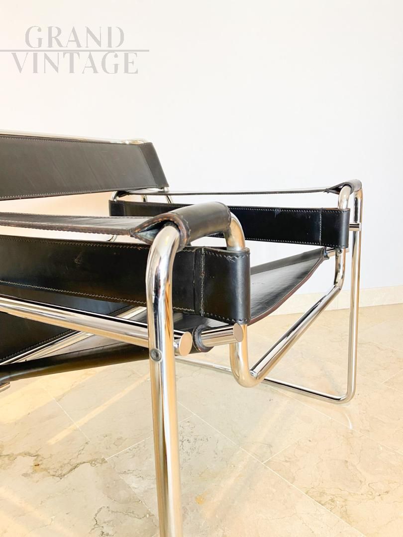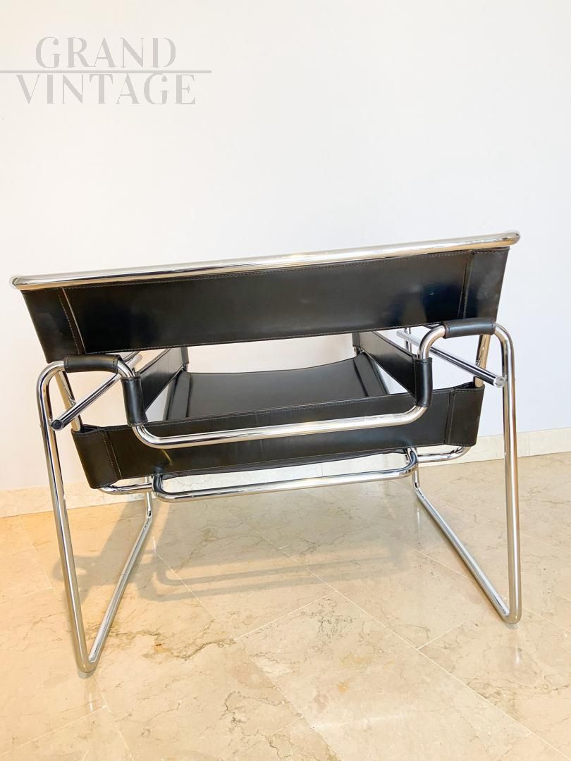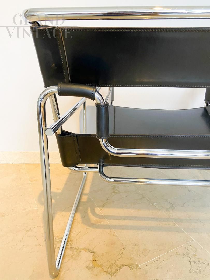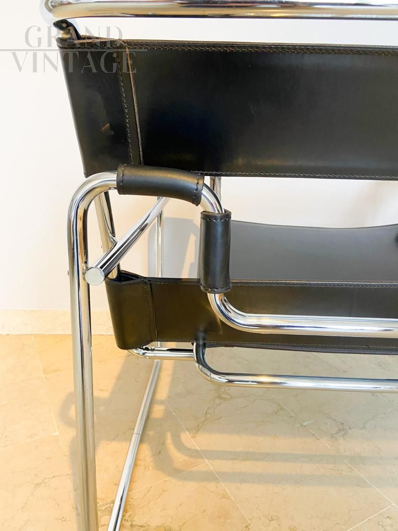 Beautiful design Wassily armchair by Breuer Marcel Lajos for Bononia in black leather with the classic chromed metal tubular structure, Italy 1980s.