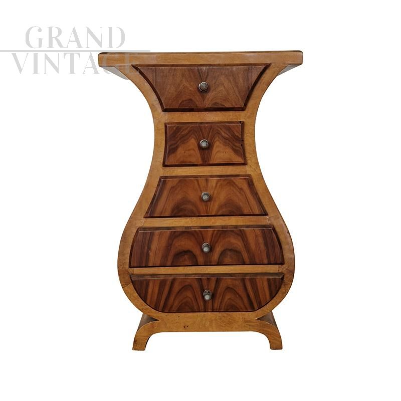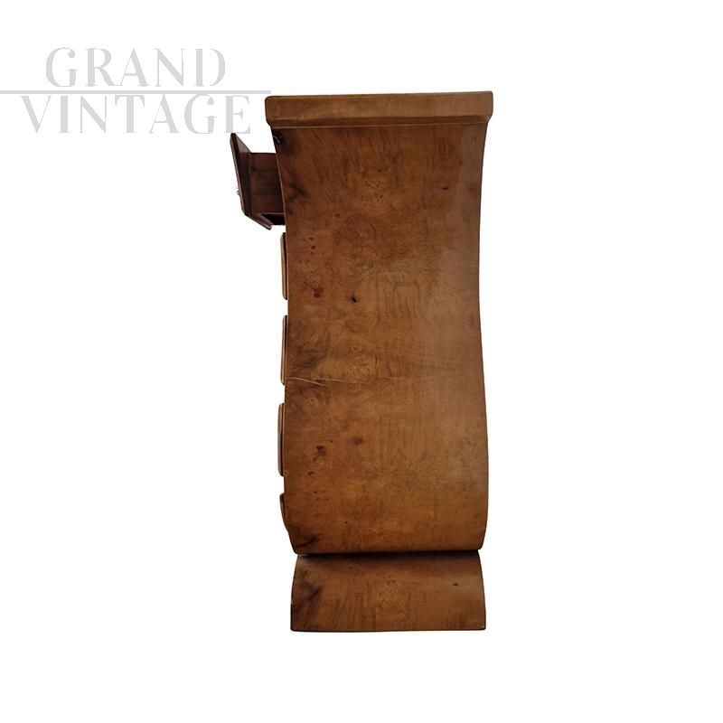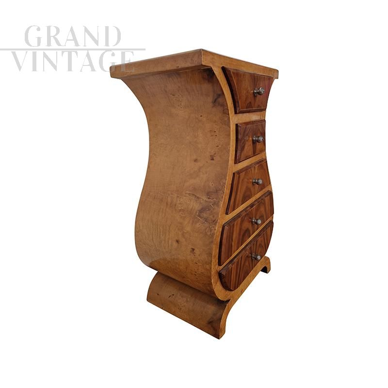 Design chest of drawers with a wavy shape in art deco style with 5 drawers in veneered birch briar and rosewood.