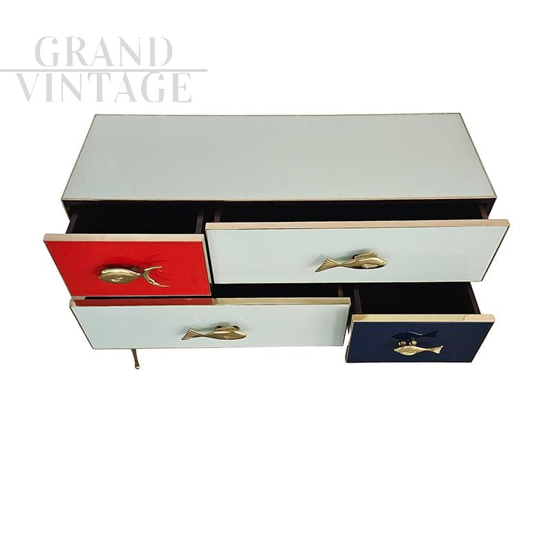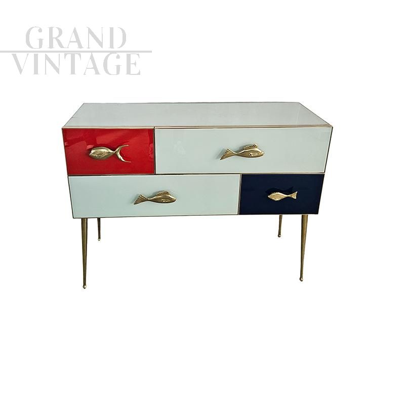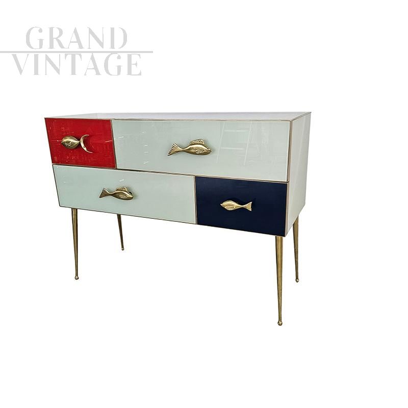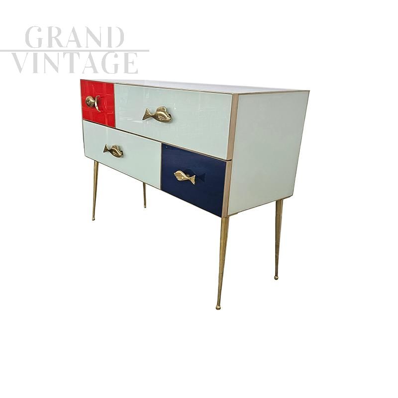 Console with wooden structure, covered in white, blue and red glass. Profiles, legs in brass. Enriched with fish-shaped brass handles. Equipped with four asymmetrical drawers. Dimensions (L x D x H) cm 120 x 45 x 90