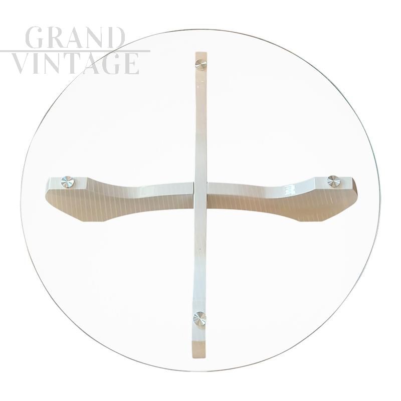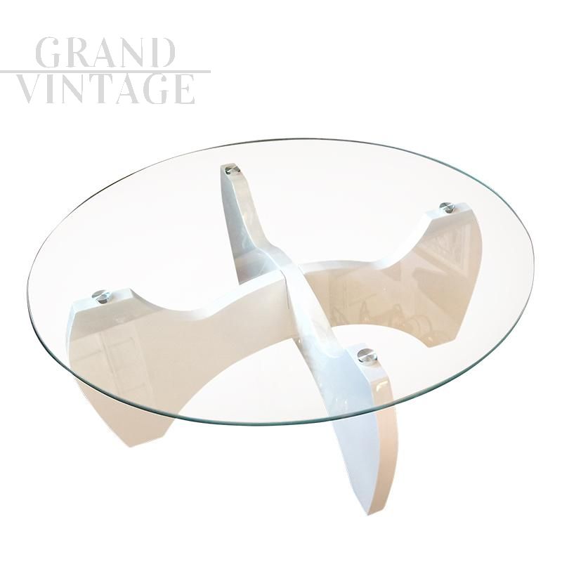 Design coffee table with glossy white lacquered wooden structure and round transparent tempered glass top.
