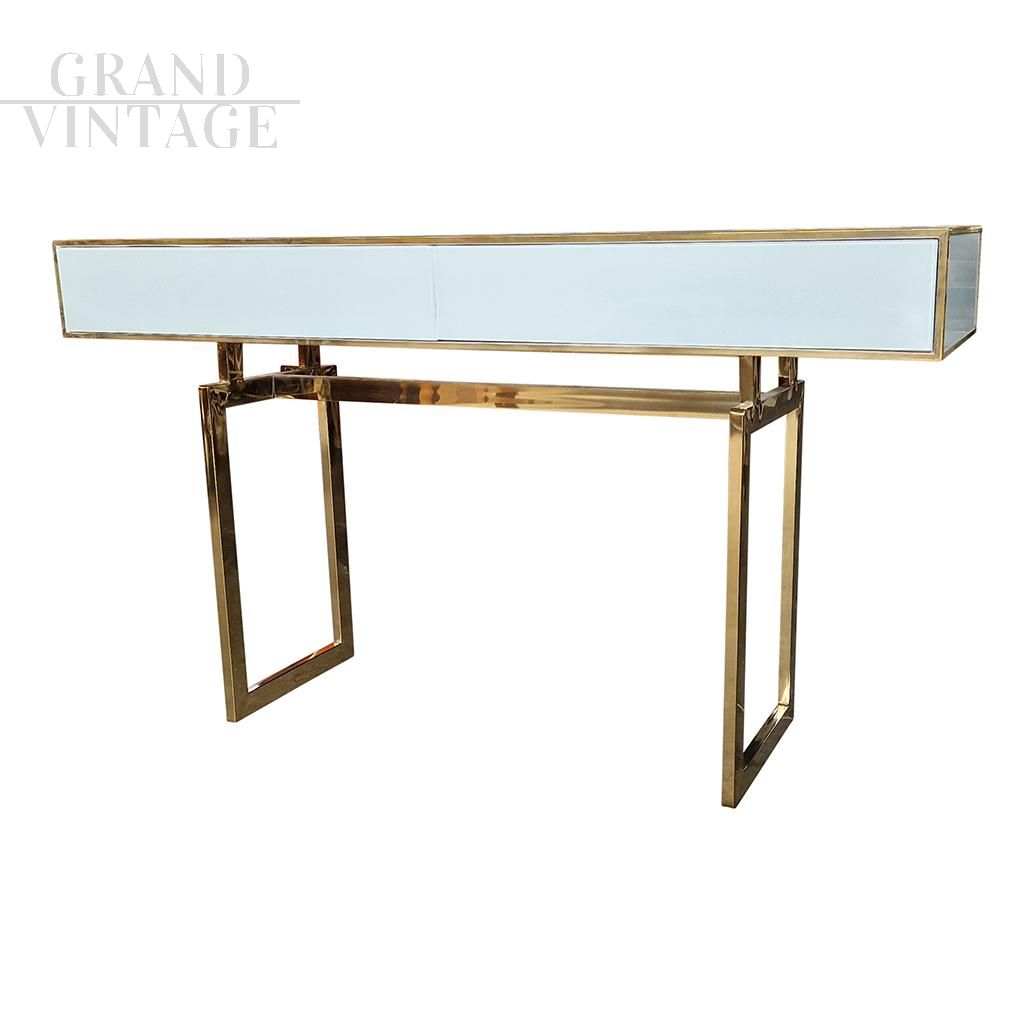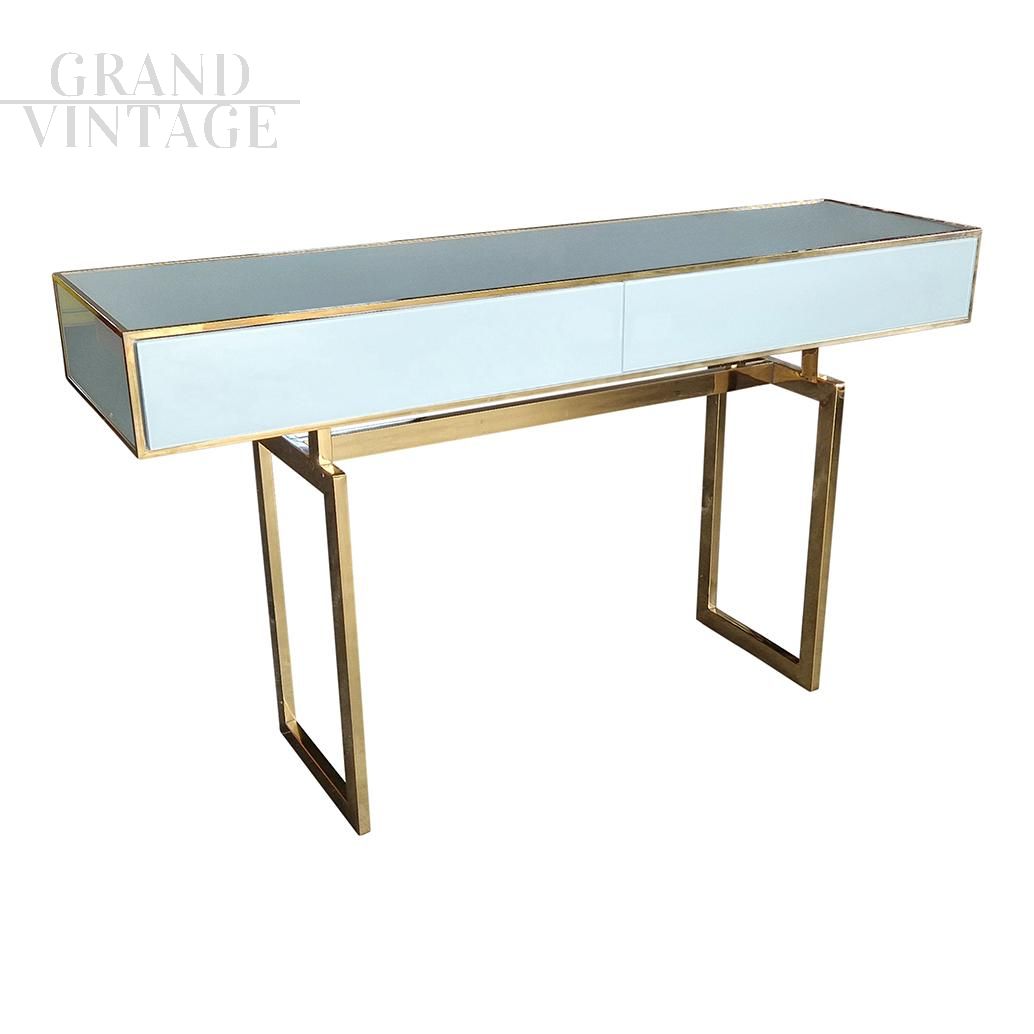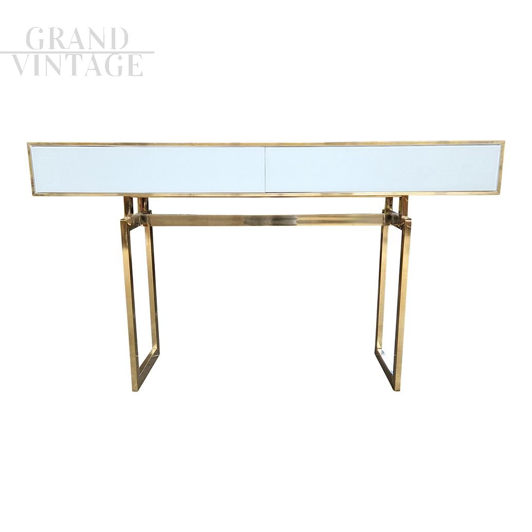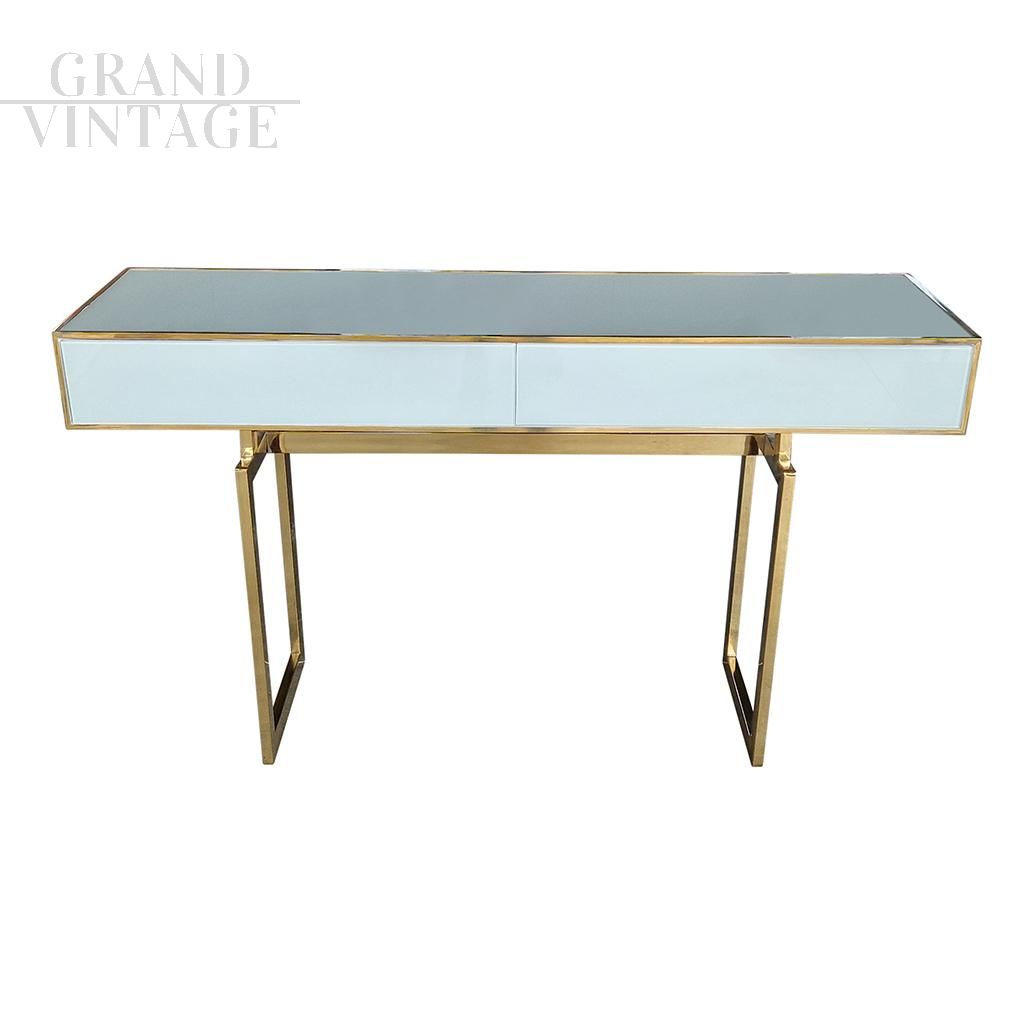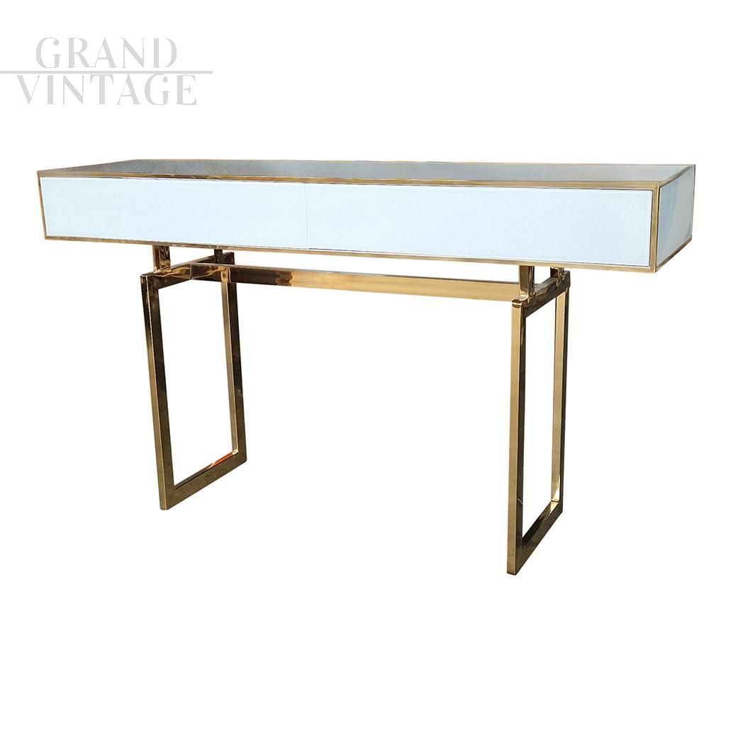 Design console in wood covered in white glass with golden brass profiles and golden steel structure, equipped with two comfortable drawers with push-pull opening, entirely handmade. Dimensions: width 141 cm, depth 39 cm, height 80.5 cm.