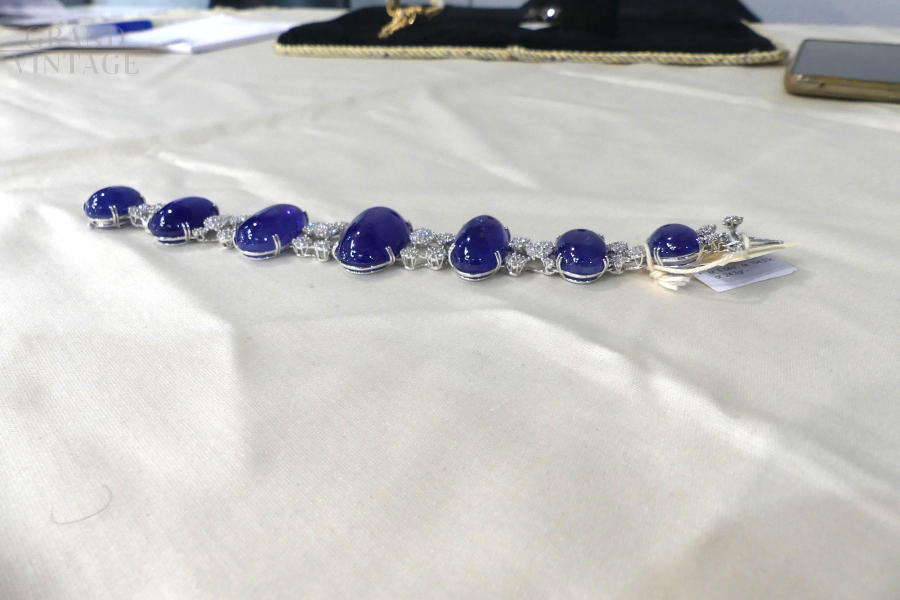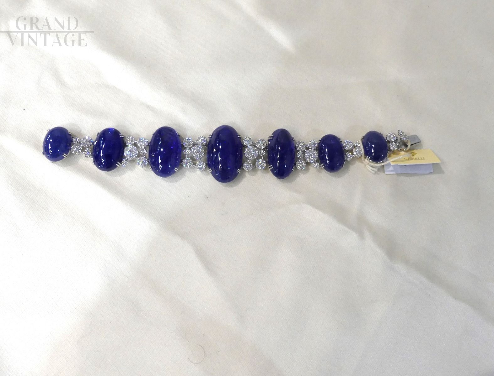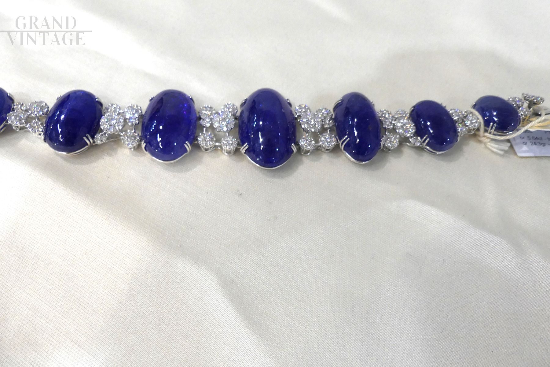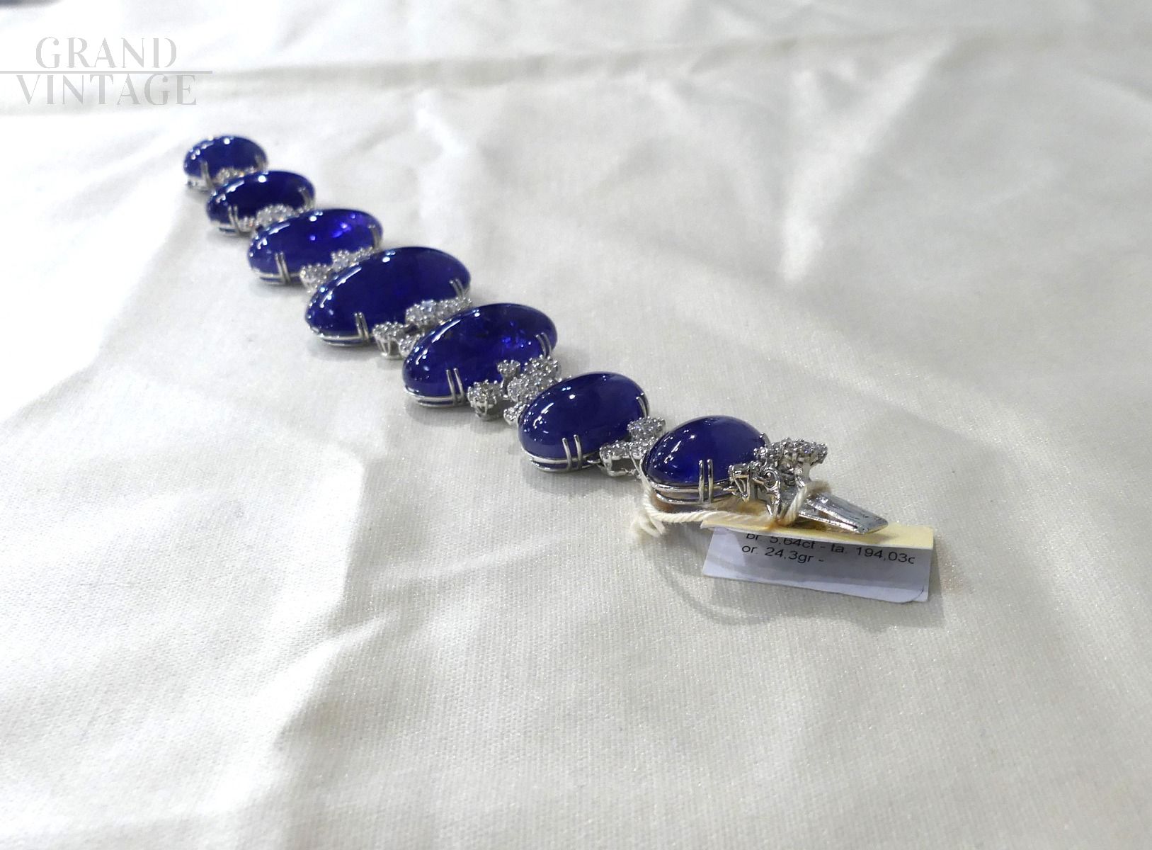 Beautiful vintage 1980s bracelet in 750 white gold, 18 kt, with 5 carat brilliant cut diamonds and 194.03 carat cabochon tanzanite. Gold weight 24.30 grams.