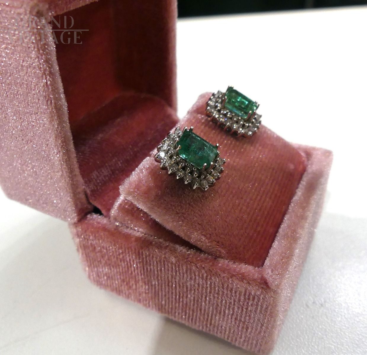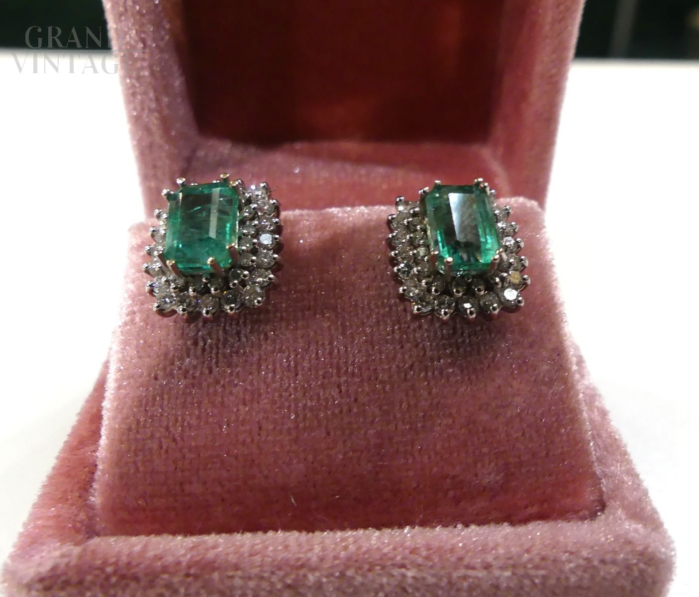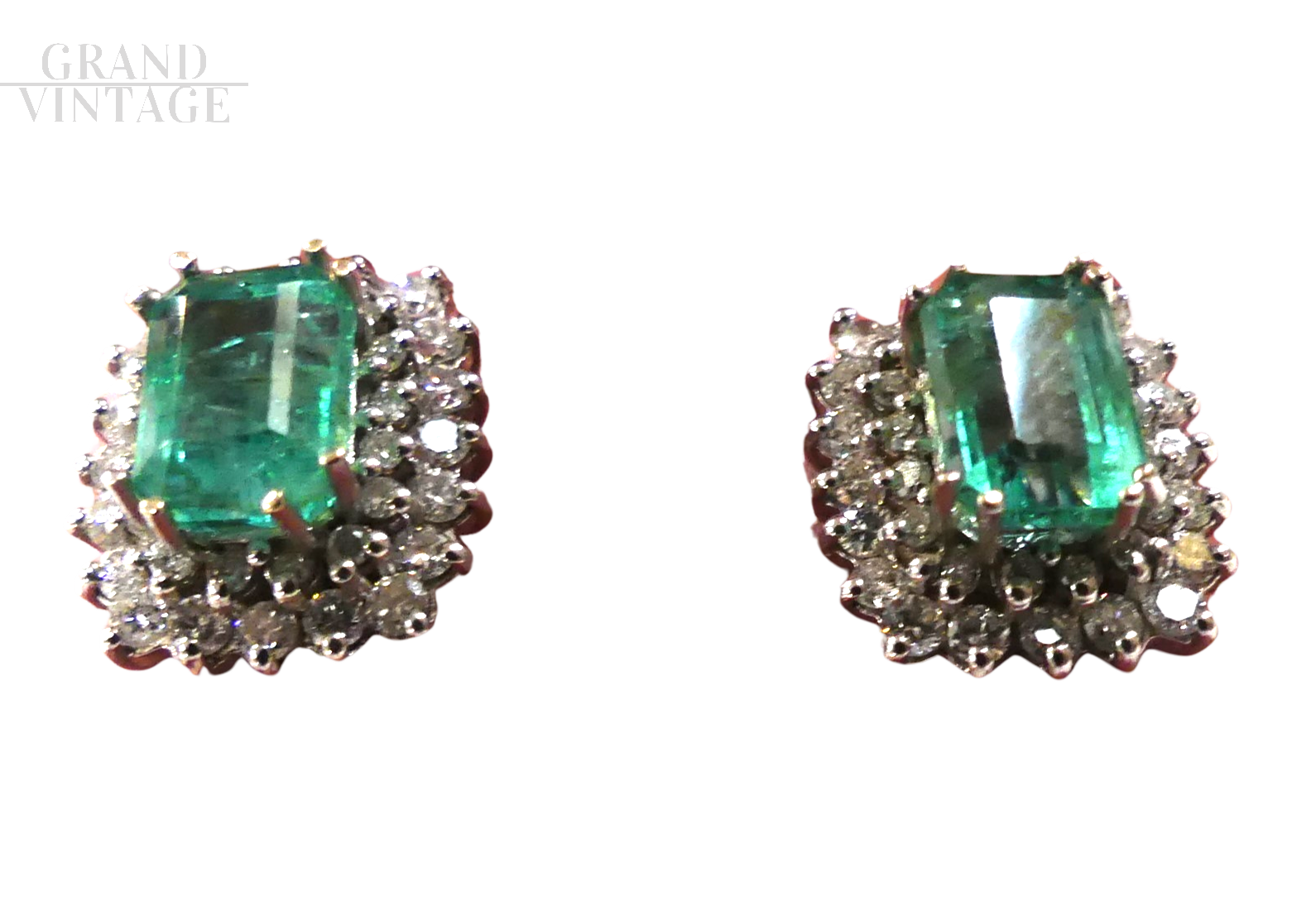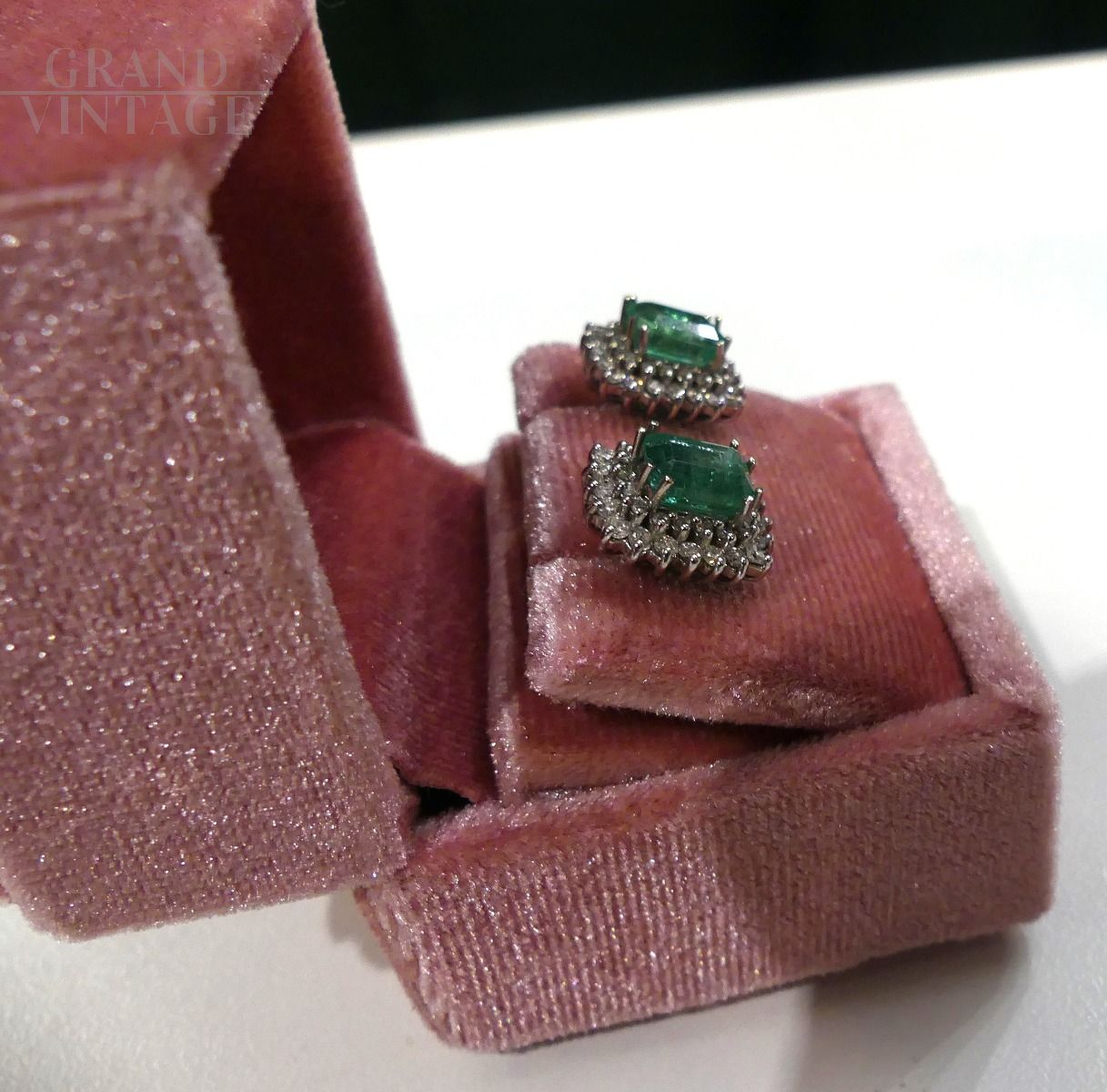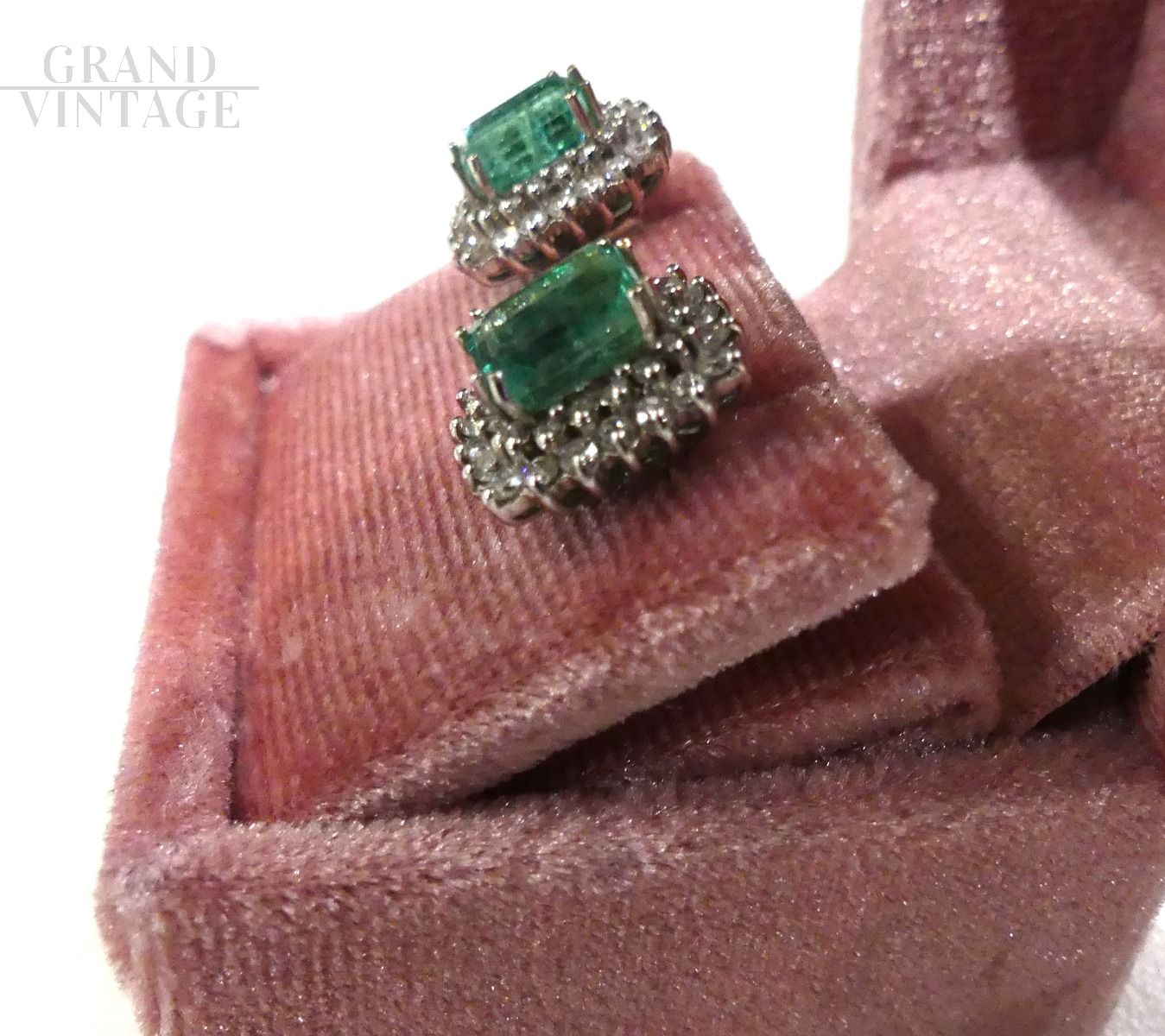 Earrings in 18 kt white gold with Colombian emeralds of 2.42 carats and diamonds of 0.85 carats, newly produced. Height 1 cm, width 0.8 cm.