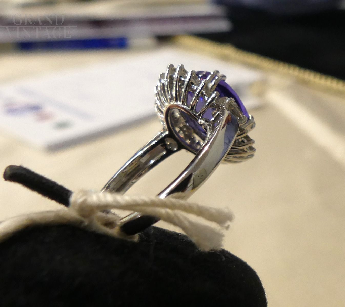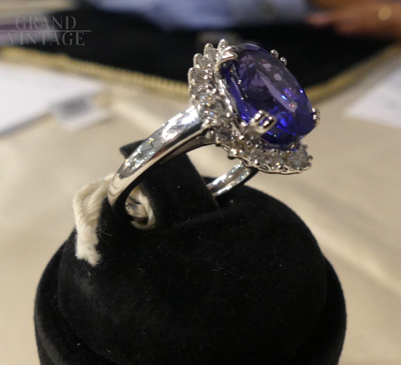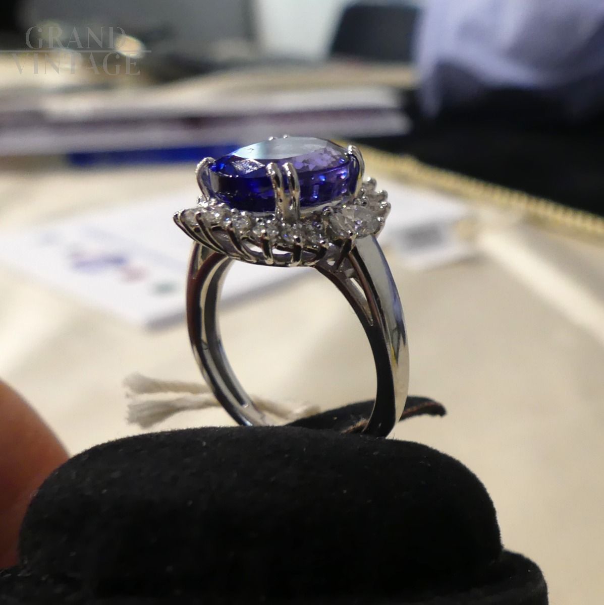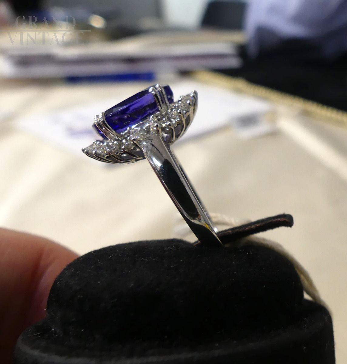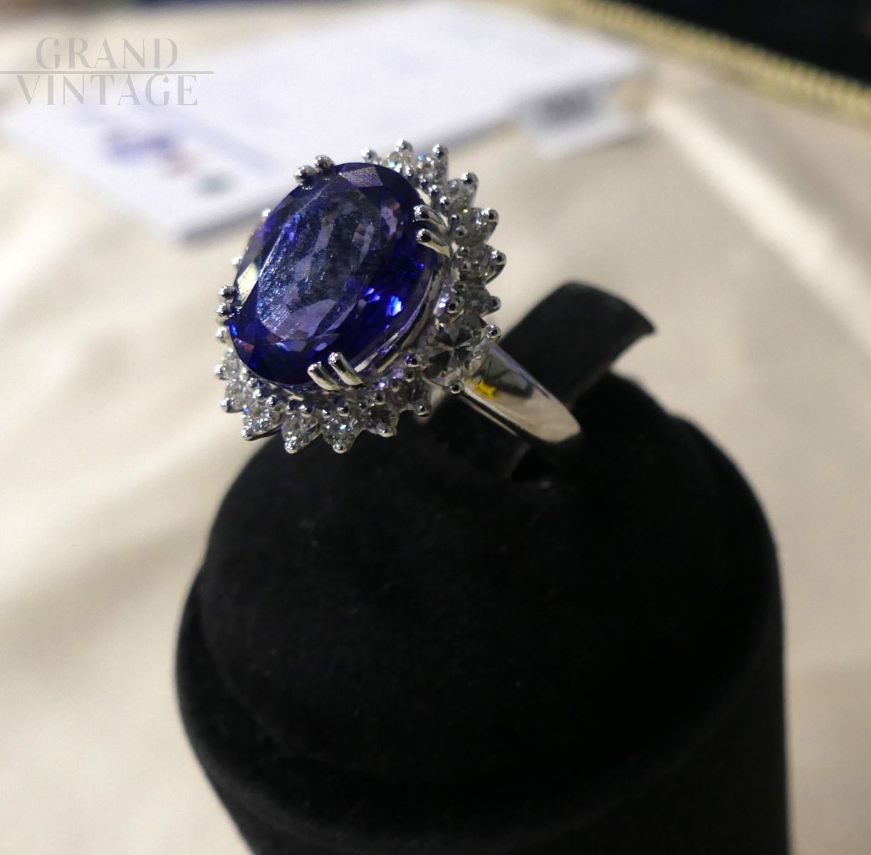 Vintage ring from the early 2000s in 18 kt white gold with diamonds of 0.38 carats, large central tanzanite of 0.60 carats and two oval diamonds of 0.37 carats. Gold weight: 4.90 grams. The ring is size 14, therefore it has a diameter of 1.72 cm.
