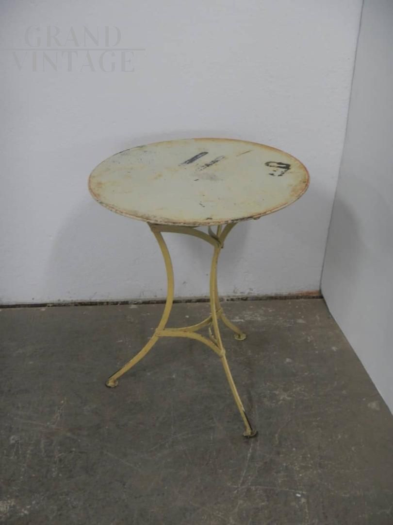 Vintage white lacquered iron garden table with round top, Italy 1940s, treated with iron paint while maintaining beautiful signs of use.