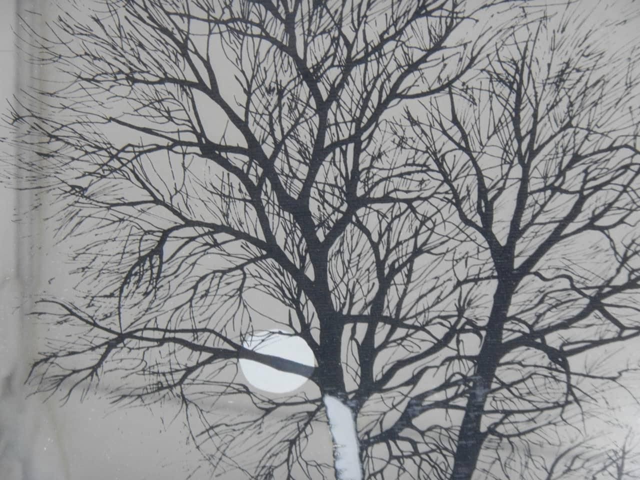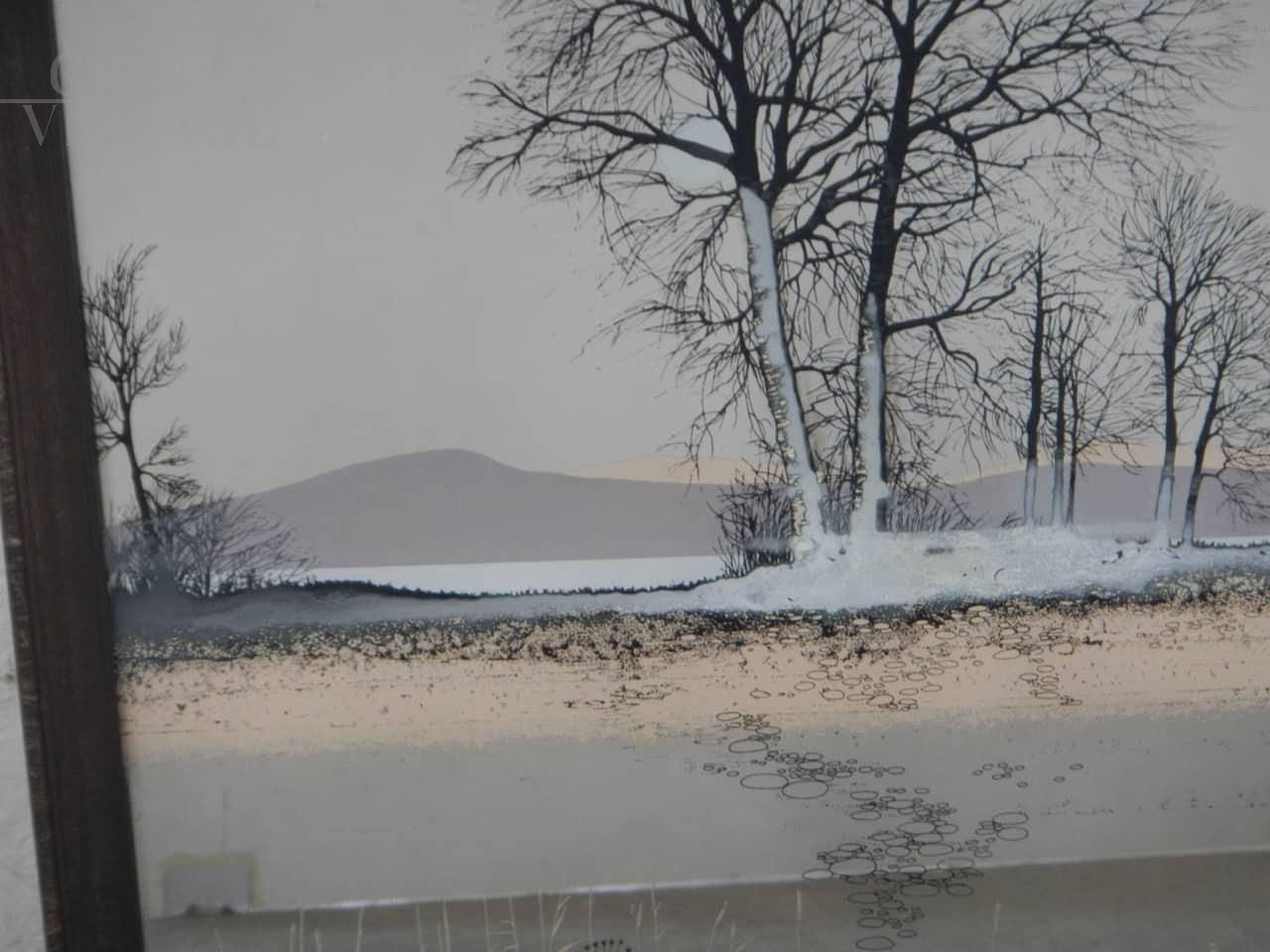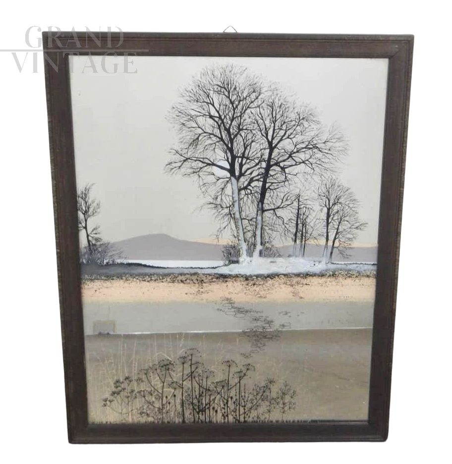Mirror designed by Saggers & Co. with printed winter landscape drawing, England 1978, with label bearing brand and title, complete with beech wood frame. In good condition, the back is made of compressed wood.