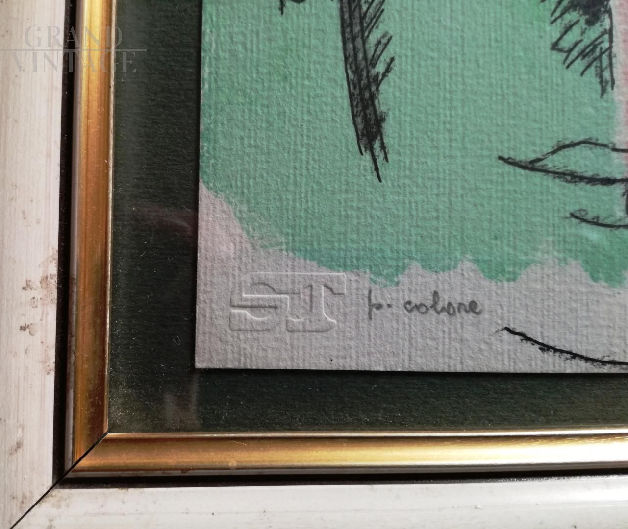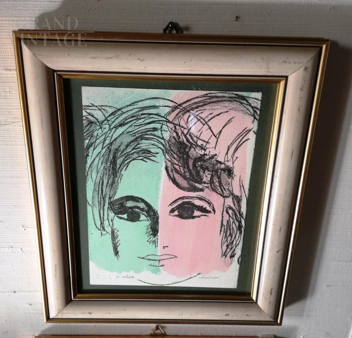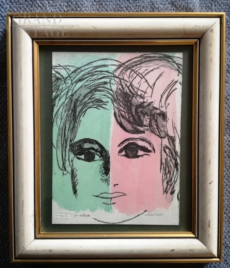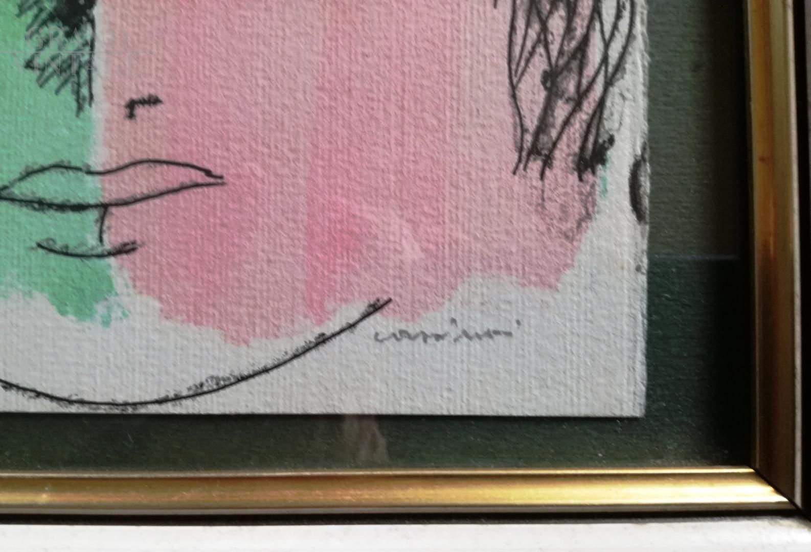 Color lithograph painting with a woman's face by Bruno Cassinari, color proof, on paper with ST logo and signed in pencil on the bottom right. Sold with frame.