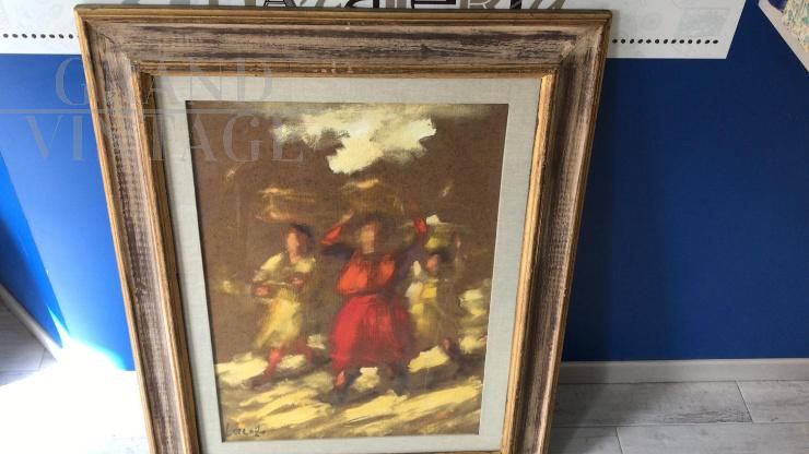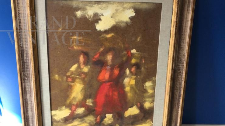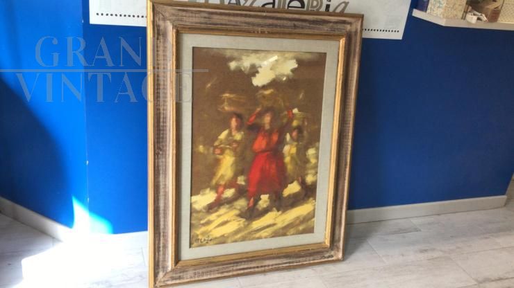 Oil painting on masonite by Maestro Albino Lorenzo entitled Women of Calabria, depicting scenes of rural life. On the back there is the artist's signature, title and stamp of the selling Gallery.