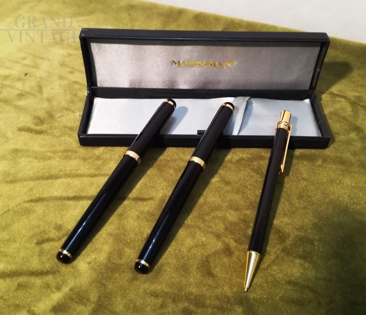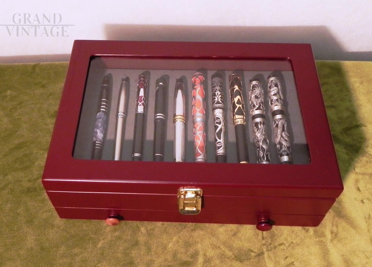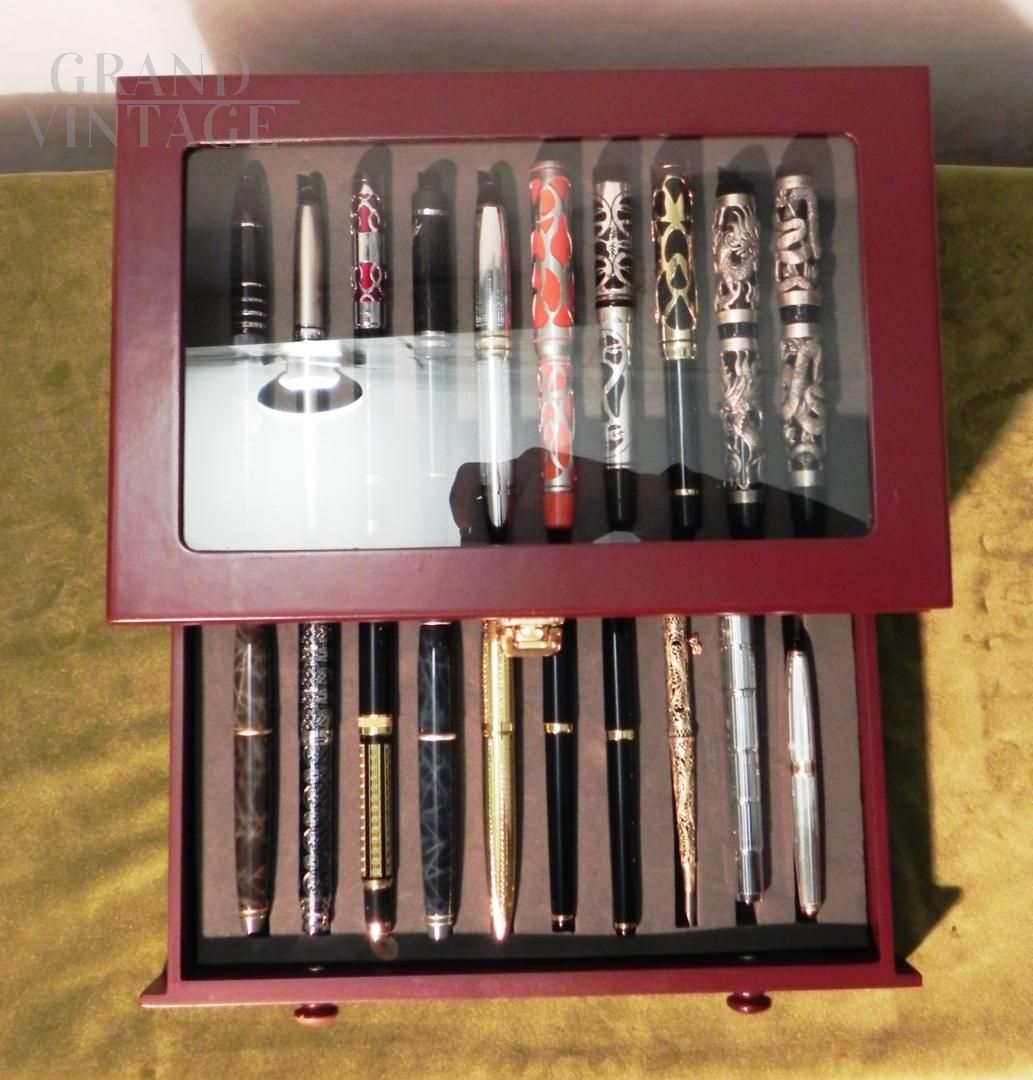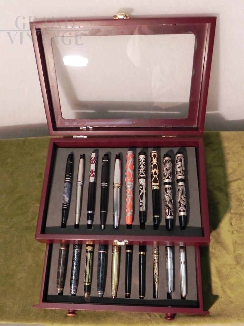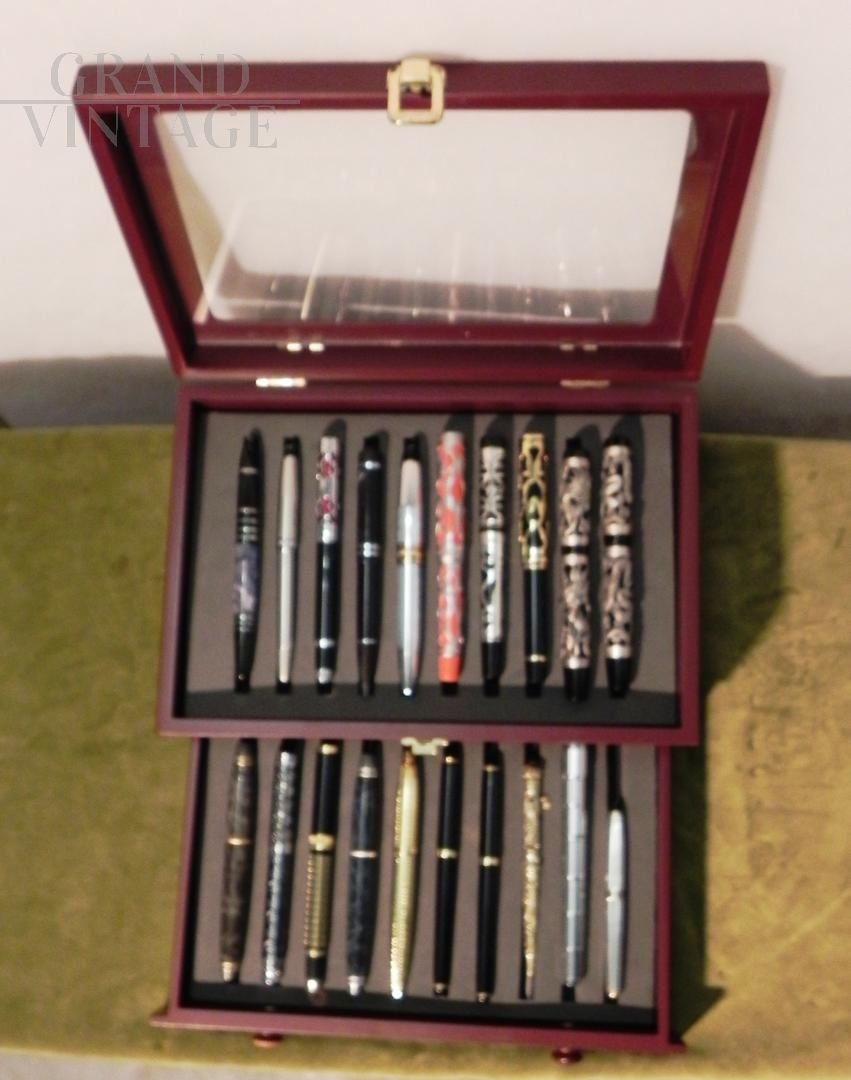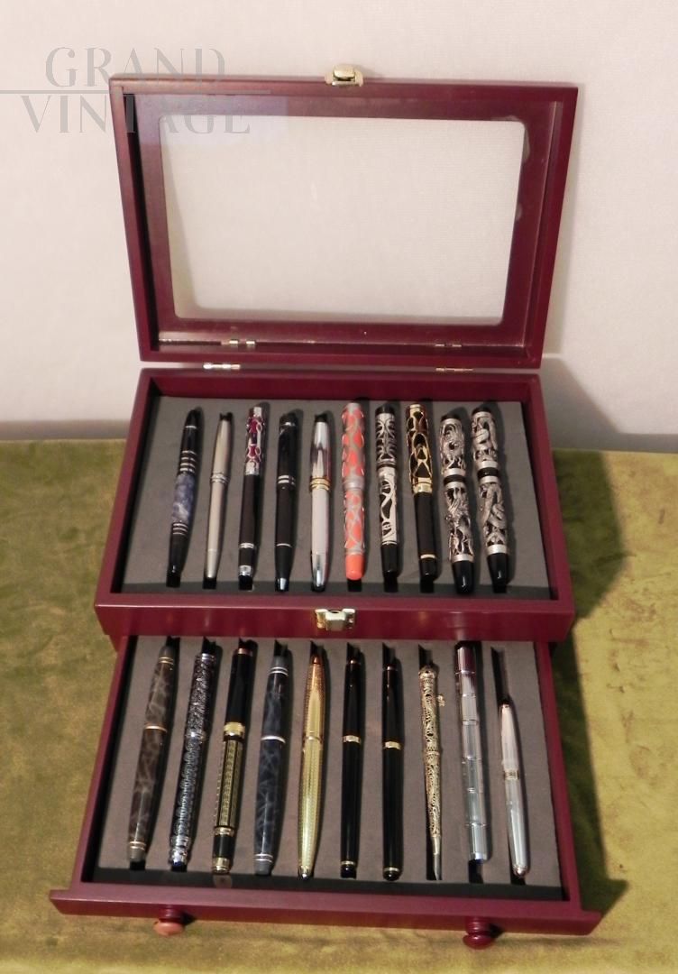 Vintage wooden pen box with collection of 20 mixed ballpoint and fountain pens. The pens are used but all in excellent condition, all clearly visible in the attached photos, and have various brands and various styles.