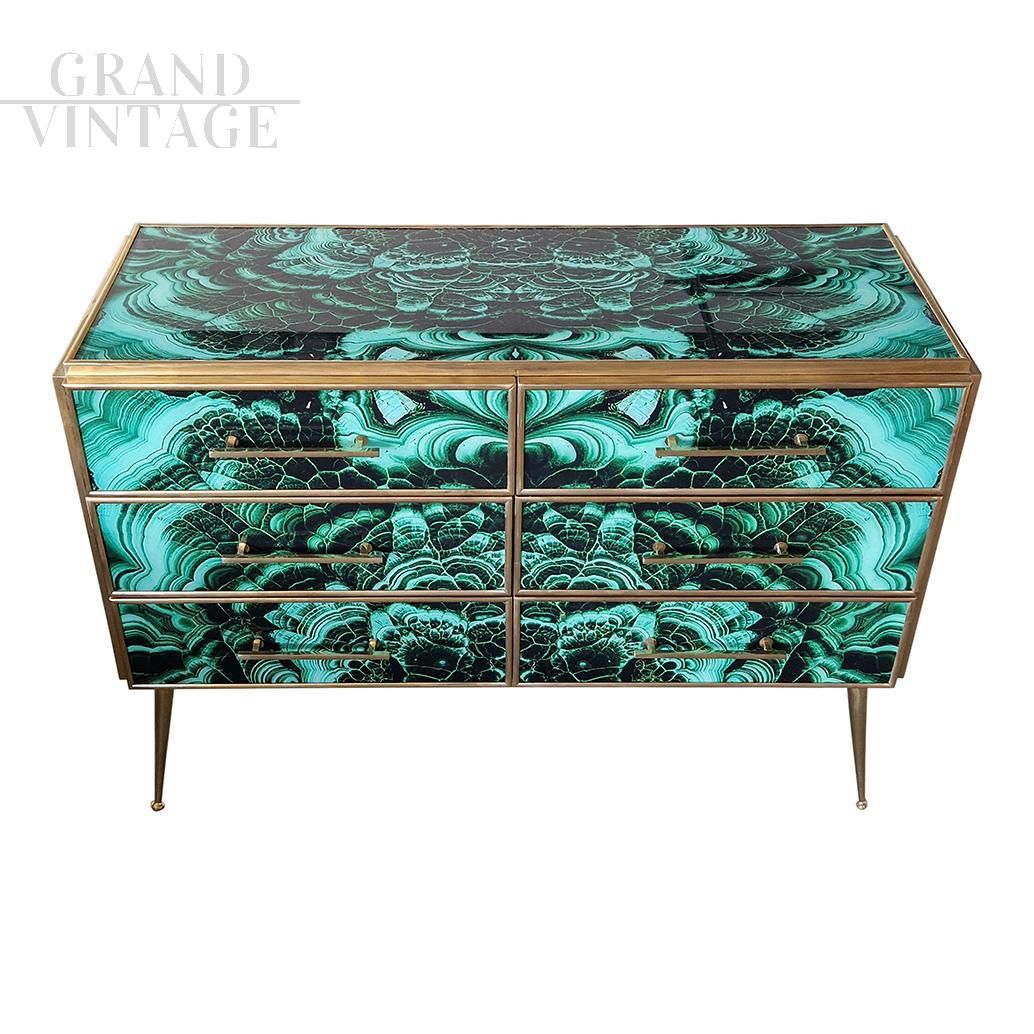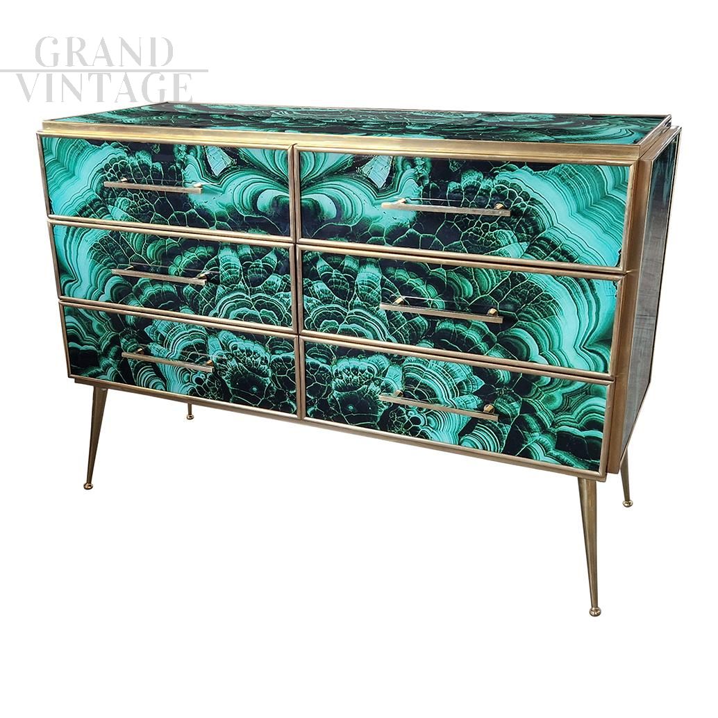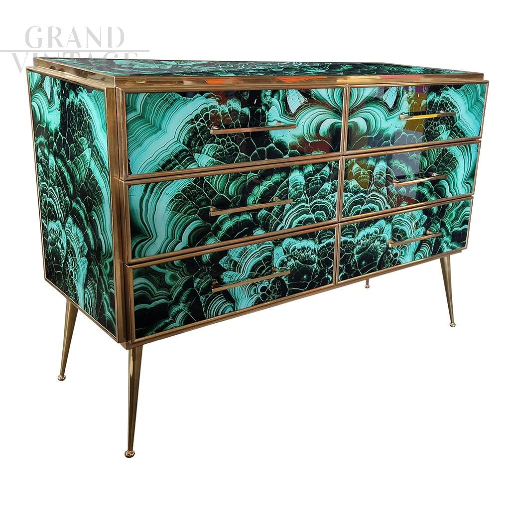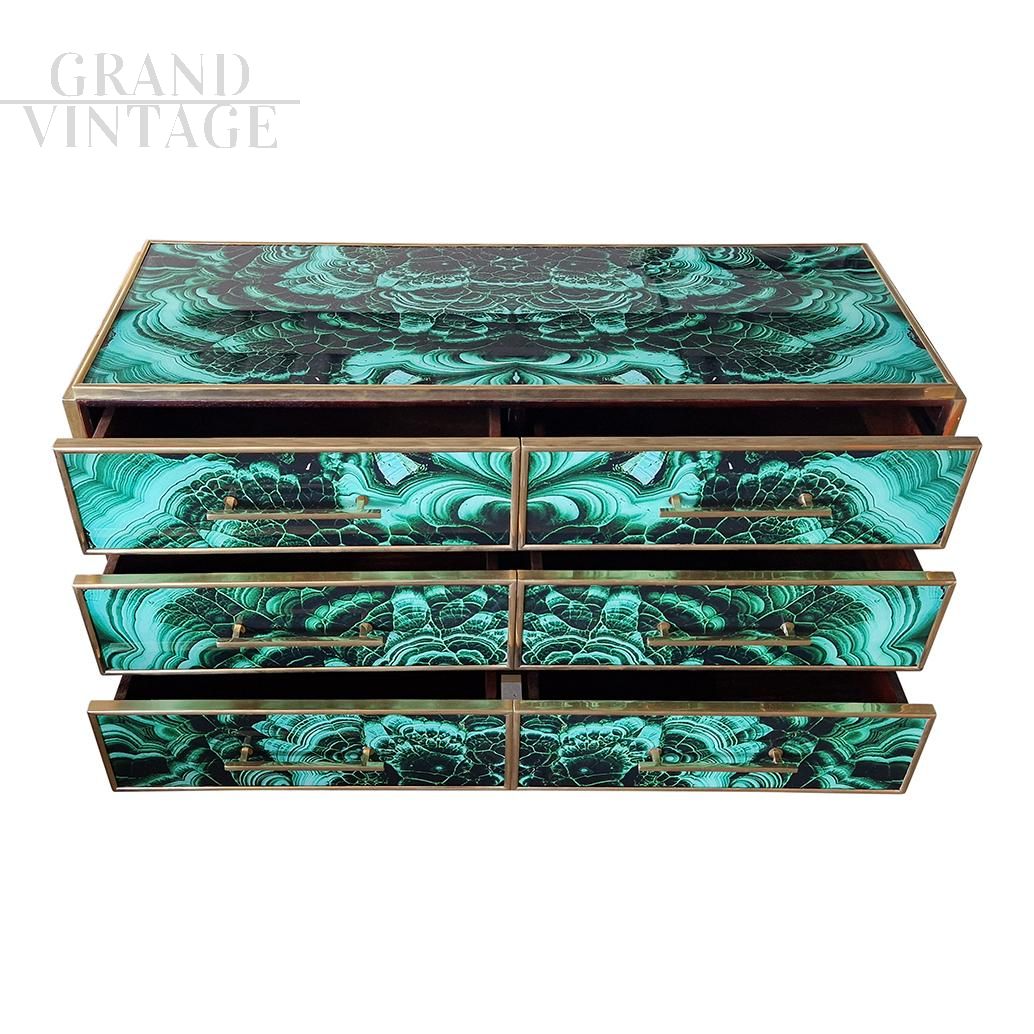 Luxury design chest of drawers in wood covered in green and black malachite effect glass, equipped with six drawers, with handle profiles and brass legs.