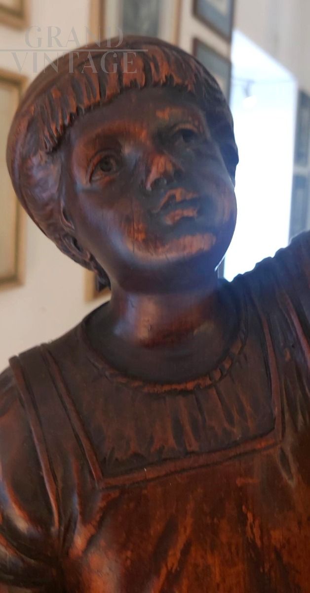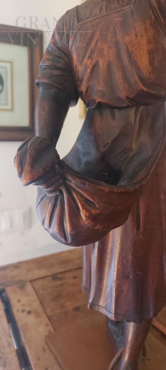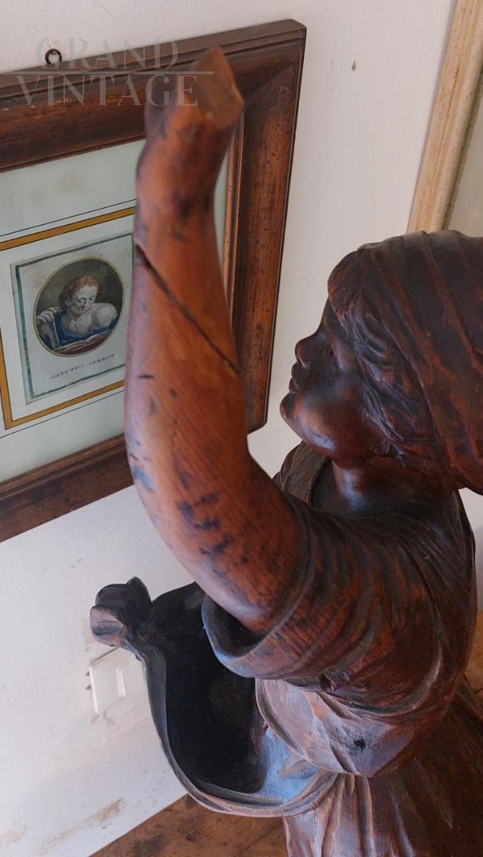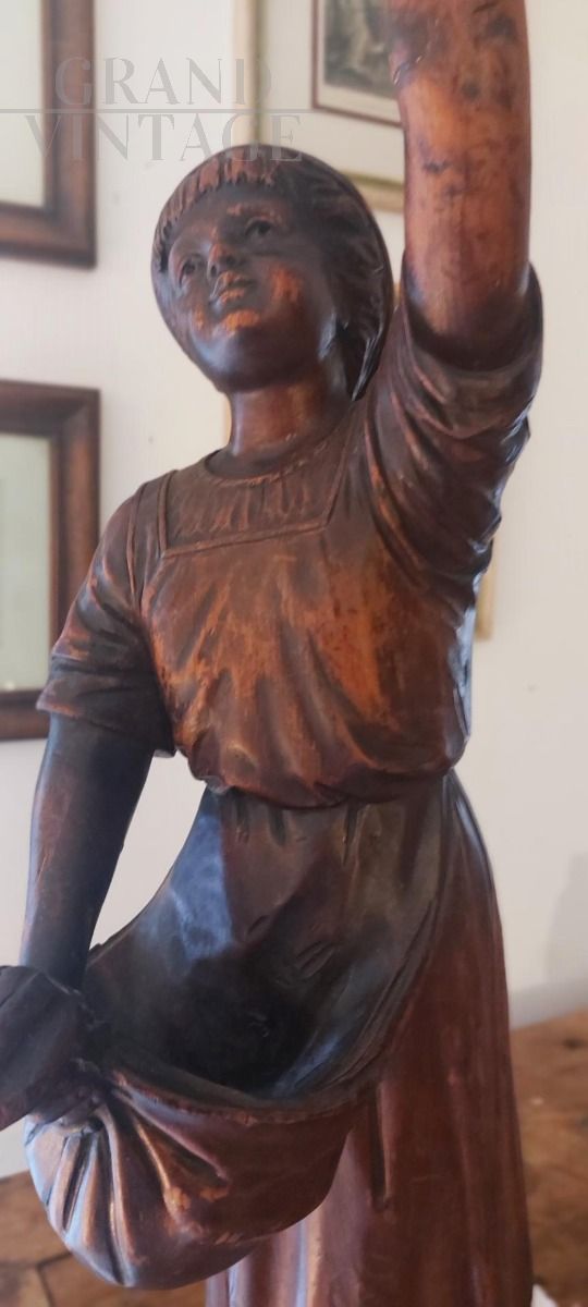Sculpture in pine wood depicting a woman picking olives placed on a metal base from a later period. Only flaw: a hand without fingers, as shown in the photo.