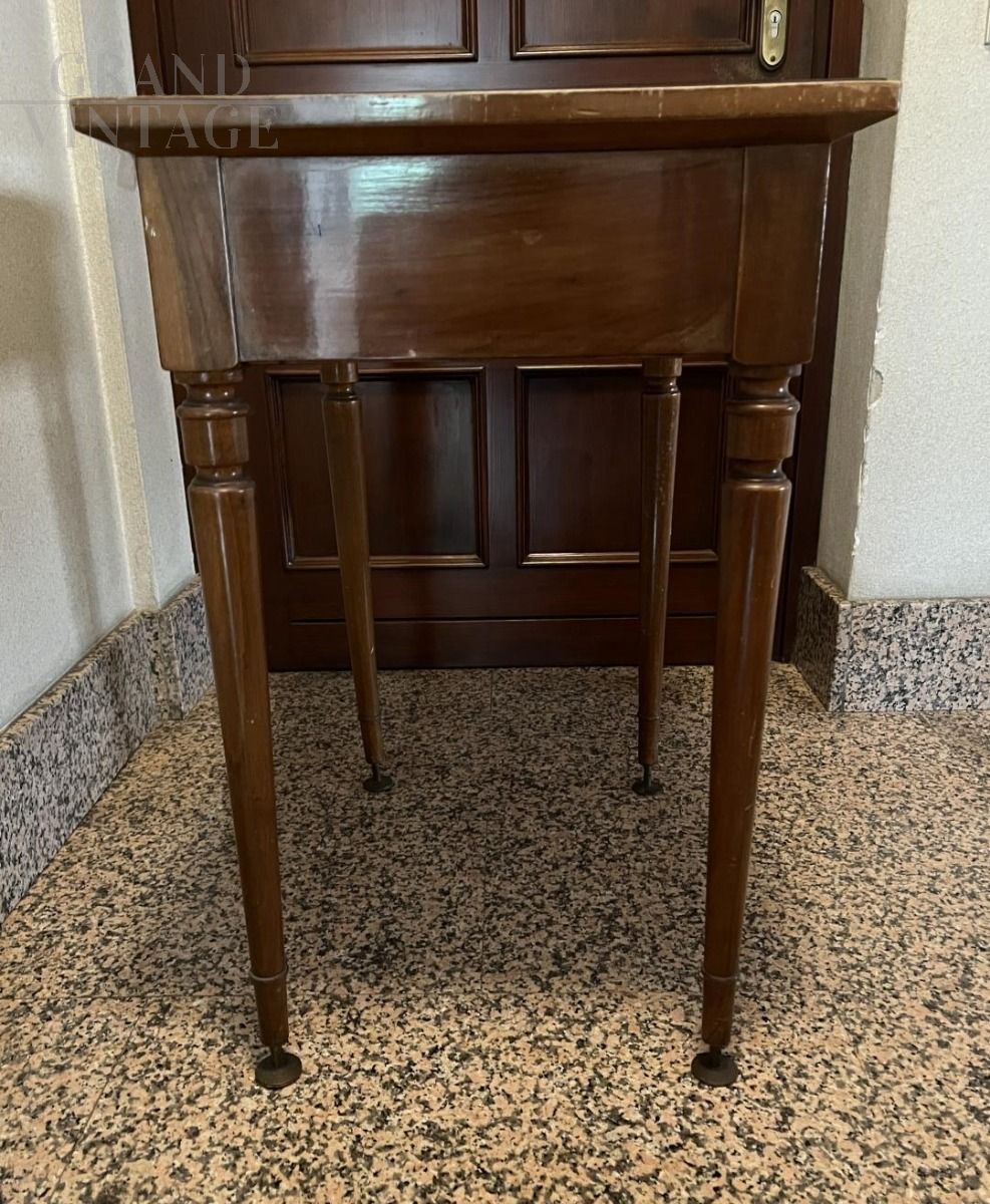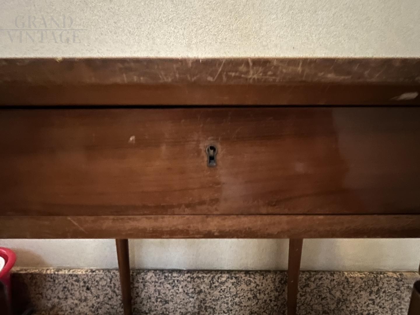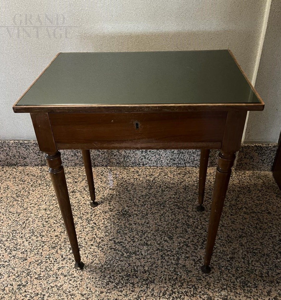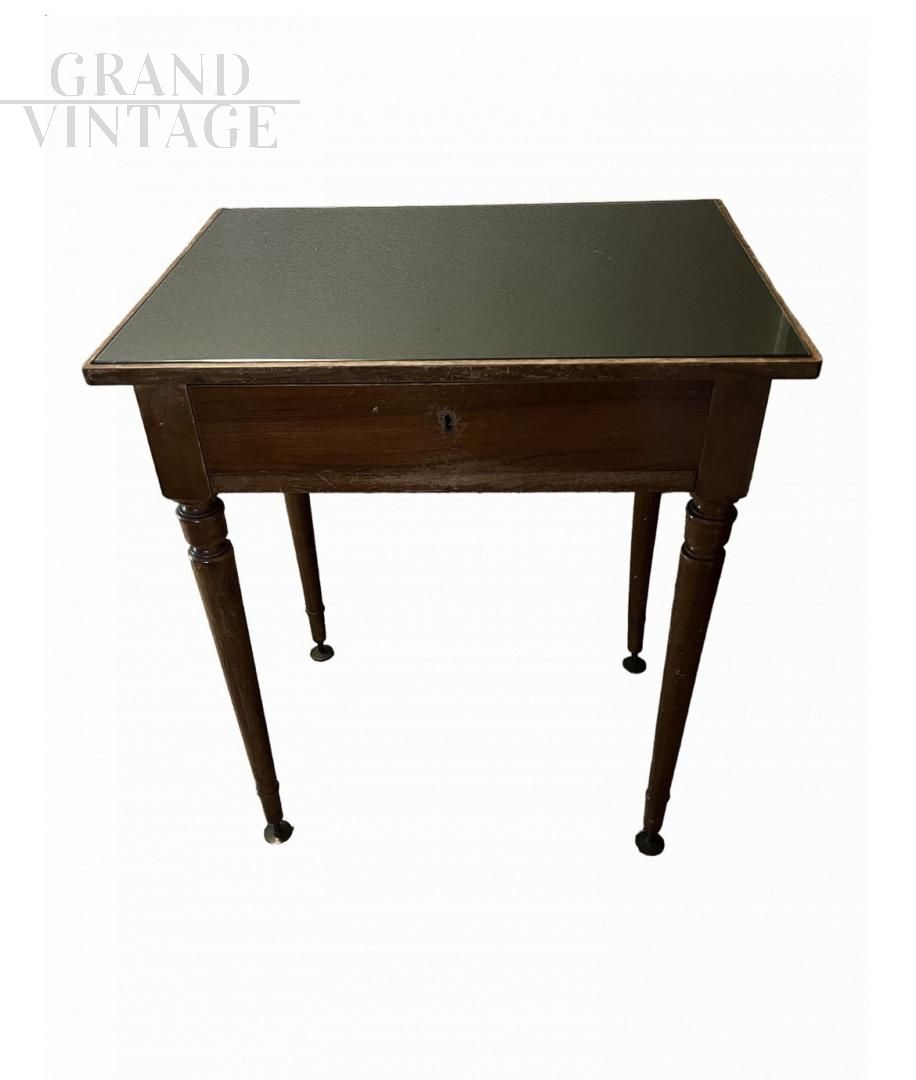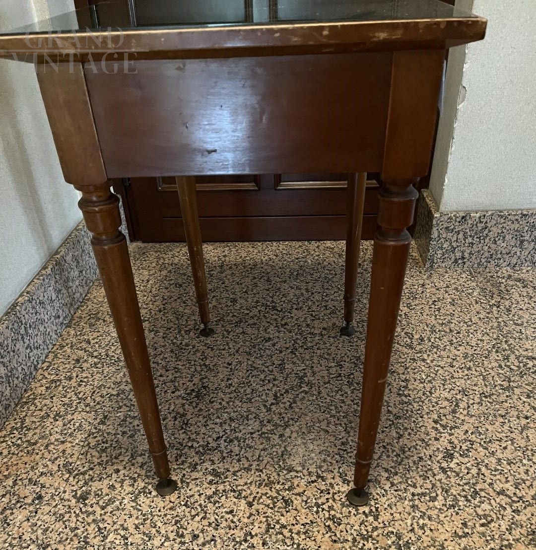Vintage coffee table in dark wood with glass top and drawer, made in Italy, Lombardy. The table has a drawer under the top, which can be opened perfectly. The top is supported by four legs, the base of which was raised and subsequently modified with the addition of metal feet.