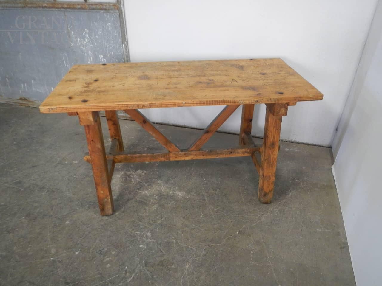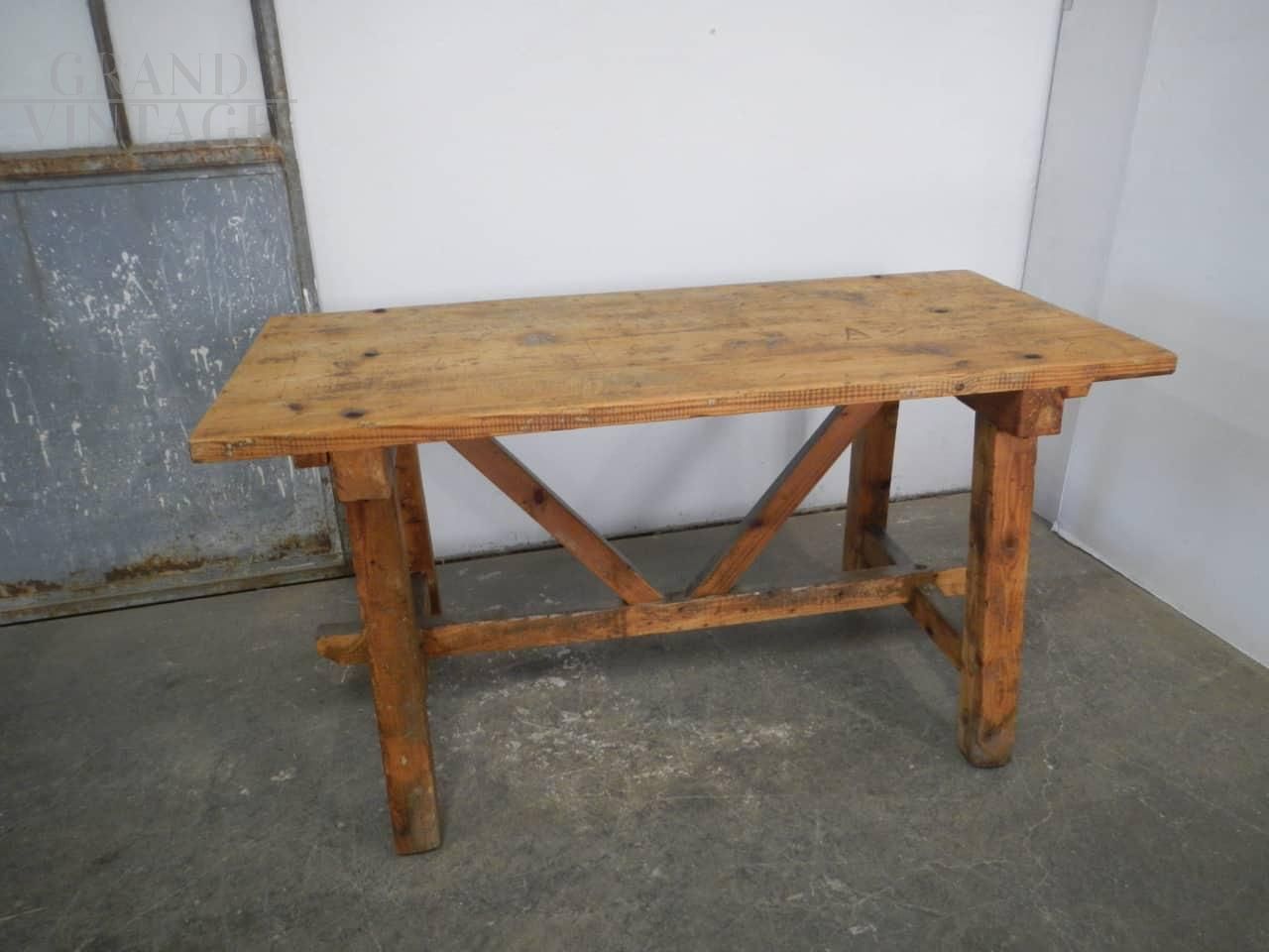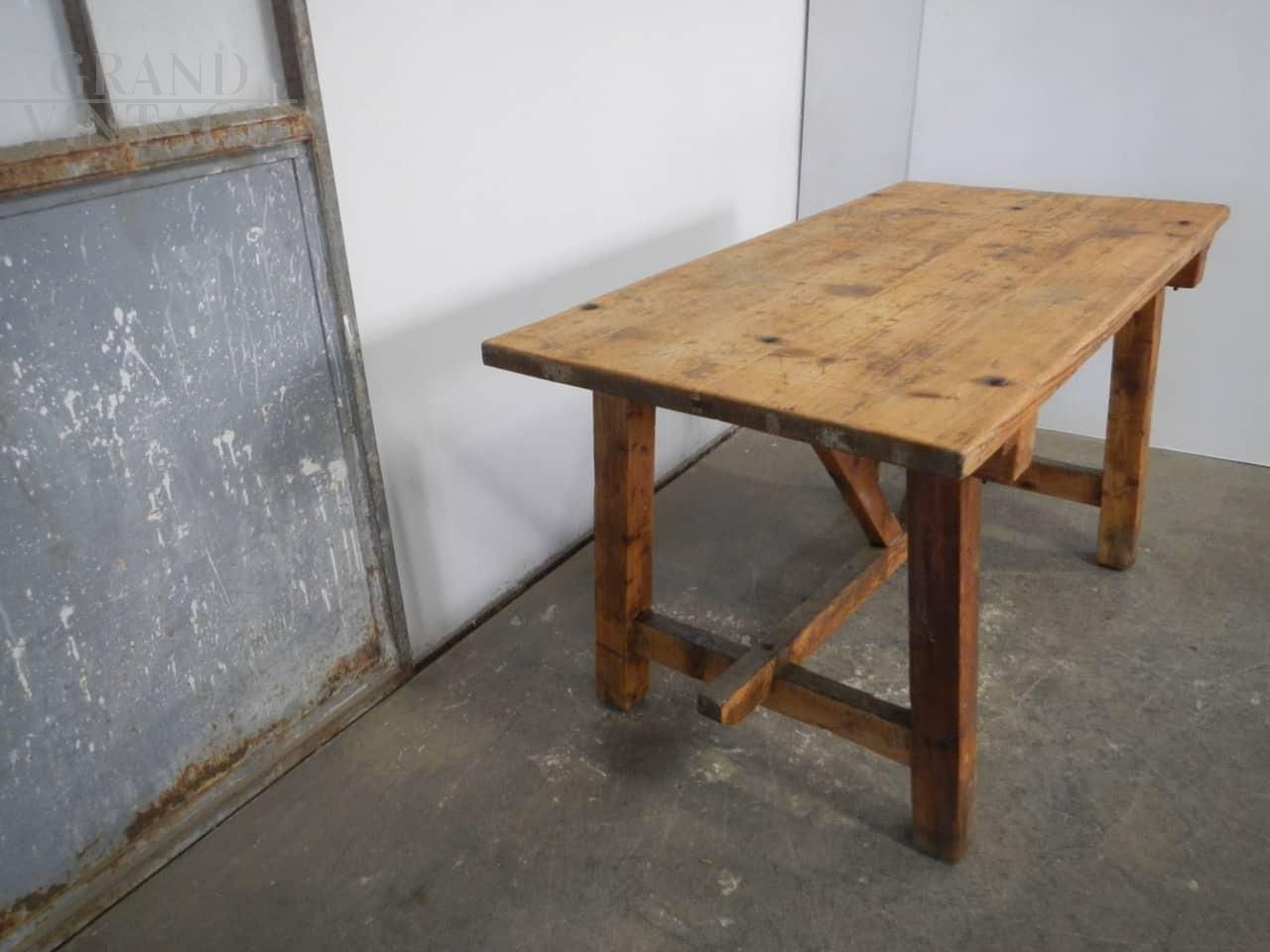 Rustic workbench table in fir wood from the 1940s, cleaned and treated with natural wax. In good condition.