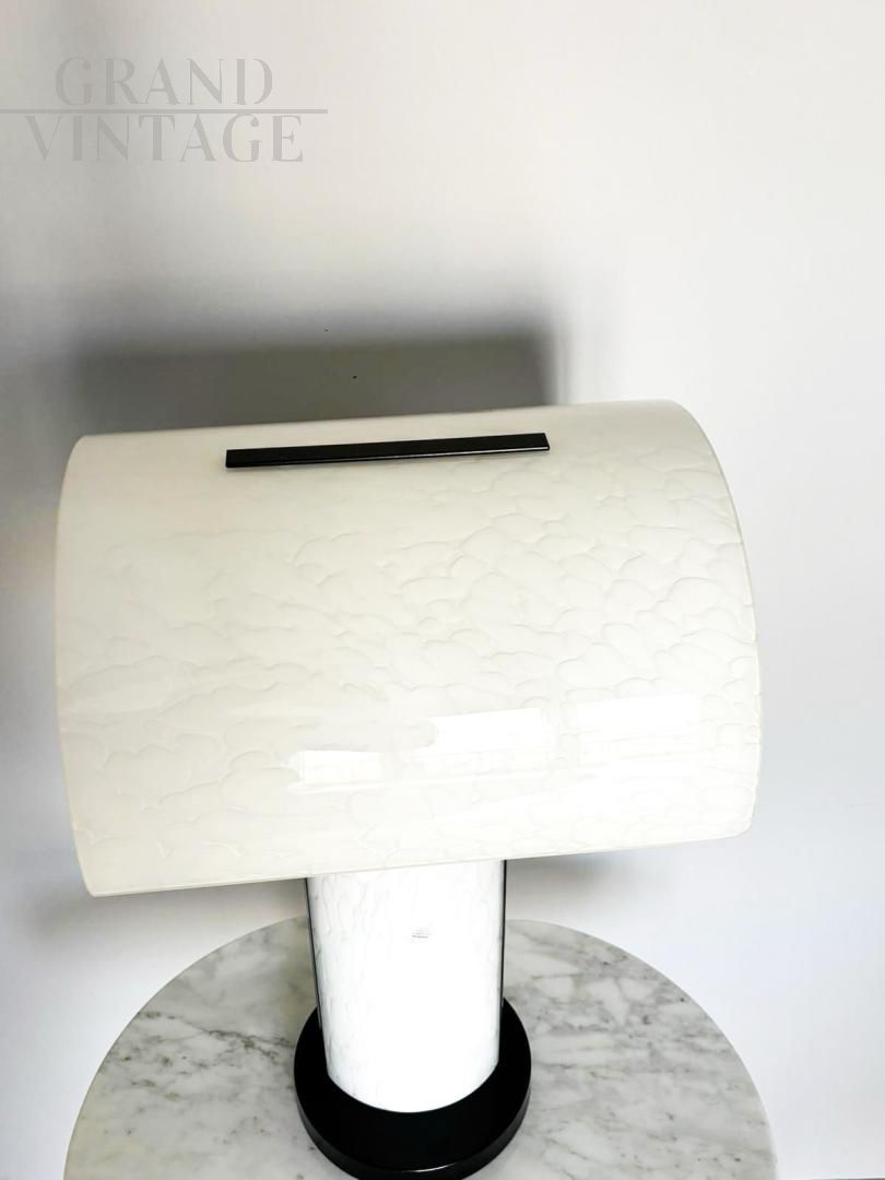 Design table lamp in Murano glass by Zonca, Italy from the 1980s, with a modern line, entirely made of white Murano glass. The interpretations of the manufacturing drawings can be different: depending on the imagination they can be new, stones, abstract drawings. The lamp stands on a black lacquered metal base. In excellent condition.