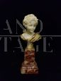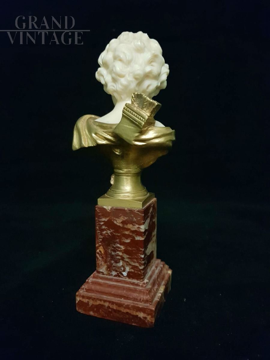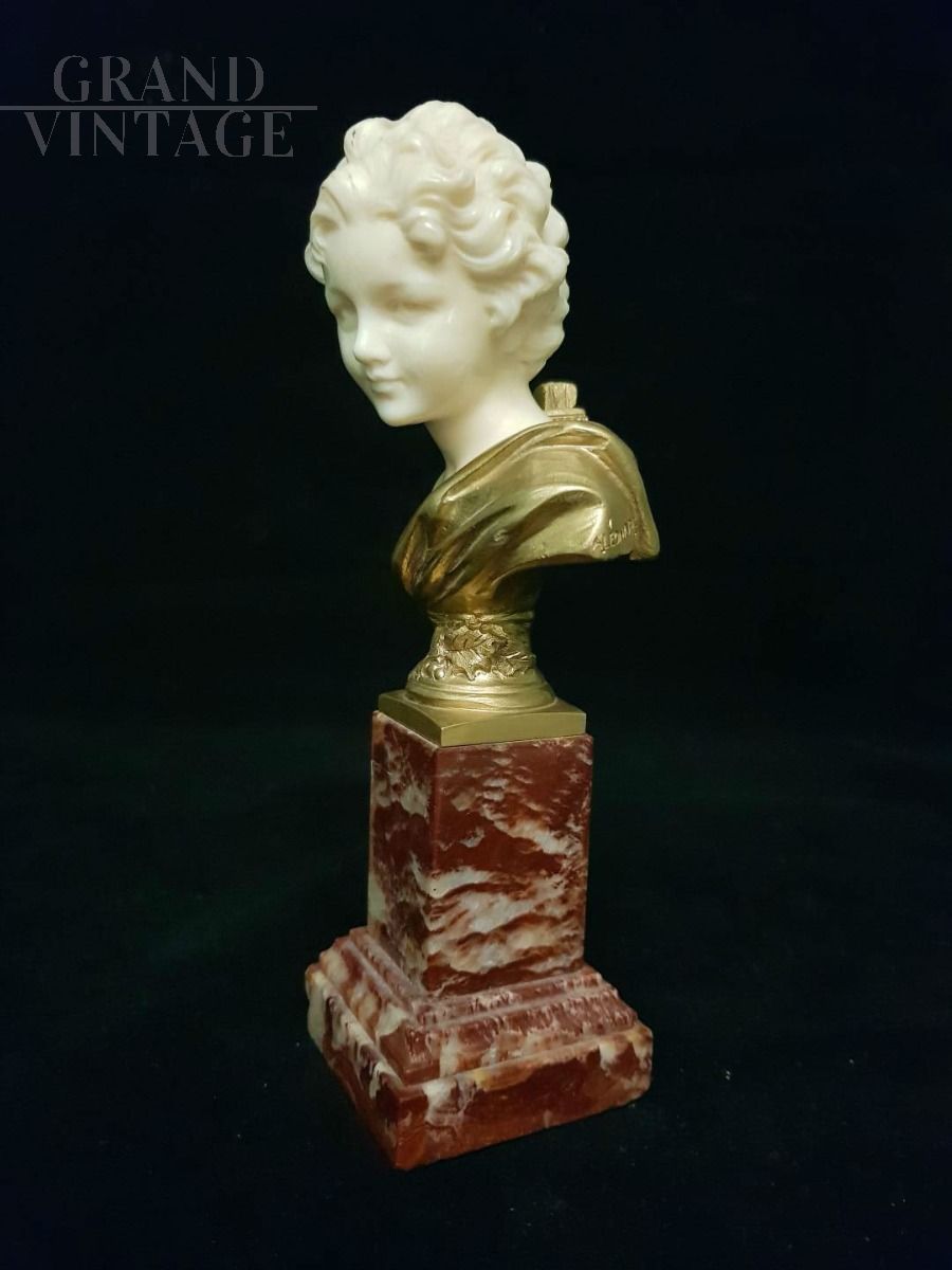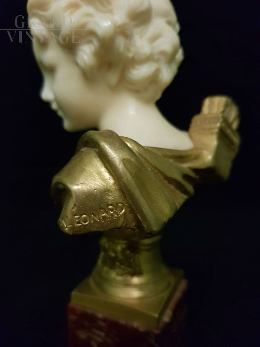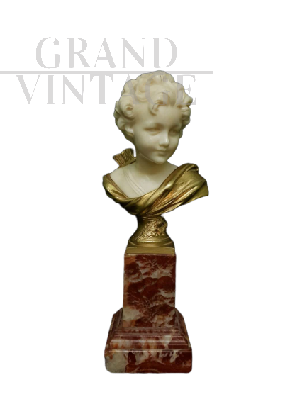Agathon Leonard, Francia, (1910 circa): raffinata scultura crisoelefantina rappresentante testa di fanciullo in bronzo dorato e avorio, su base in marmo.
