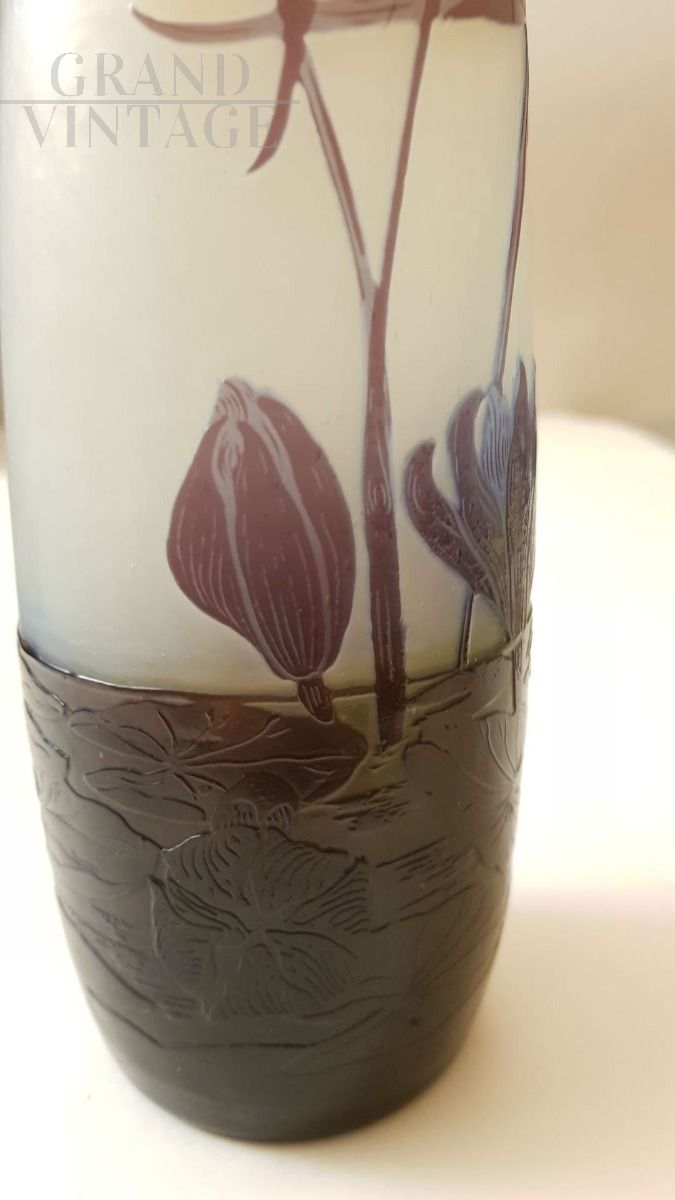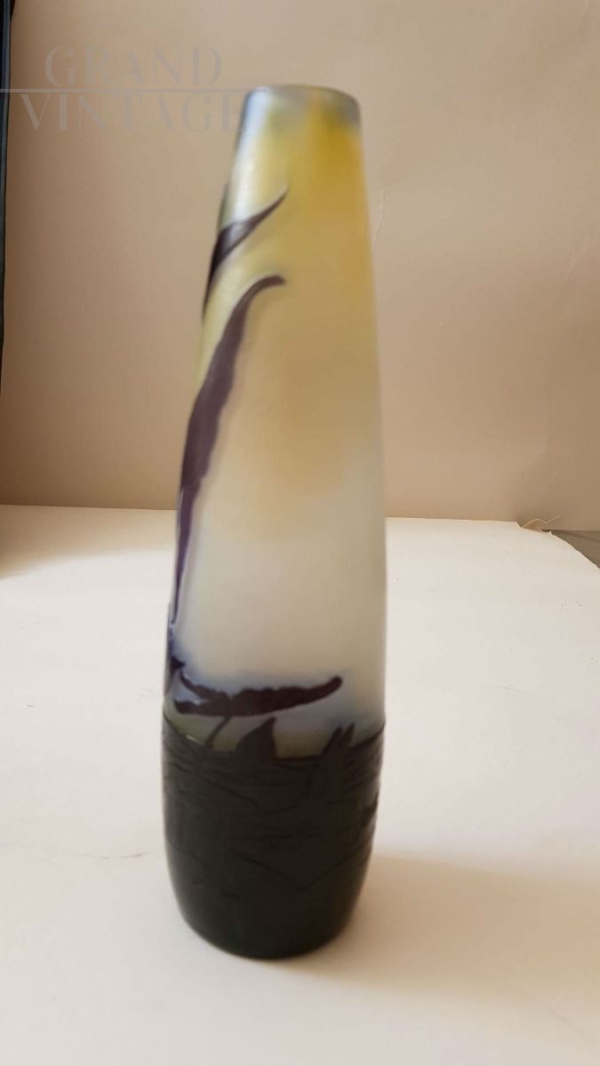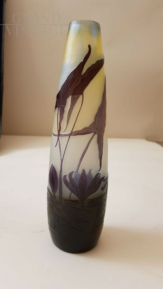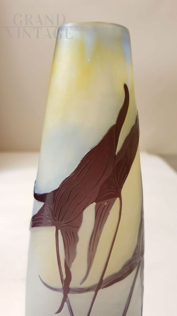 Gallé- Francia- 1930: vaso in vetro multistrato con decorazione floreale