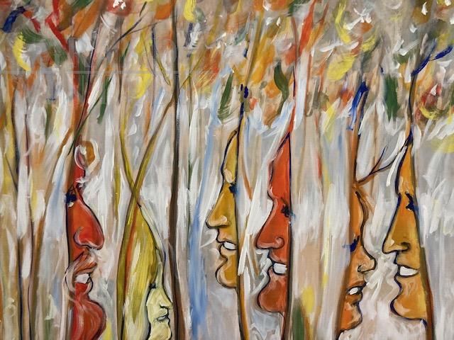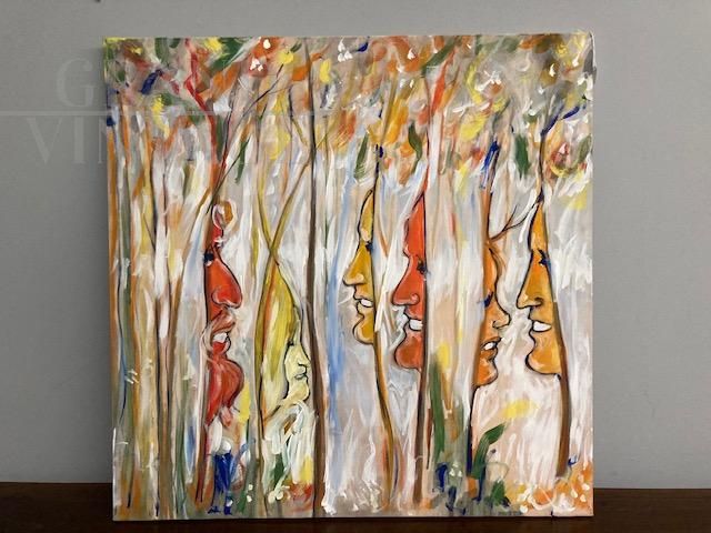 Dipinto di arte contemporanea di Antonio Celaia in smalti policromi su tela raffigurante volti e natura, firmato sul retro e datato 1980.