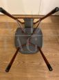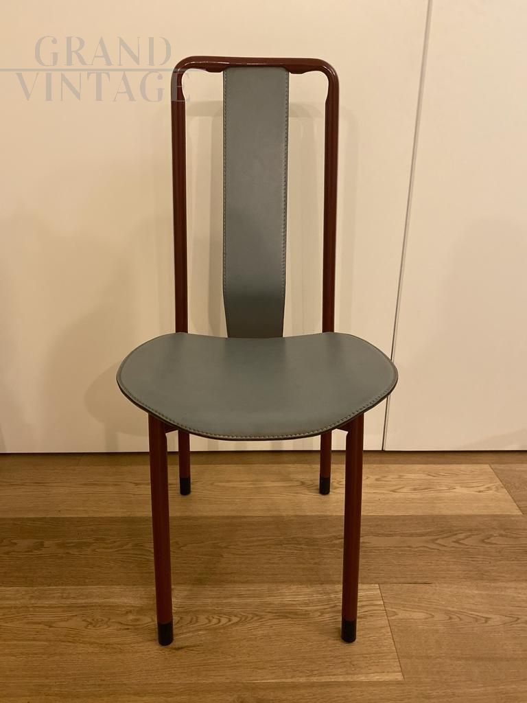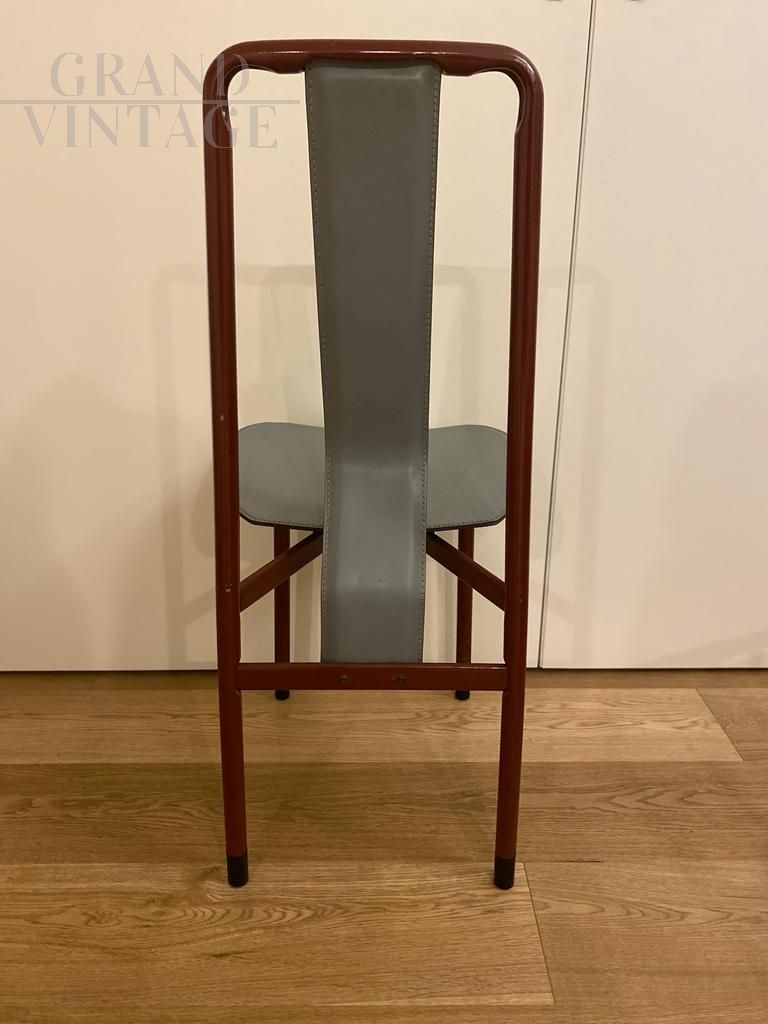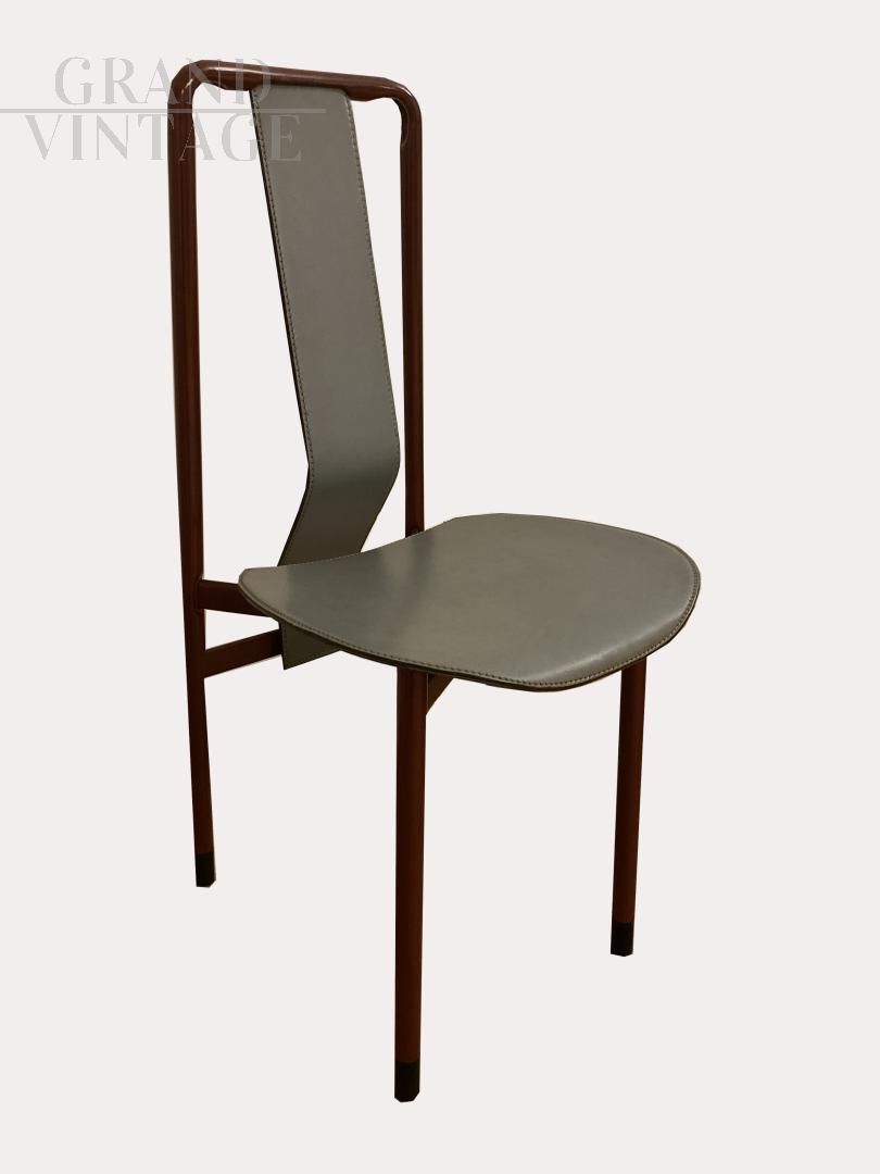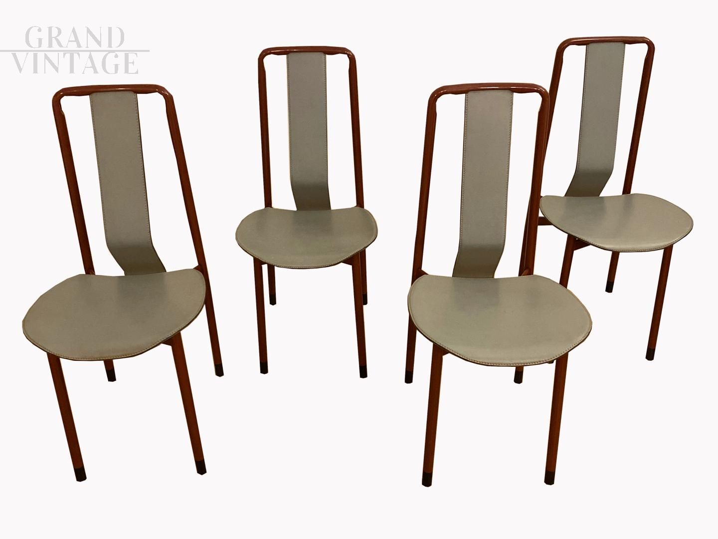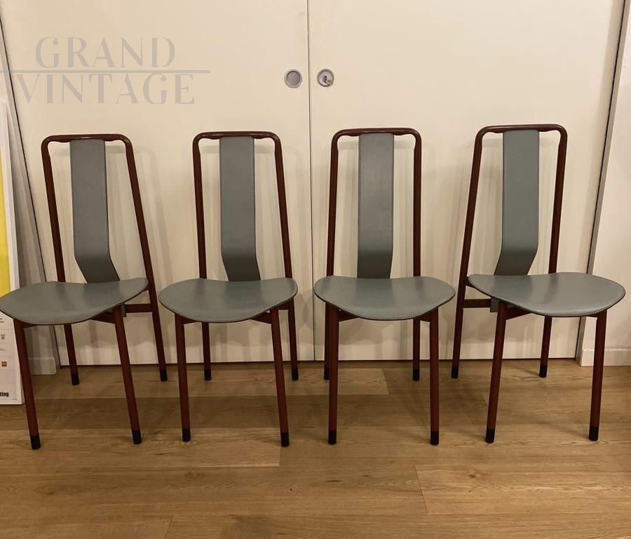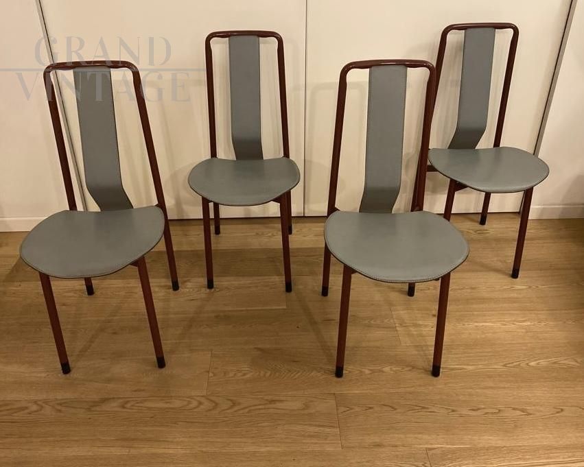 Set di 4 sedie modello Irma del designer Achille Castiglioni e prodotte da Zanotta, Italia 1979. La struttura della sedia è un tubo di acciaio del diametro di 25 mm laccato bordeaux, lo schienale e il sedile sono in cuoio color grigio. La forma è studiata rigida, obbligando ad una postura corretta del corpo durante i pasti. É uno dei pochi progetti realizzato da Castiglioni e dedicato alla moglie Irma. Le sedie sono in buone condizioni, usate poco, presentano i classici segni del tempo.