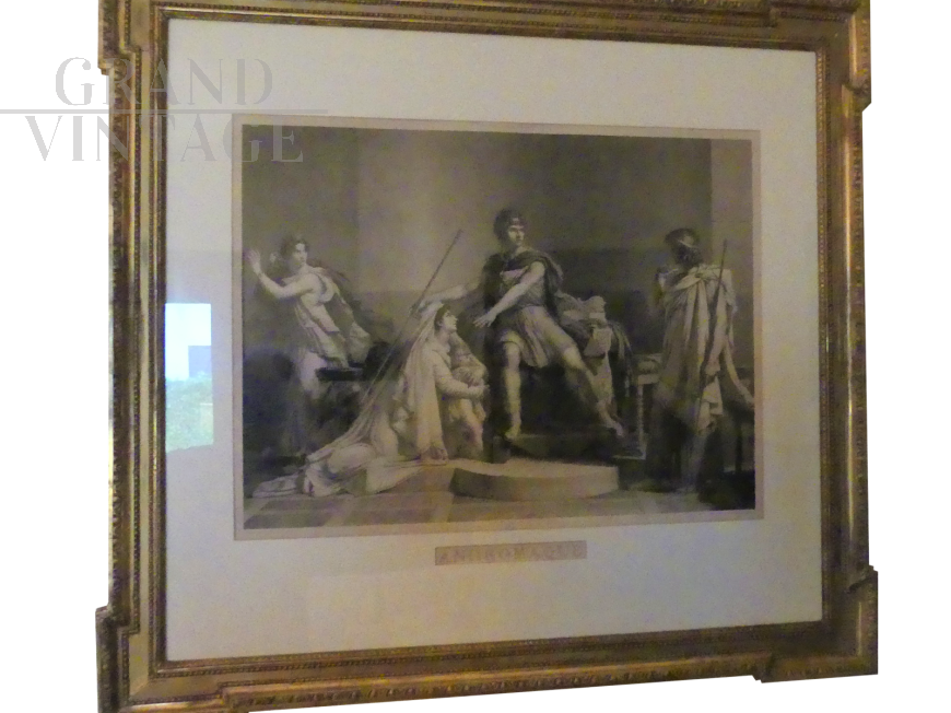 Acquaforte antica raffigurante l'incontro tra Andromaca e Pirro, tratto dall'opera di Pierre-Narcisse Guerin, completa di cornice dorata. Sulla parte bassa reca la scritta Andromaque.