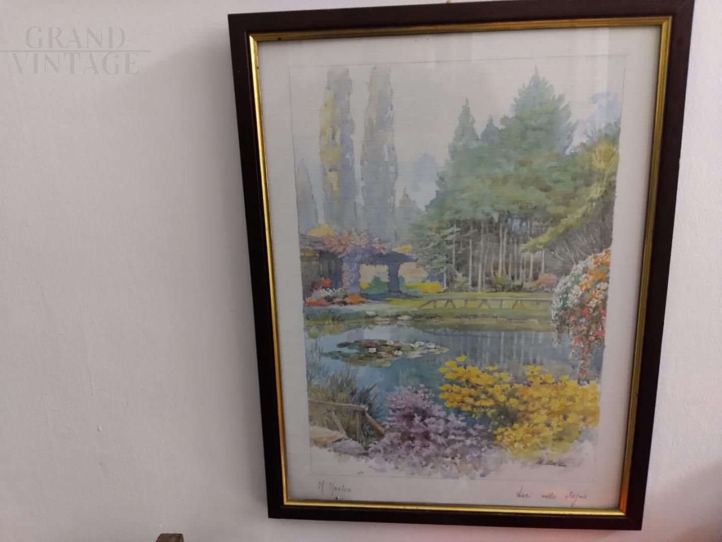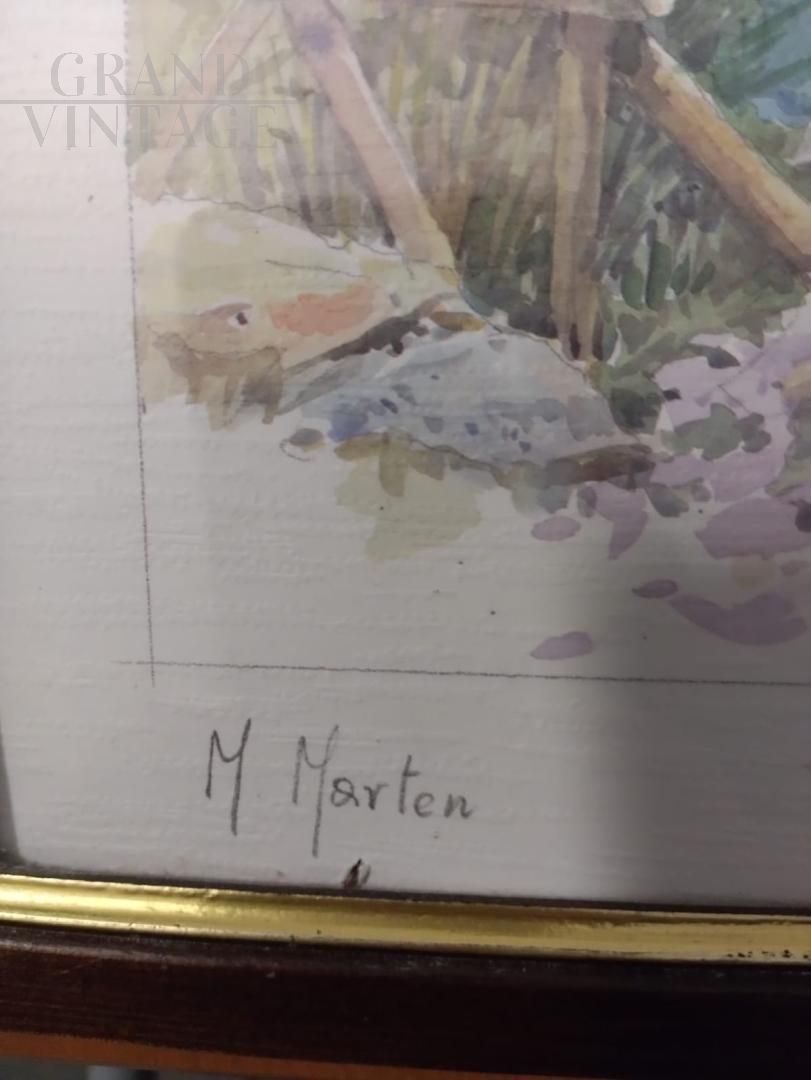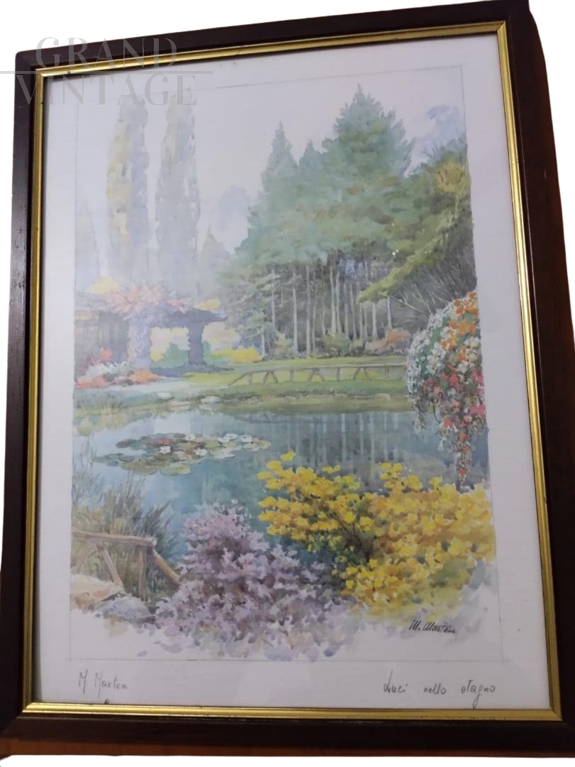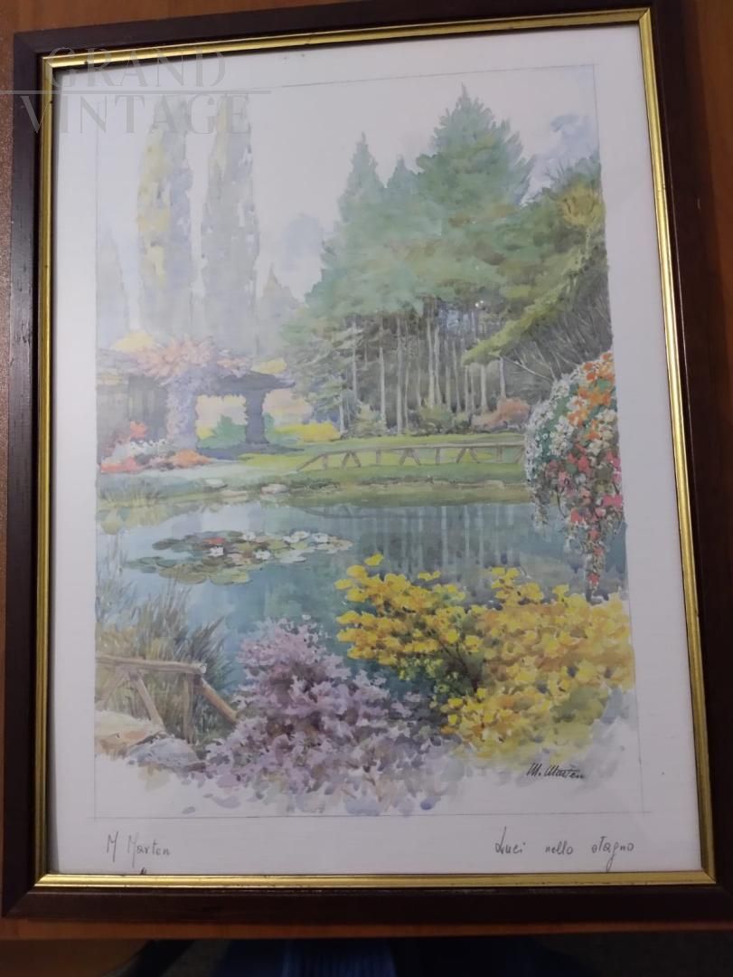 Acquerello con paesaggio lacustre firmato M. Marten