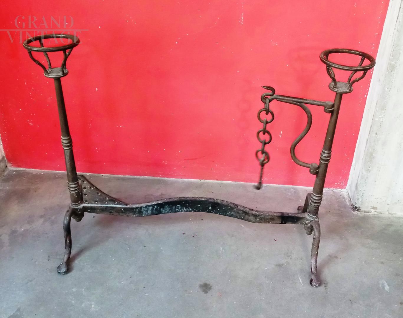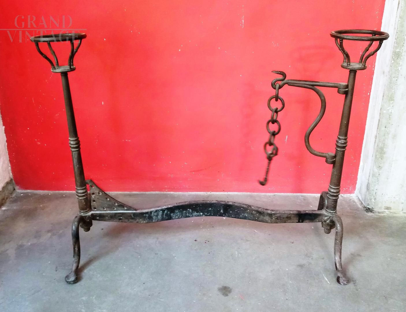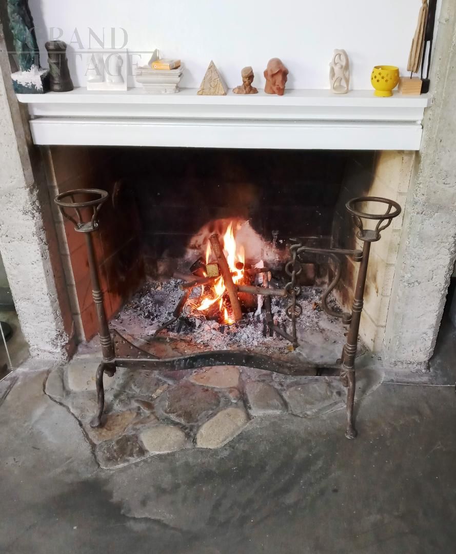 Alare per camino antico di grandi dimensioni, realizzato da un mastro ferraio Italiano negli anni '40. Pezzo unico munito di portapentole sulle sommità laterali e gancio girevole per pentola. Molto robusto e solido, adatto per un grande camino.