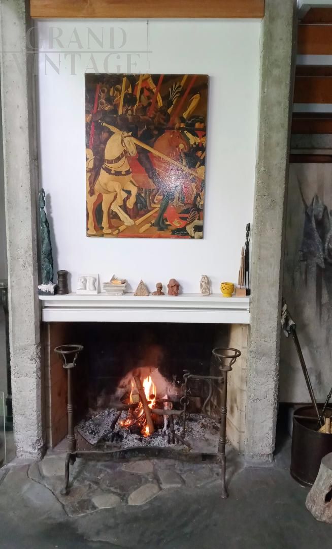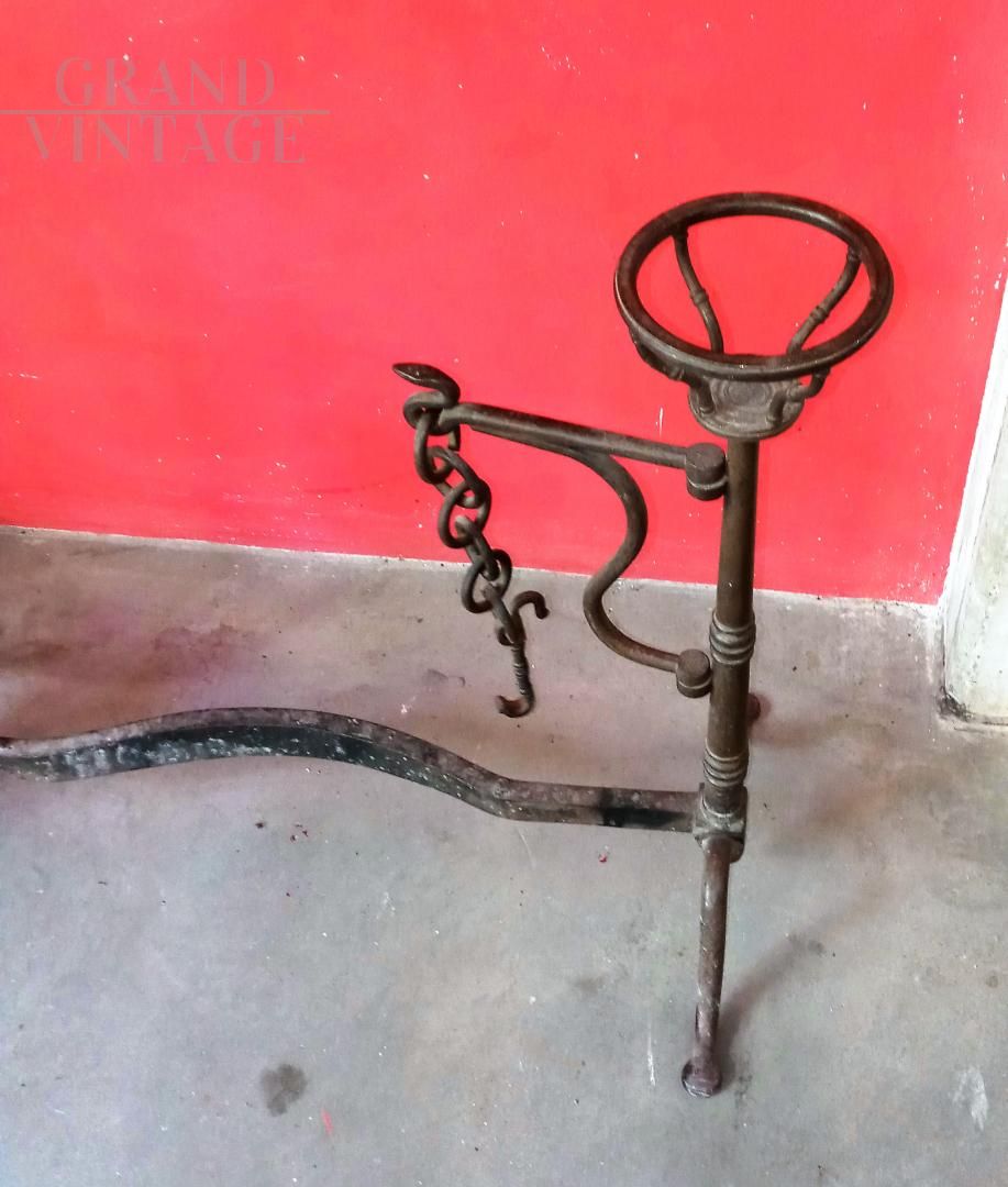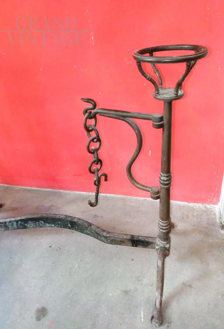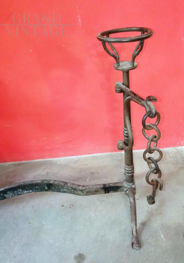 Alare per camino antico di grandi dimensioni, realizzato da un mastro ferraio Italiano negli anni '40. Pezzo unico munito di portapentole sulle sommità laterali e gancio girevole per pentola. Molto robusto e solido, adatto per un grande camino.