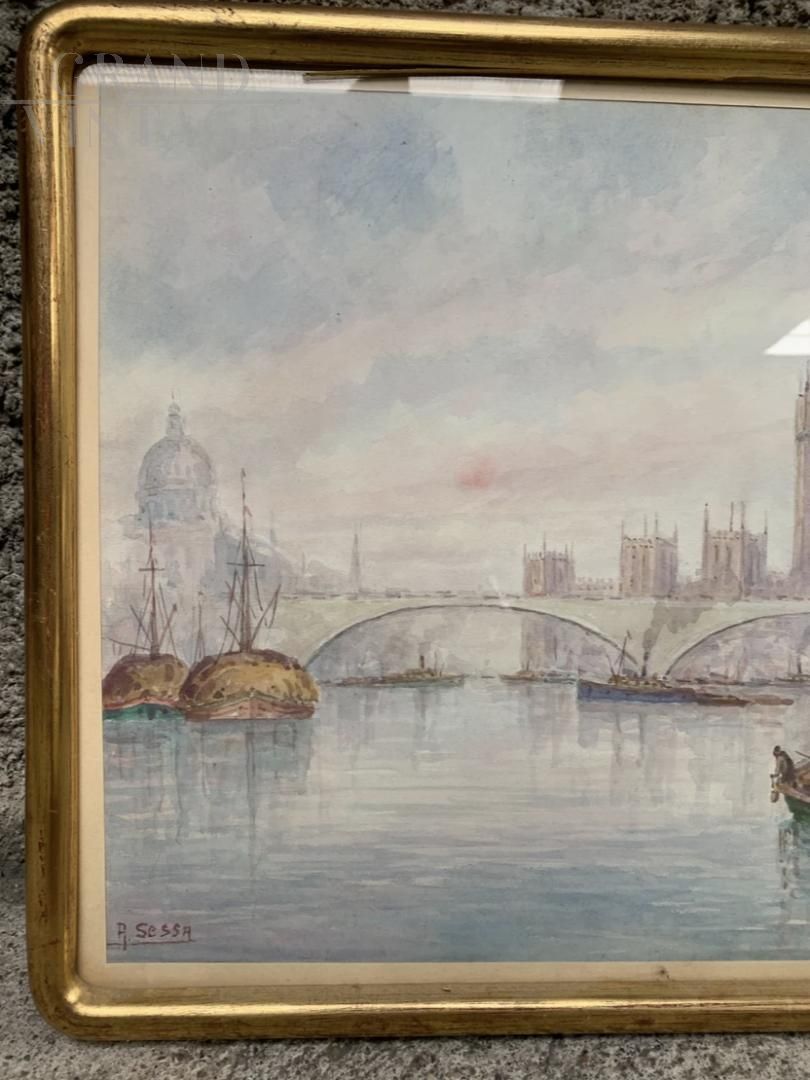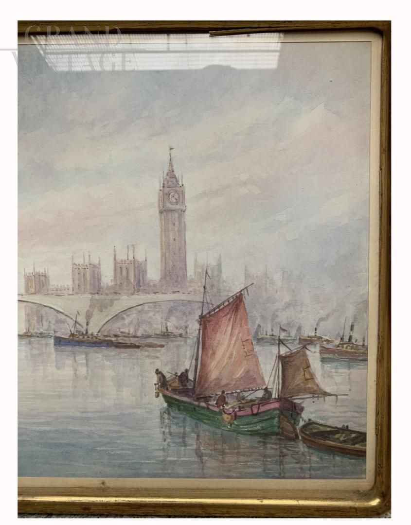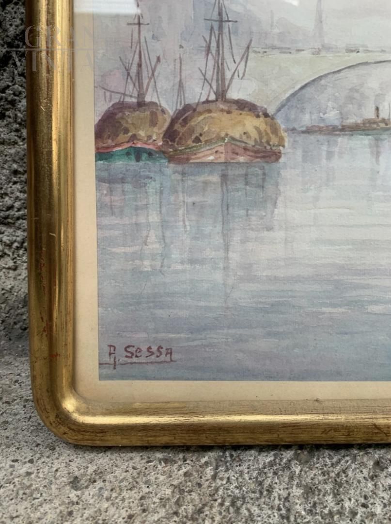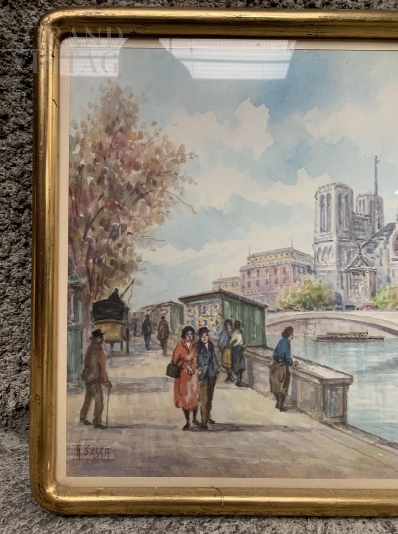 Coppia di dipinti acquerelli di Aldo Sessa raffiguranti la cattedrale di Notre-Dame di Parigi vista da due diverse prospettive, anni '50. 45 x 43 cm.