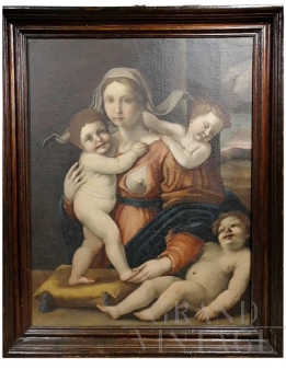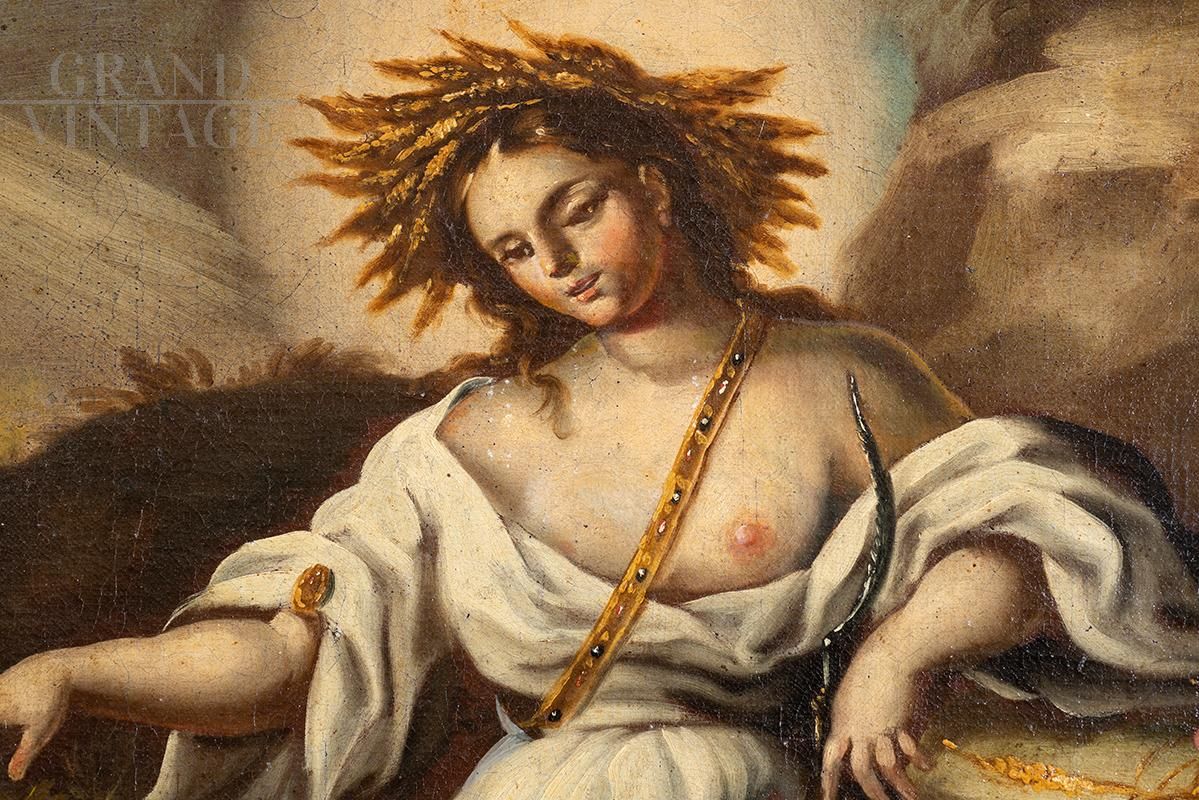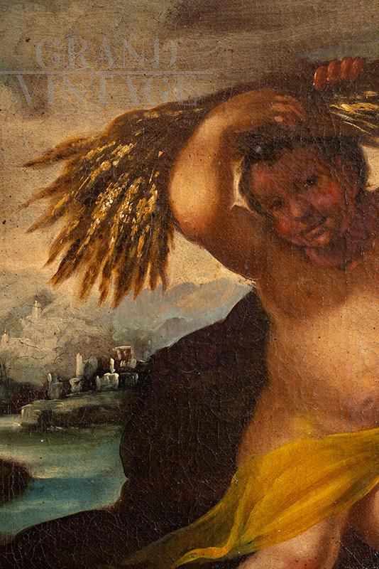 Questo importante dipinto del Settecento è da riferire alla squisita produzione della scuola Napoletana della prima metà del XVIII secolo. La splendida fattura e la ricercata cromia, evidentemente di altissimo livello, suggeriscono infatti l'attribuzione ad un autore di grande talento operante a Napoli nella prima metà del settecento. La scena si svolge tutta in primo piano, dove si nota una donna a seno scoperto irradiata dal sole cocente e contornata da frutti di stagione. Alla sua sinistra un bambino dal volto gioioso porta sulle spalle un mazzo di spighe. Il dipinto è in ottimo stato.
