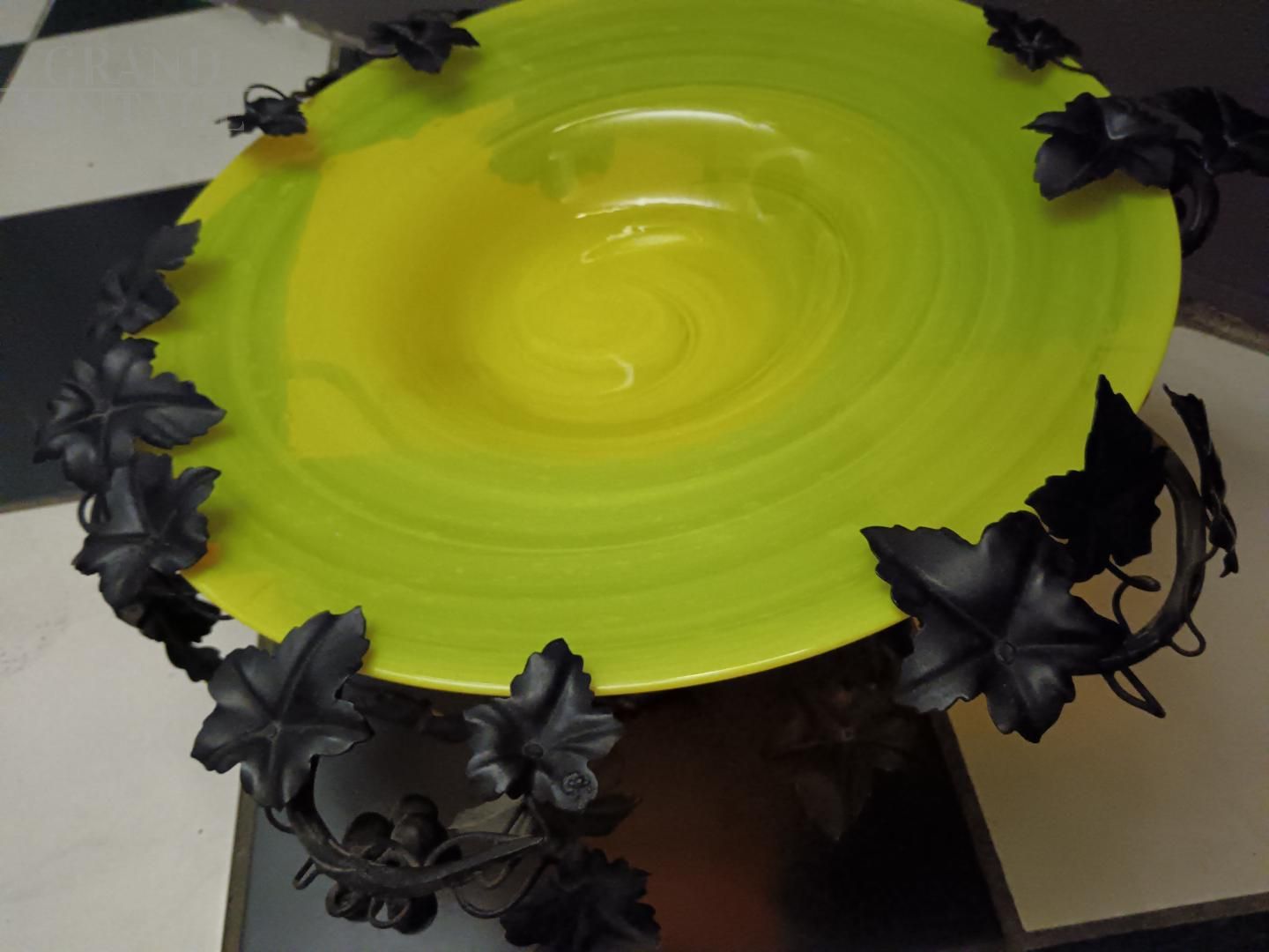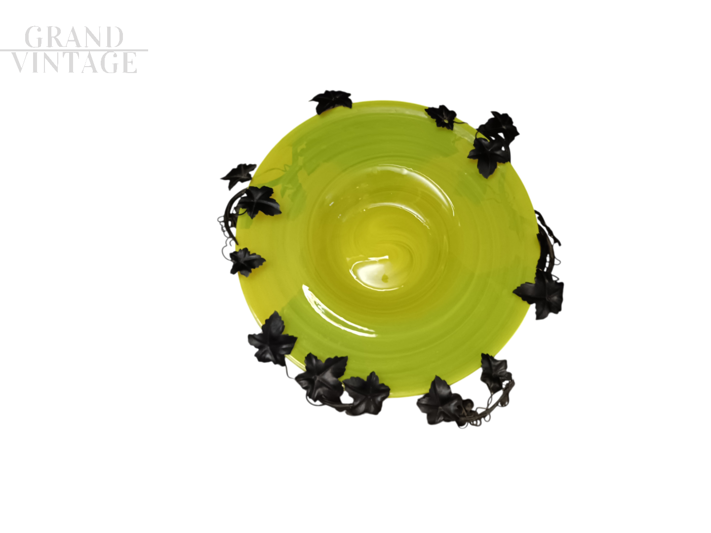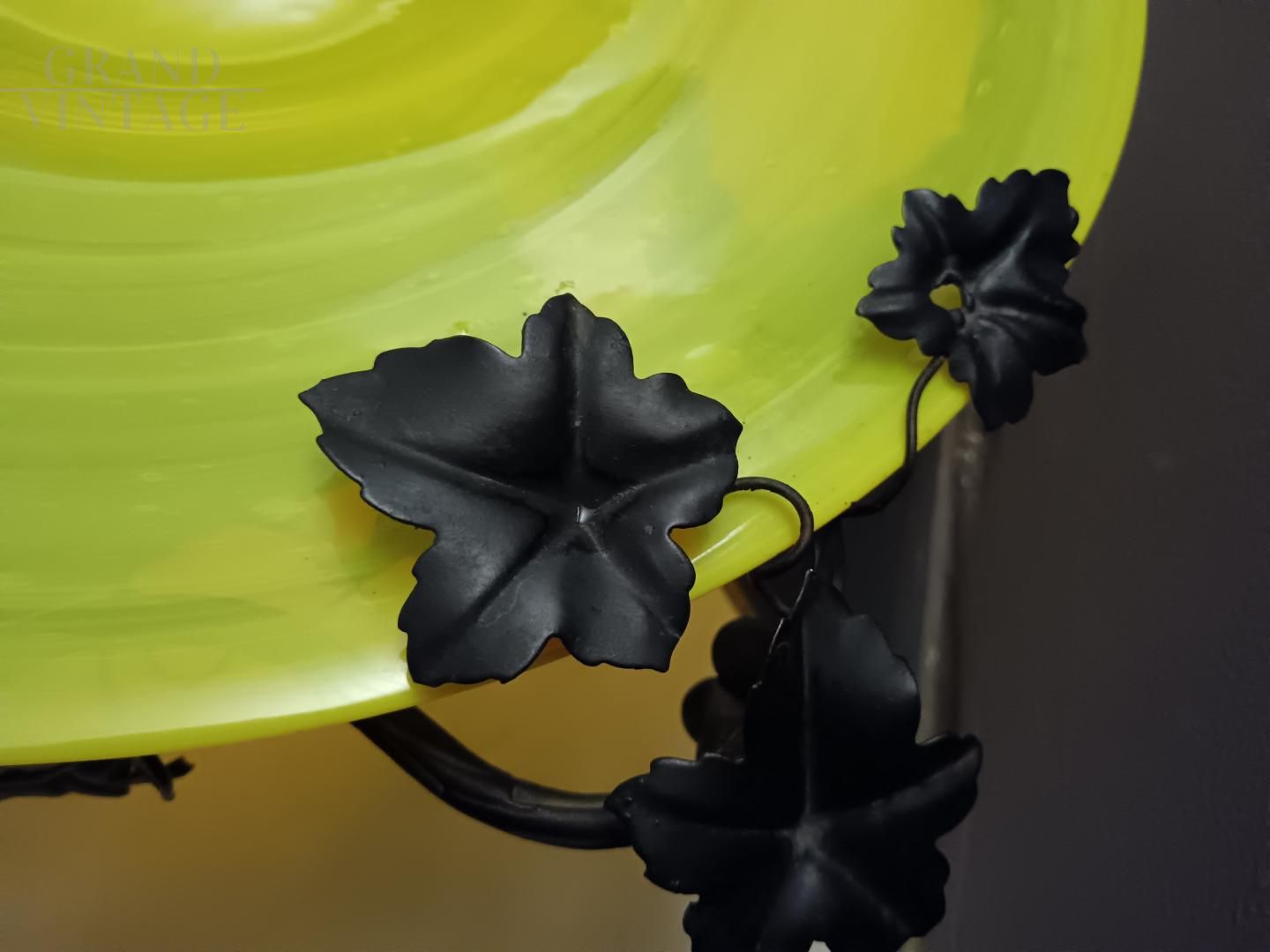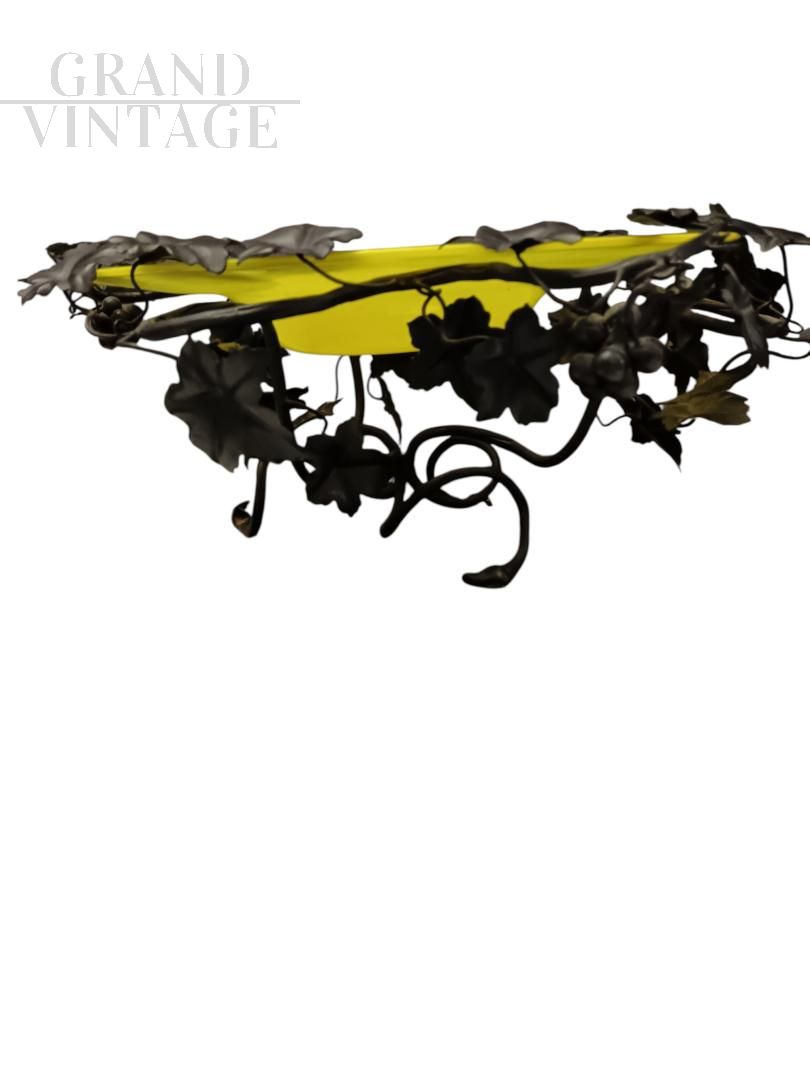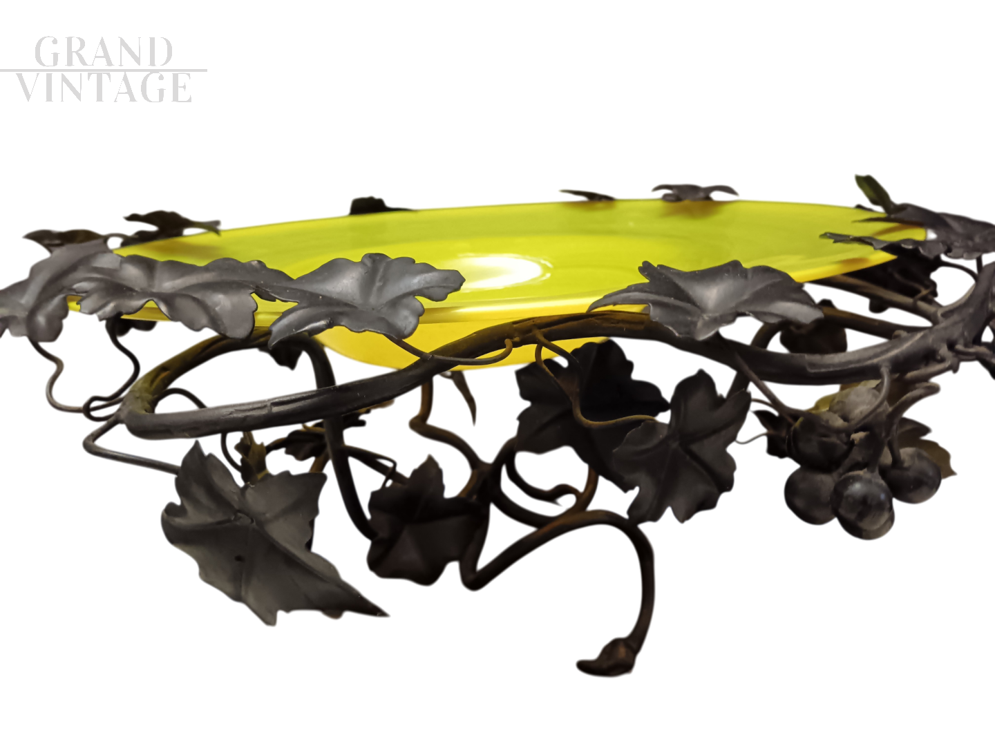 Magnifica alzatina centrotavola artistico con intrico di foglie di vite in ferro battuto e piatto superiore in vetro di Murano giallo con belle sfumature, Italia anni '20, in perfette condizioni, senza sbeccature o difetti!!