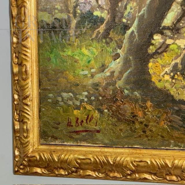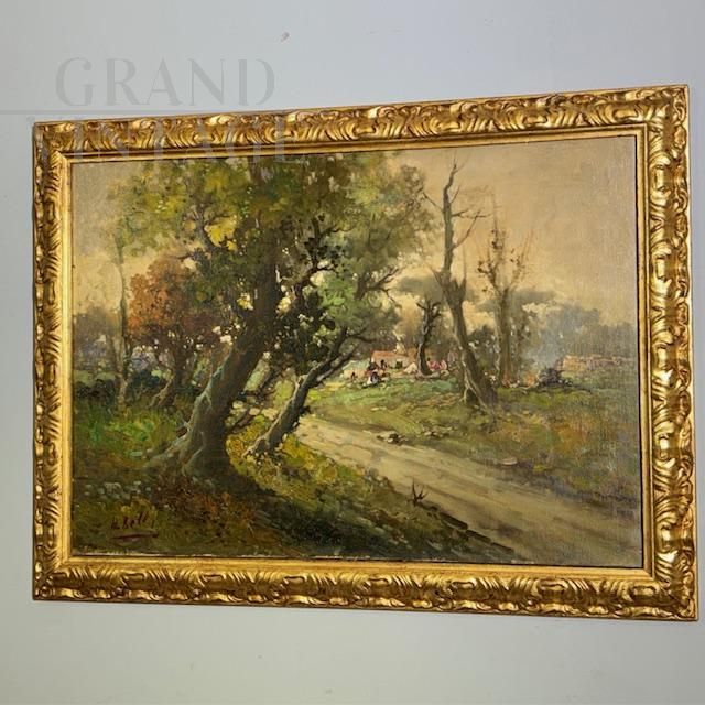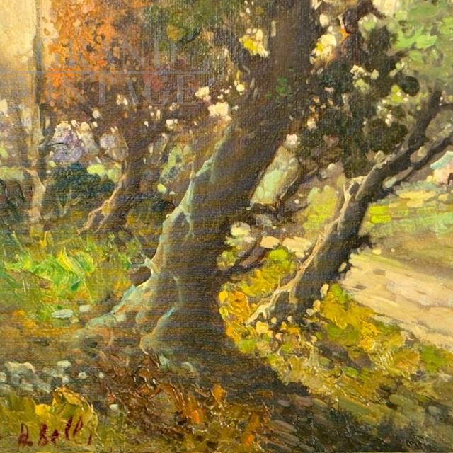 Bellissimo dipinto realizzato olio su tela da Belli Andrea – Forio D’ ischia 1950, raffigurante un paesaggio con sentiero di campagna. Tecnica molto materica, ottimo lo stato di conservazione, molto bella anche la cornice intagliata sul legno e dorata a foglia oro. Firmato.