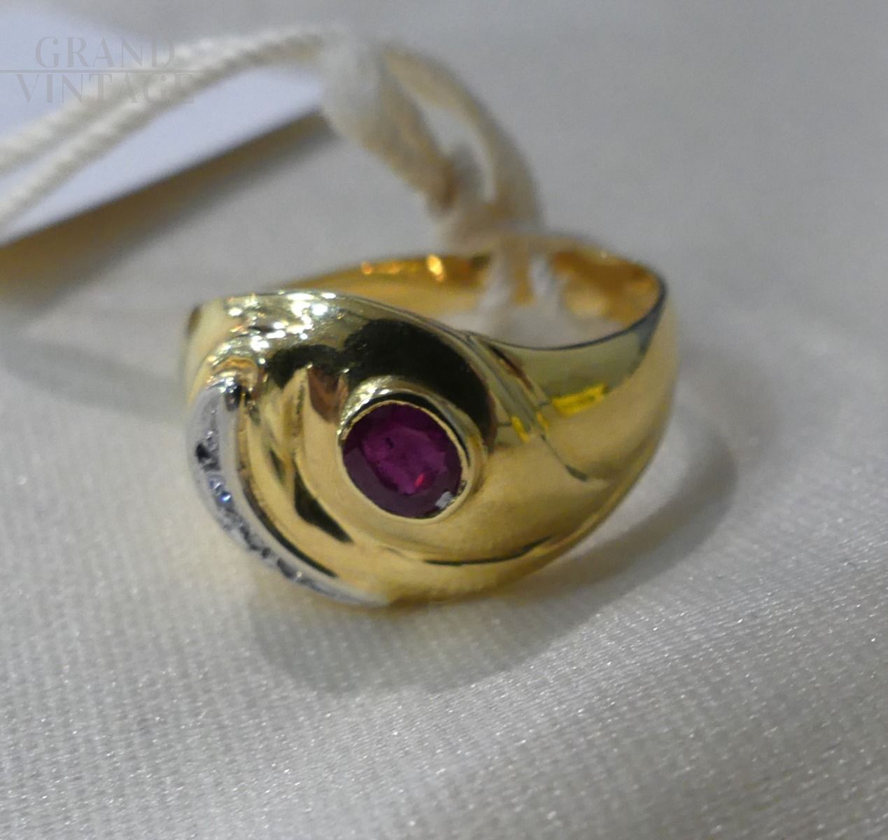 Anello vintage anni '80 in oro 18 kt con diamanti 0.10 carati e rubino centrale 0.20 carati. Peso dell'oro: 5.50 grammi. L'anello è di misura 13, ha perciò un diametro di 1.68 cm.