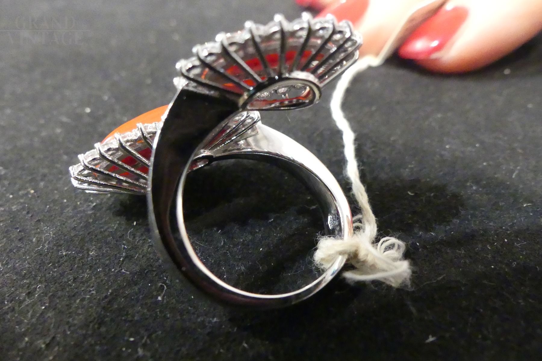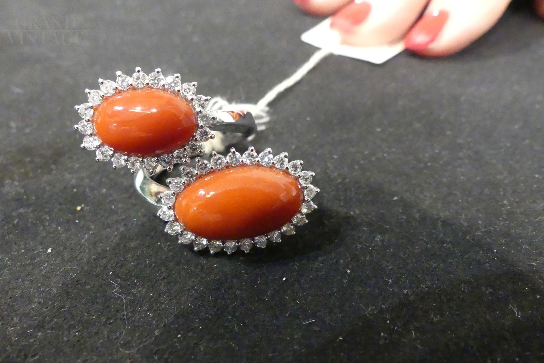 Anello di alta gioielleria in oro bianco 1 kt con diamanti e doppio corallo sardo del mediterraneo. Nuova produzione italiana.