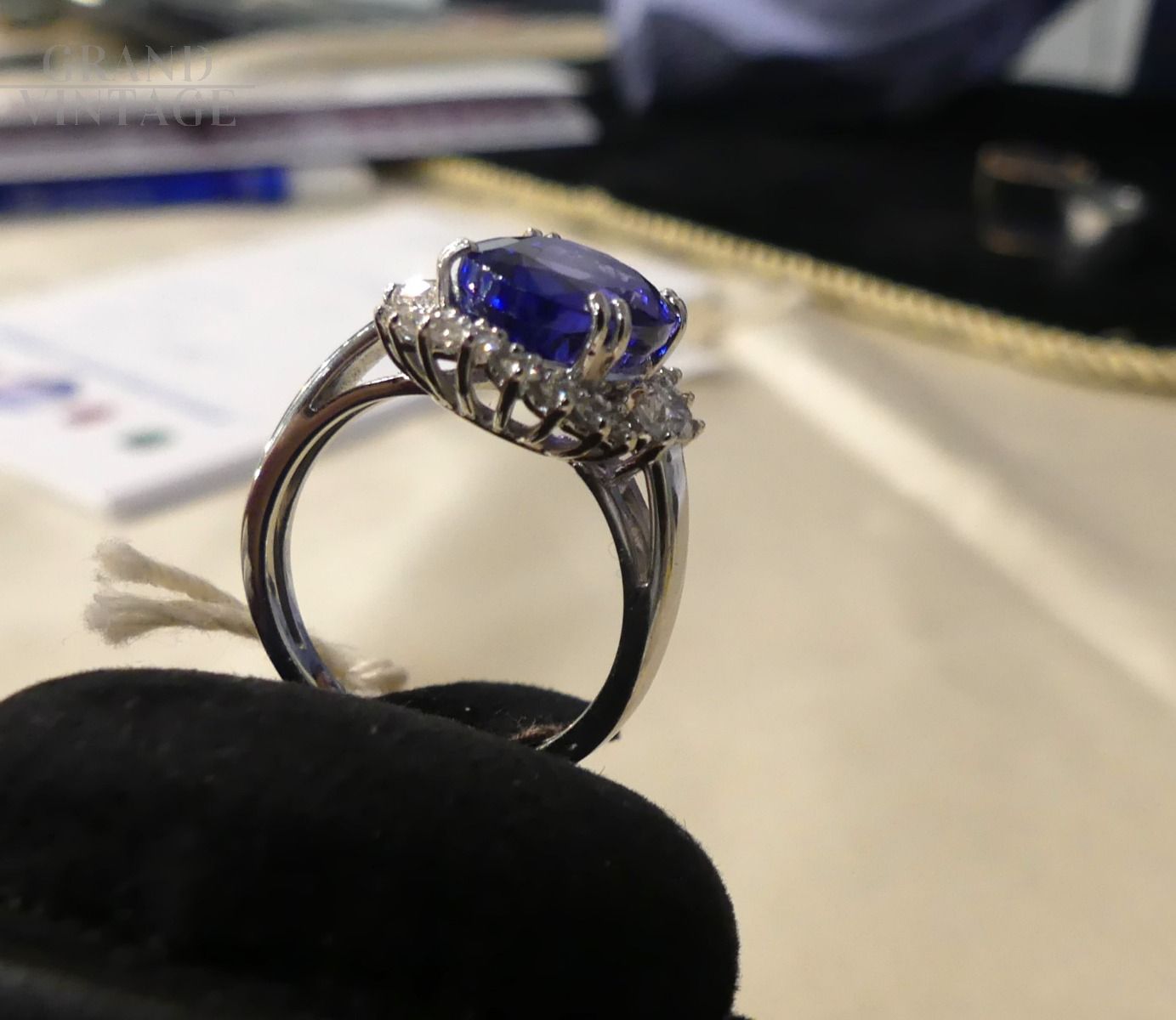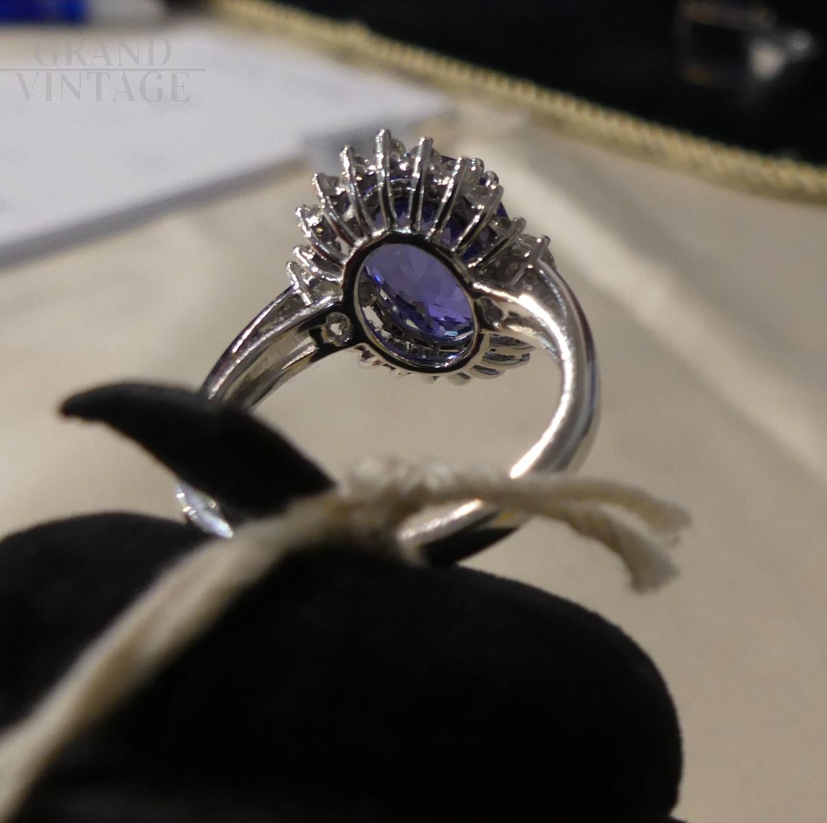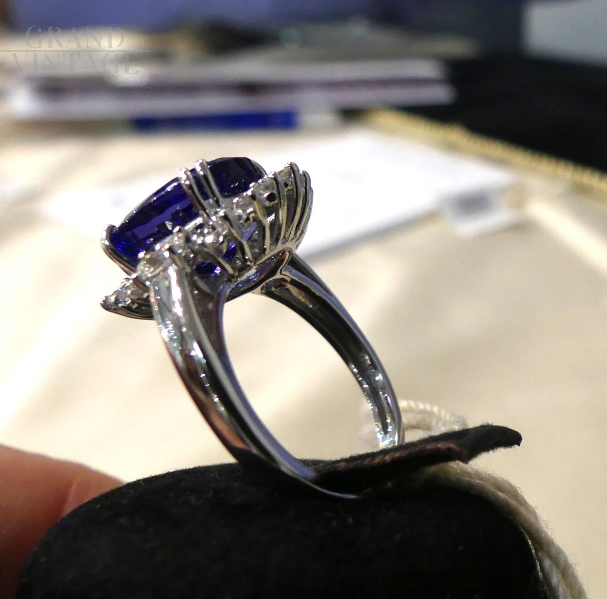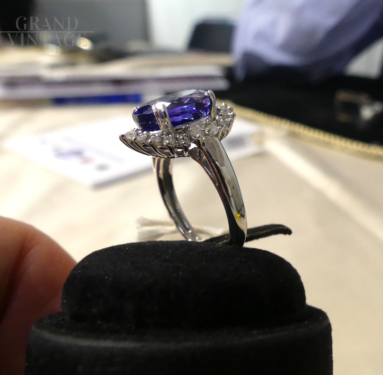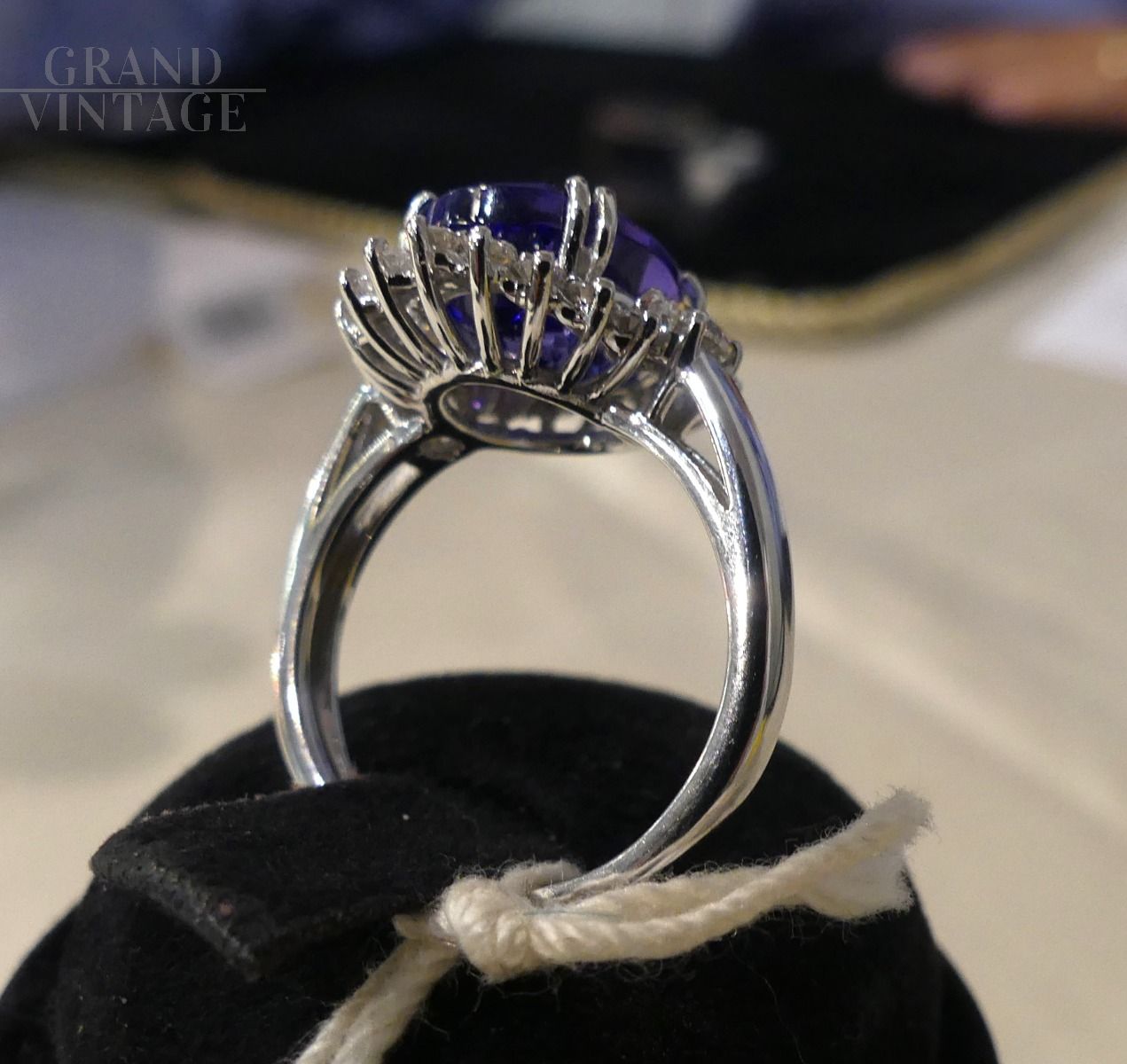 Anello vintage dei primi anni del 2000 in oro bianco 18 kt con diamanti 0.38 carati, grande tanzanite centrale 0.60 carati e due diamanti ovali di 0.37 carati. Peso dell'oro: 4.90 grammi. L'anello è di misura 14, ha perciò un diametro di 1.72 cm.