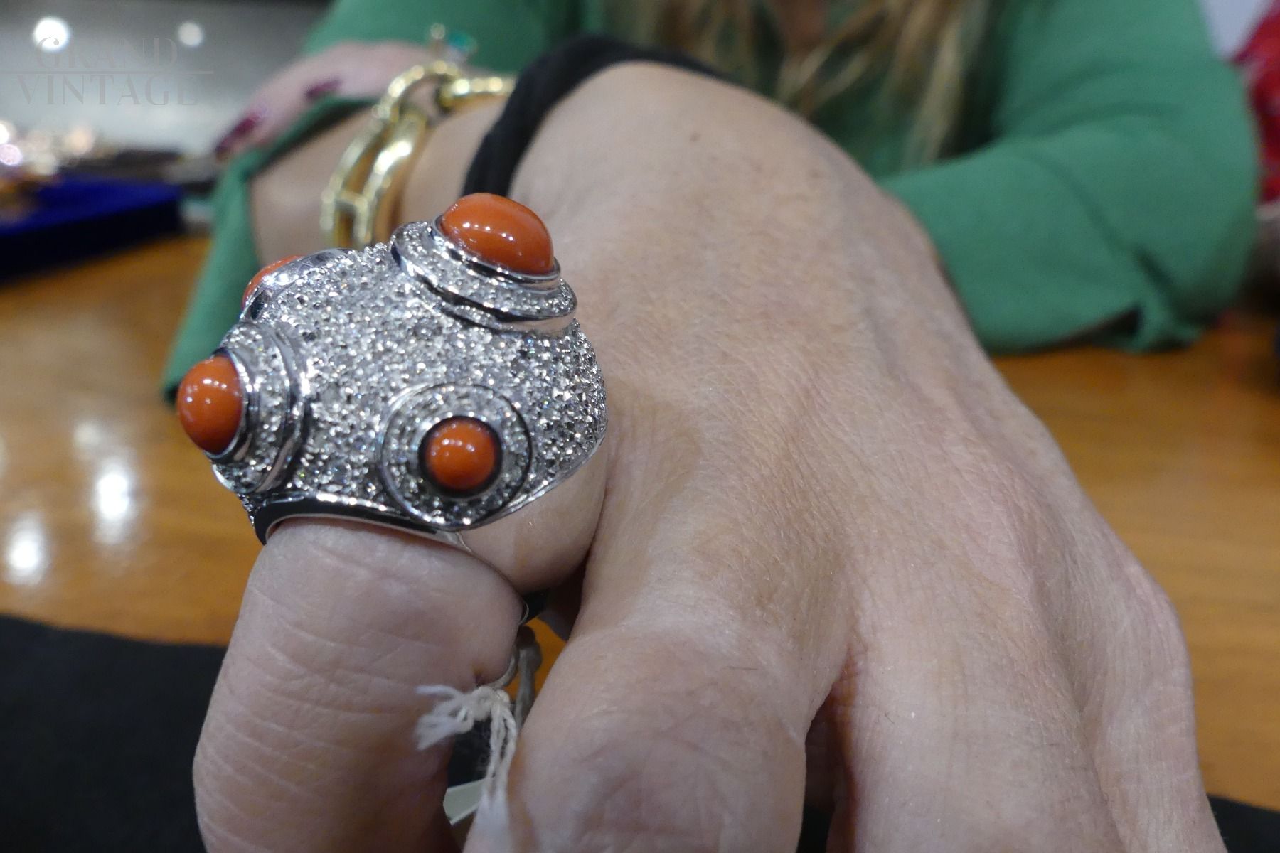Anello di alta gioielleria modello Mina in oro bianco e diamanti con bottoni in corallo. Peso dell'oro 34 grammi, 3kt. Nuova produzione italiana.