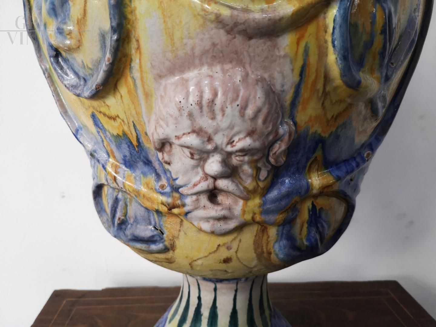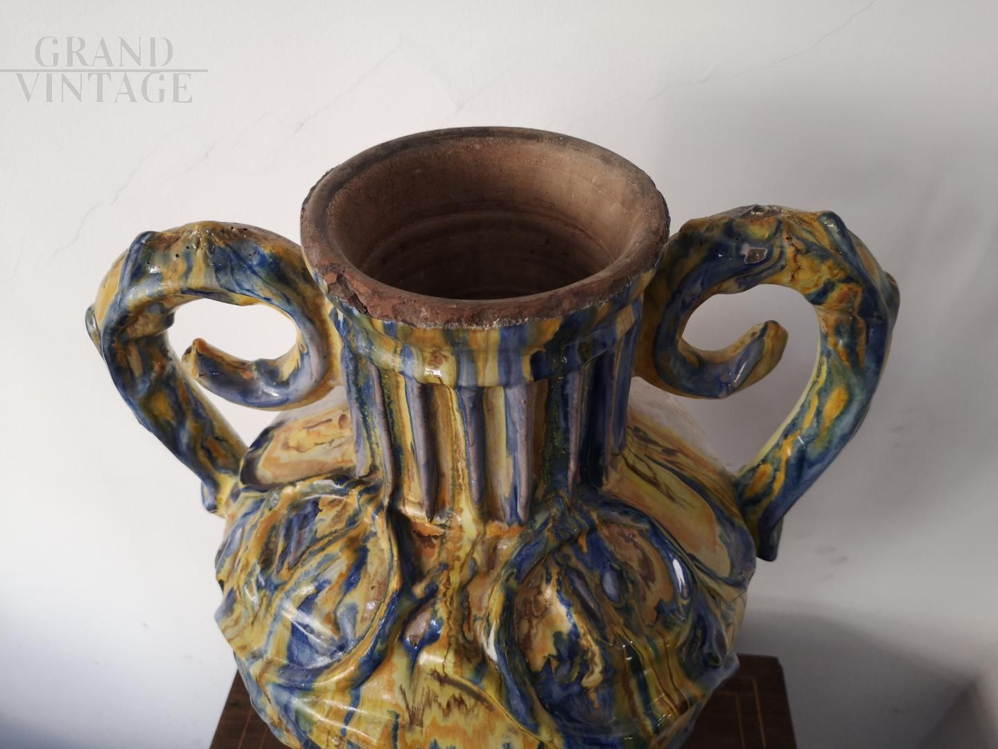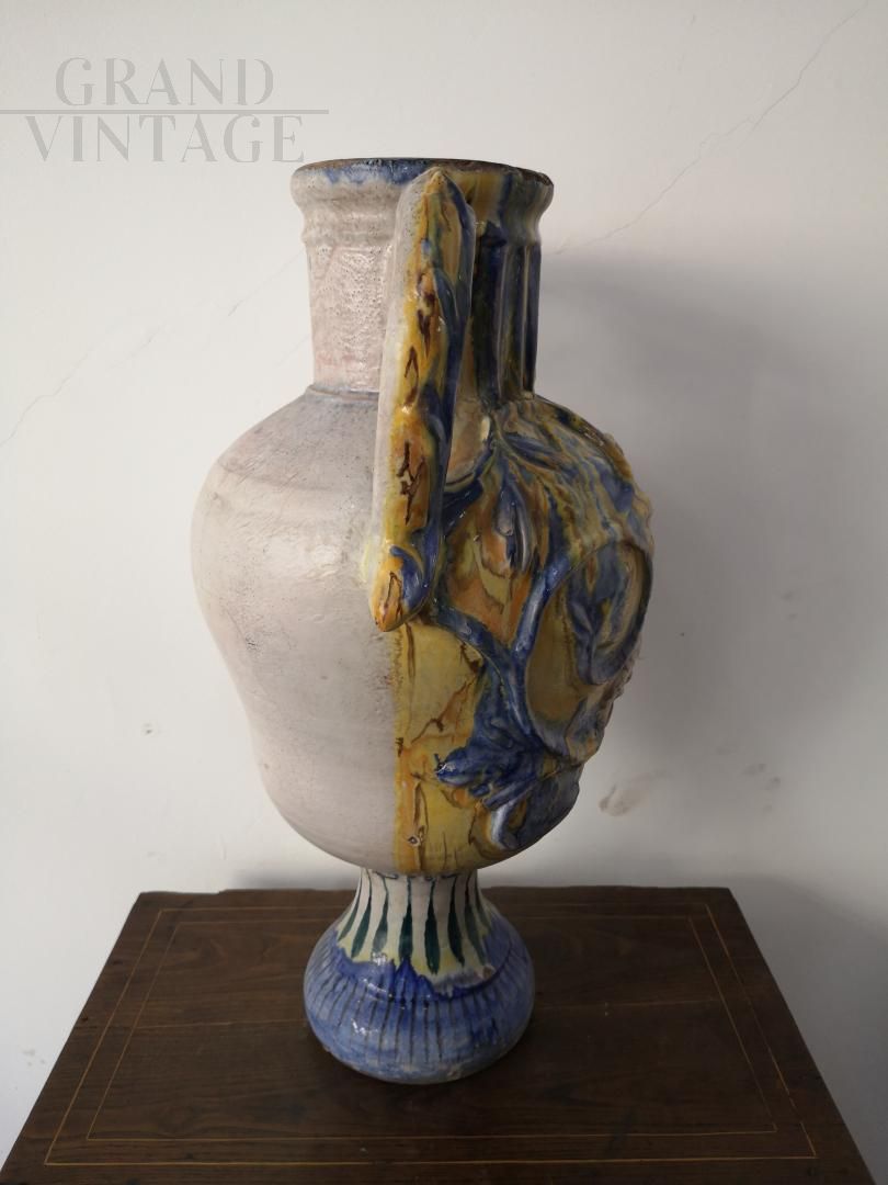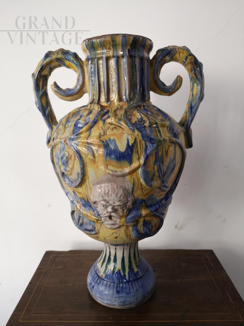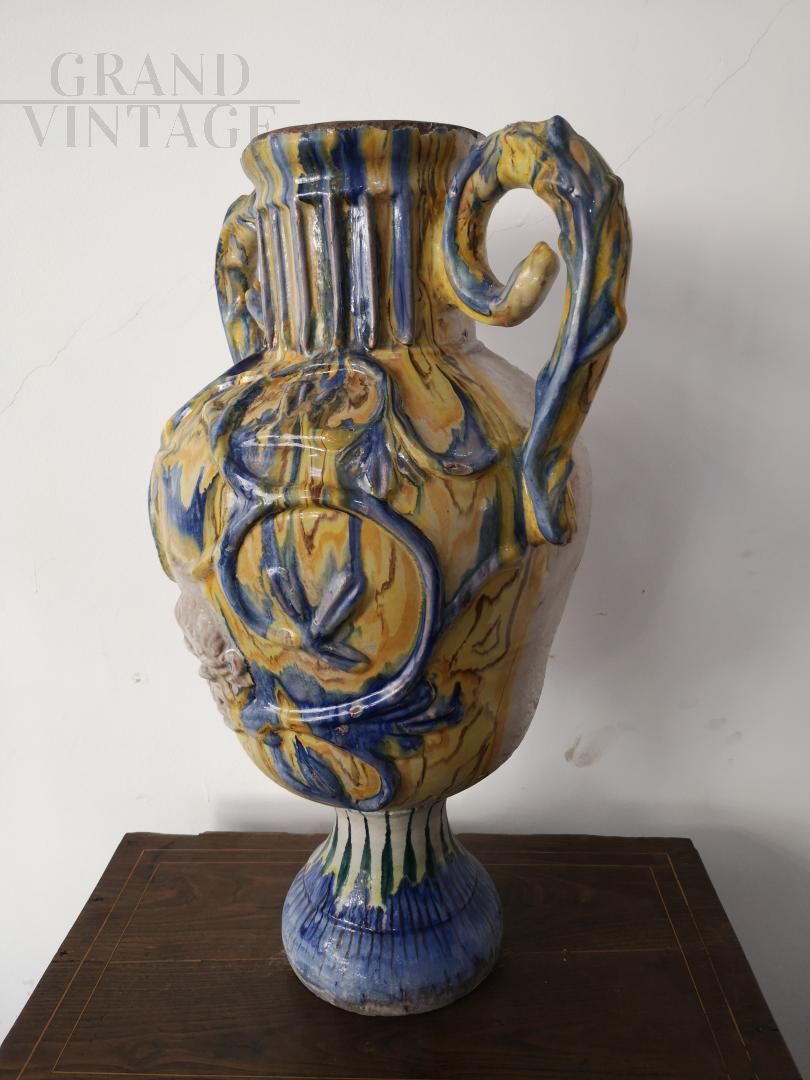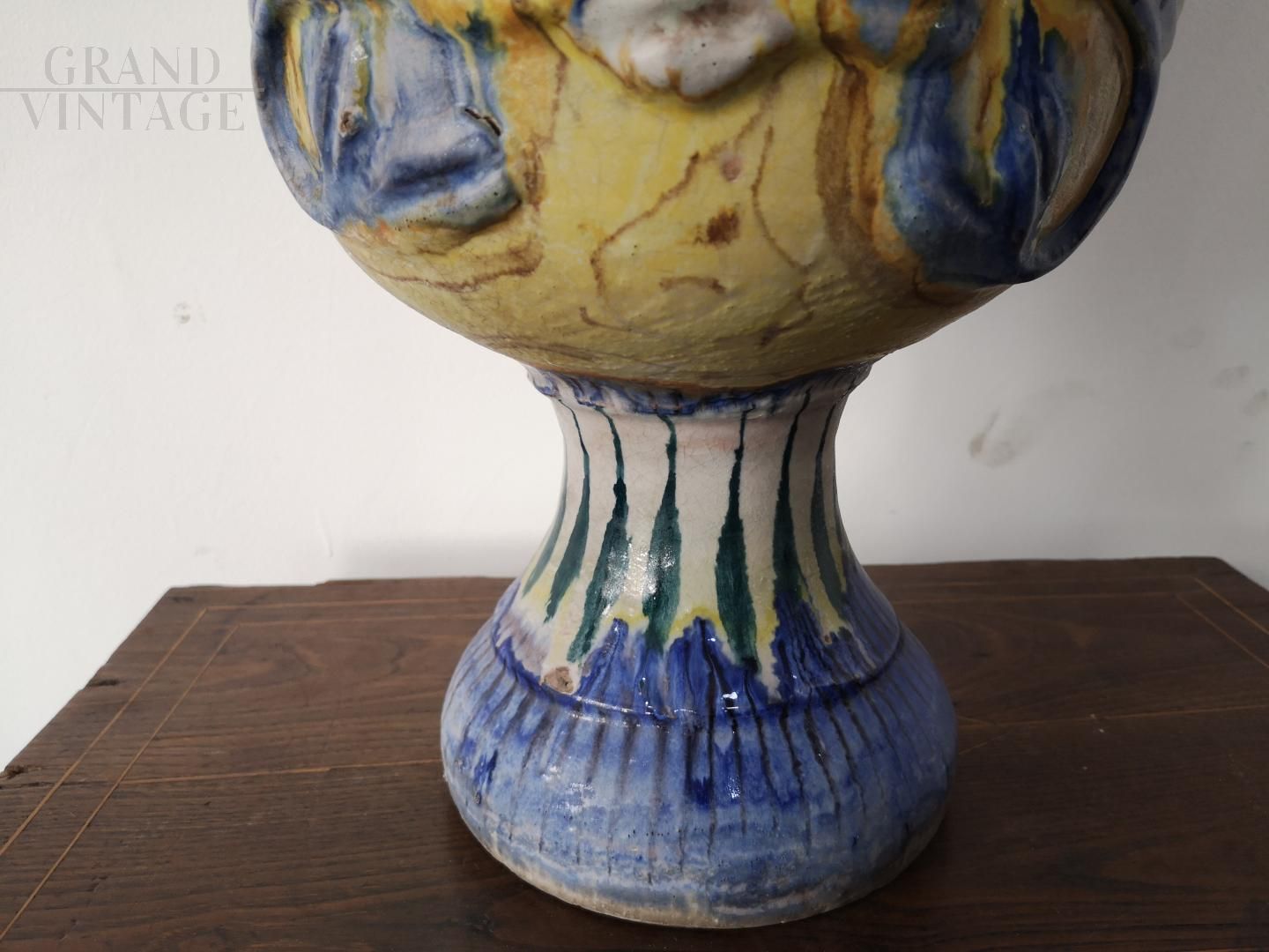 Anfora antica in ceramica di Caltagirone di metà '800 raffigurante il mascherone di un satiro, decorata solo da un lato.