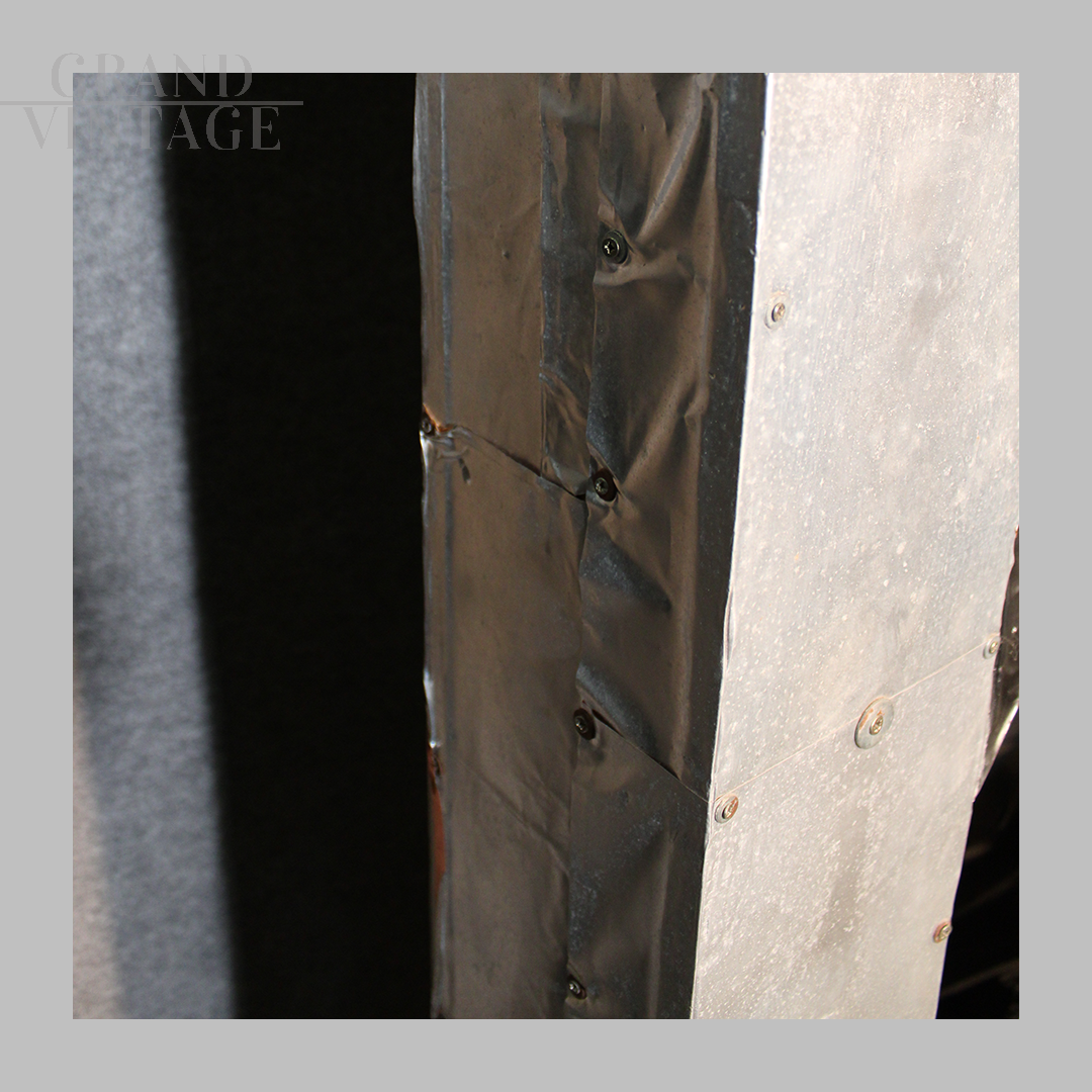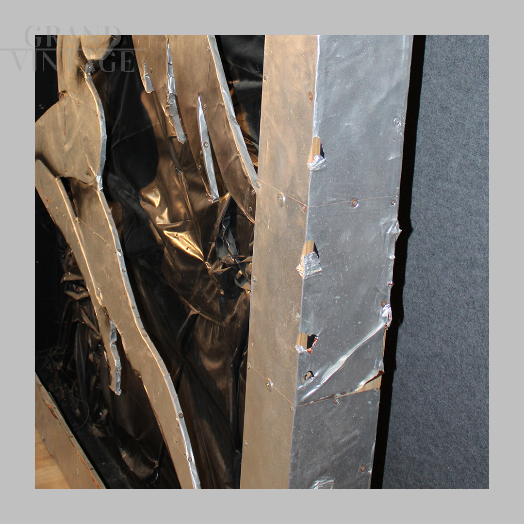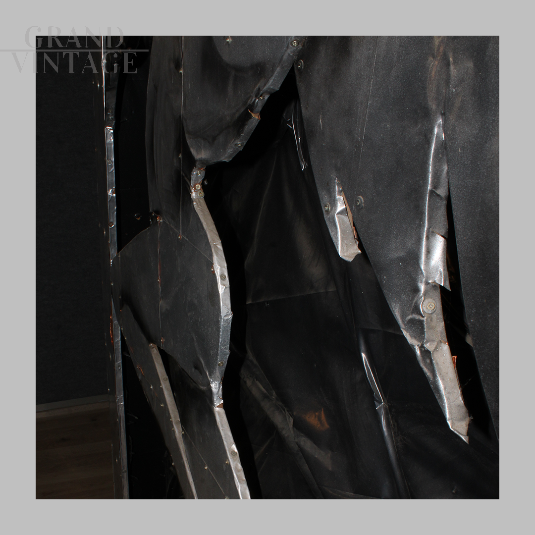 Un'opera contemporanea straordinaria che unisce arte e sostenibilità. Questa scultura in rilievo, realizzata su base in legno rivestita con materiali di recupero (fogli di alluminio e busto di plastica), rappresenta un maestoso "Angelo Nero", simbolo di forza, mistero e libertà. Le dimensioni generose (190x160x15 cm) e lo stile industrial chic rendono questo pezzo ideale per ambienti moderni e loft dal carattere deciso. I segni di lavorazione e l'aspetto grezzo conferiscono un fascino unico, sottolineando la filosofia di riutilizzo dei materiali. Un’opera che non passa inosservata, capace di trasformare lo spazio in un ambiente carico di significato e personalità. L'opera è in buone condizioni generali ma con diversi segni.