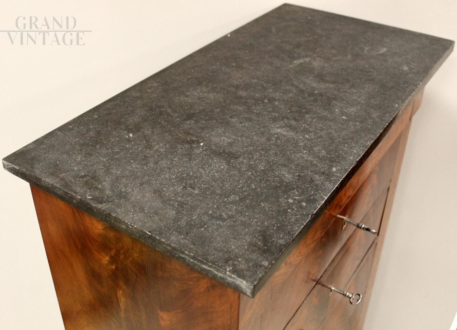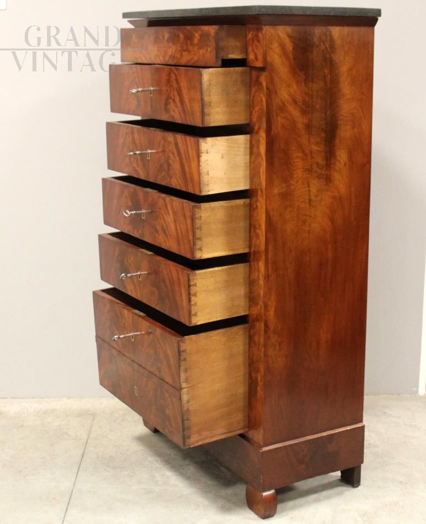 Cassettiera settimanale antico Luigi Filippo in legno di mogano con piano in marmo, epoca metà '800, restaurato.