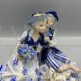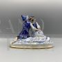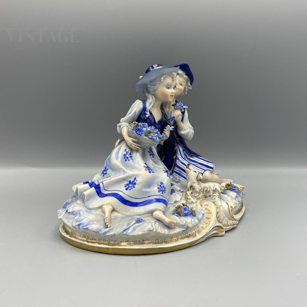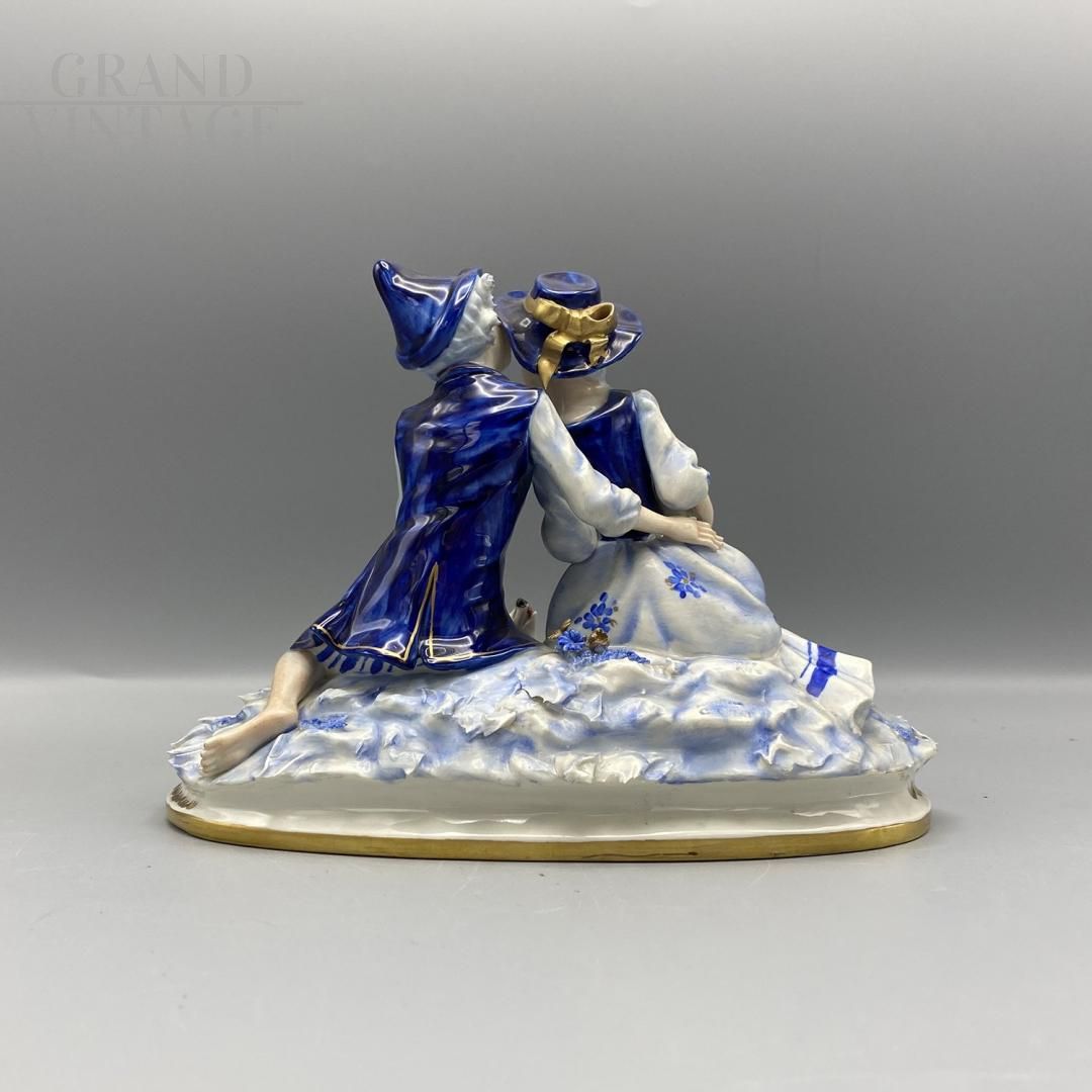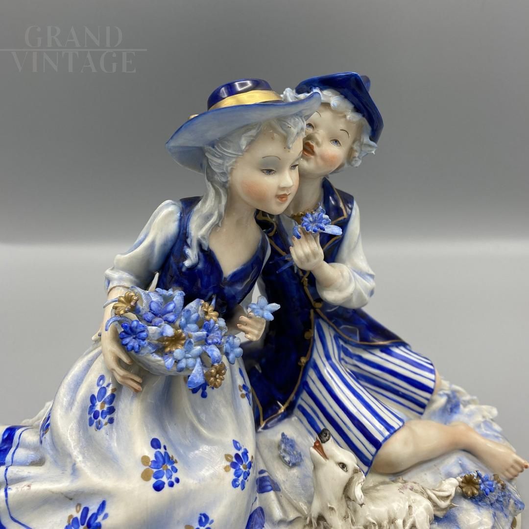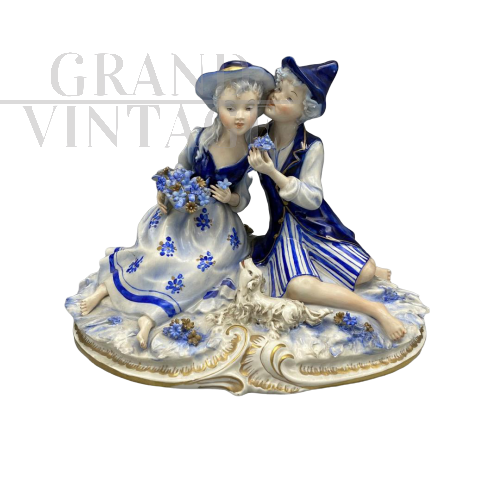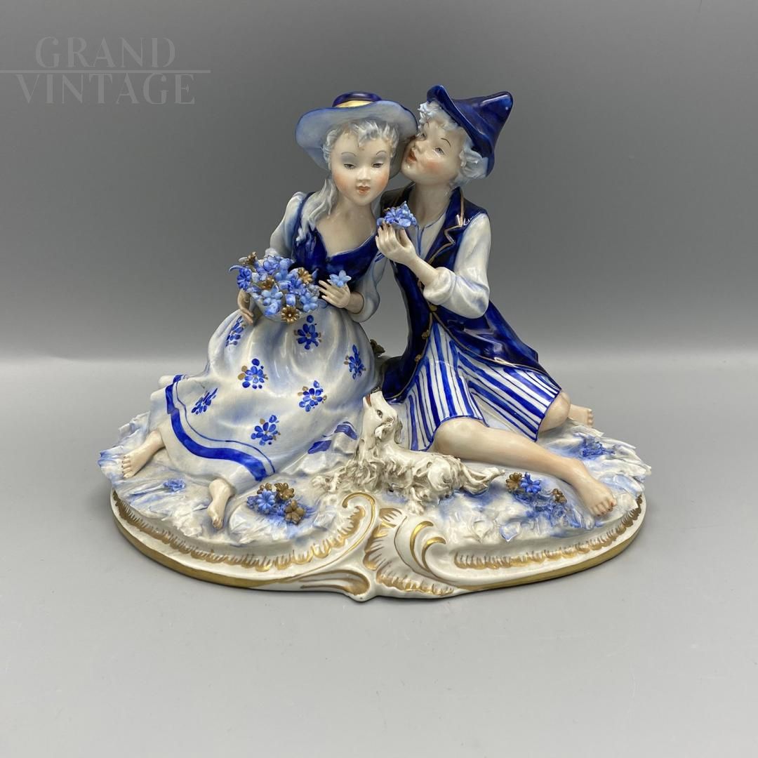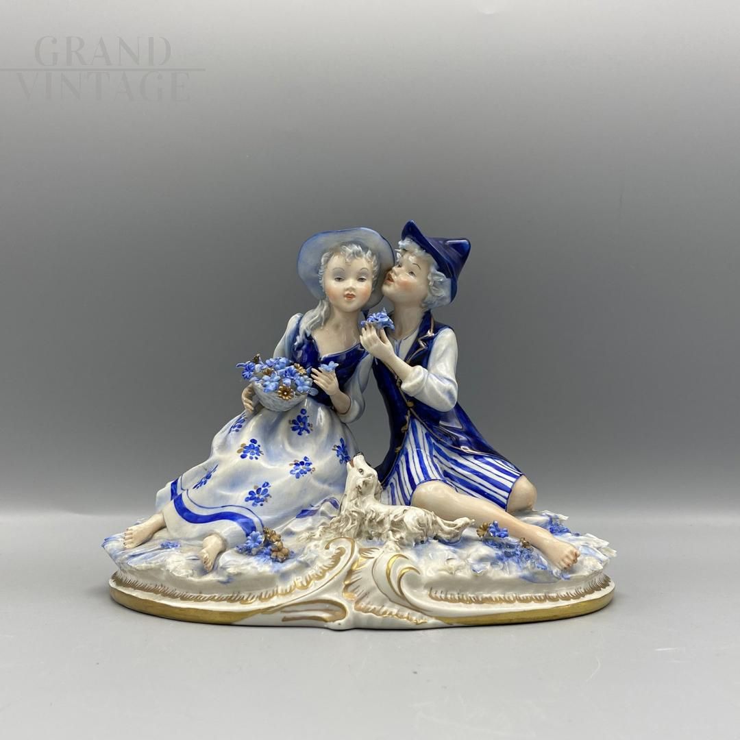 Statuina composizione raffigurante una scena galante con due fanciulli su un prato fiorito. Porcellana bianca smaltata.