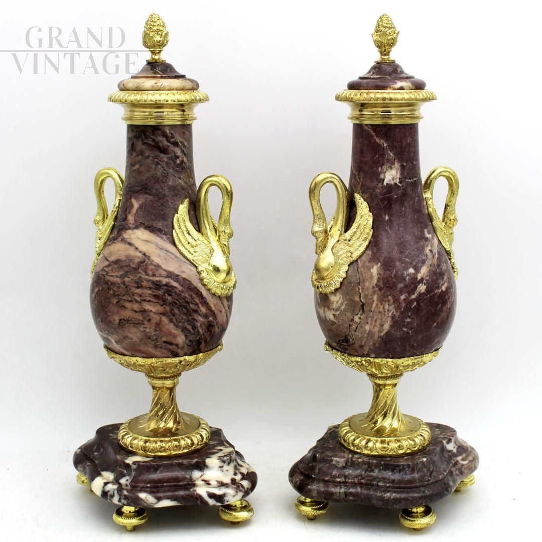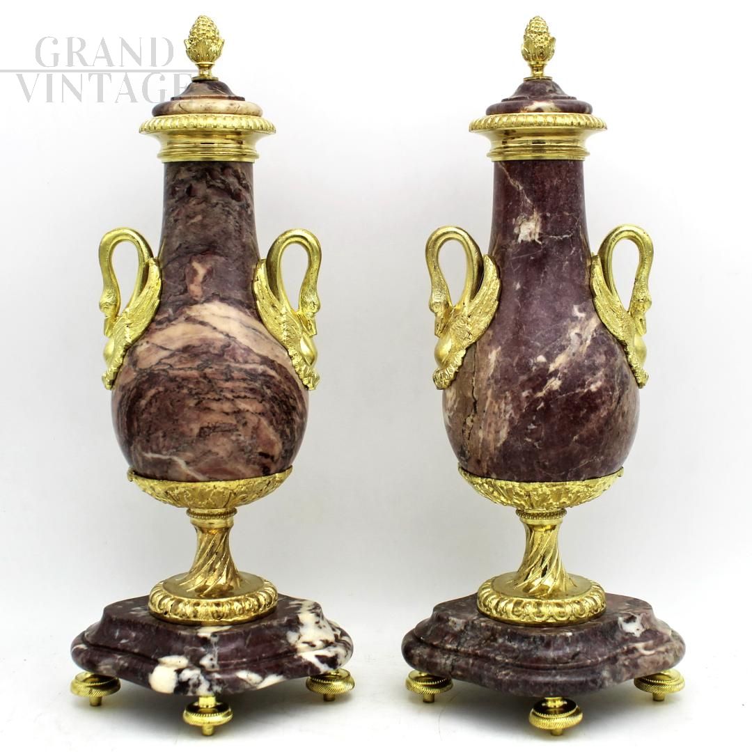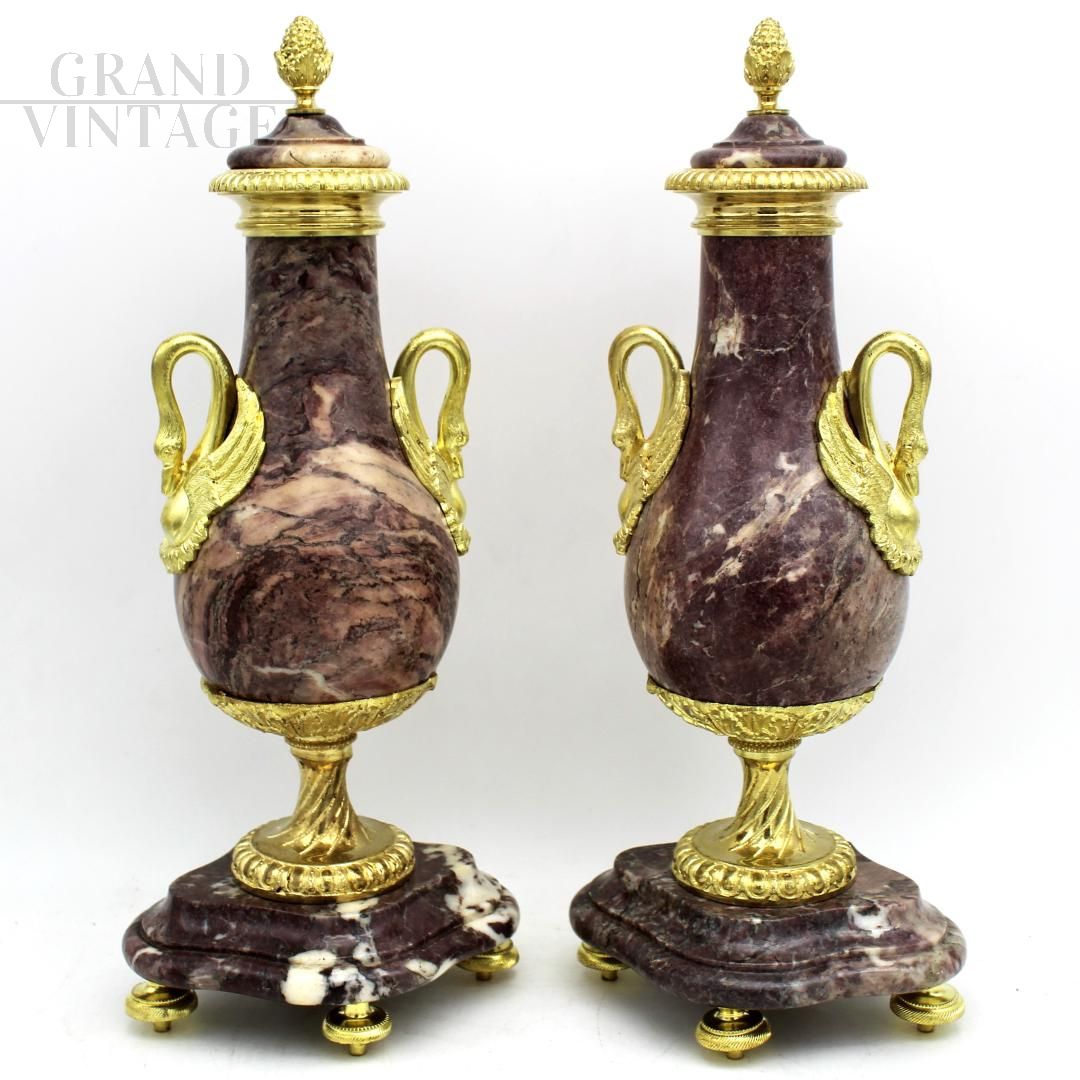 Antica coppia di vasi Napoleone III in bronzo dorato e marmo, '800