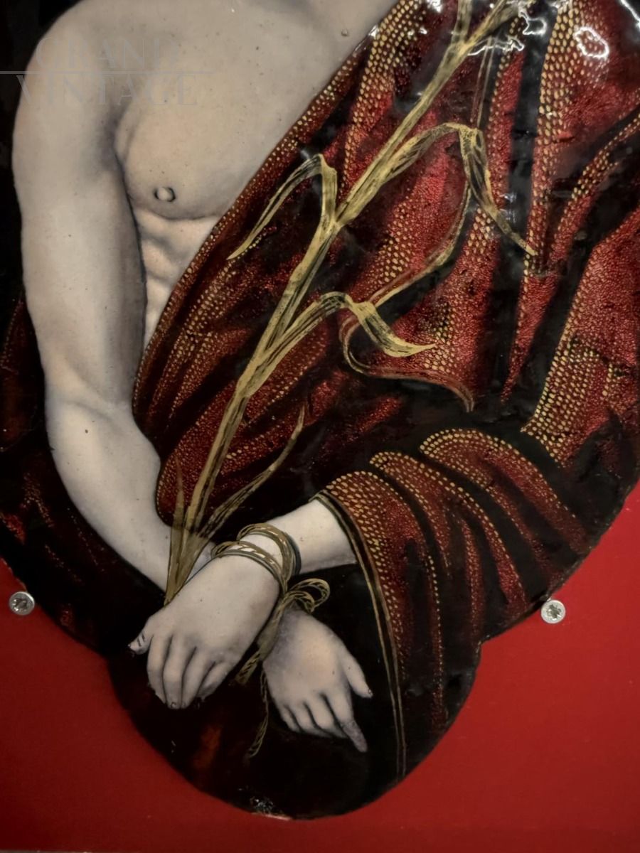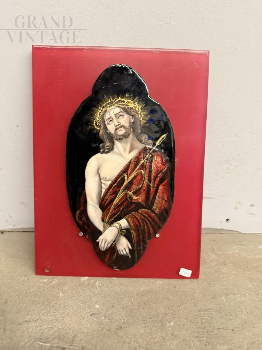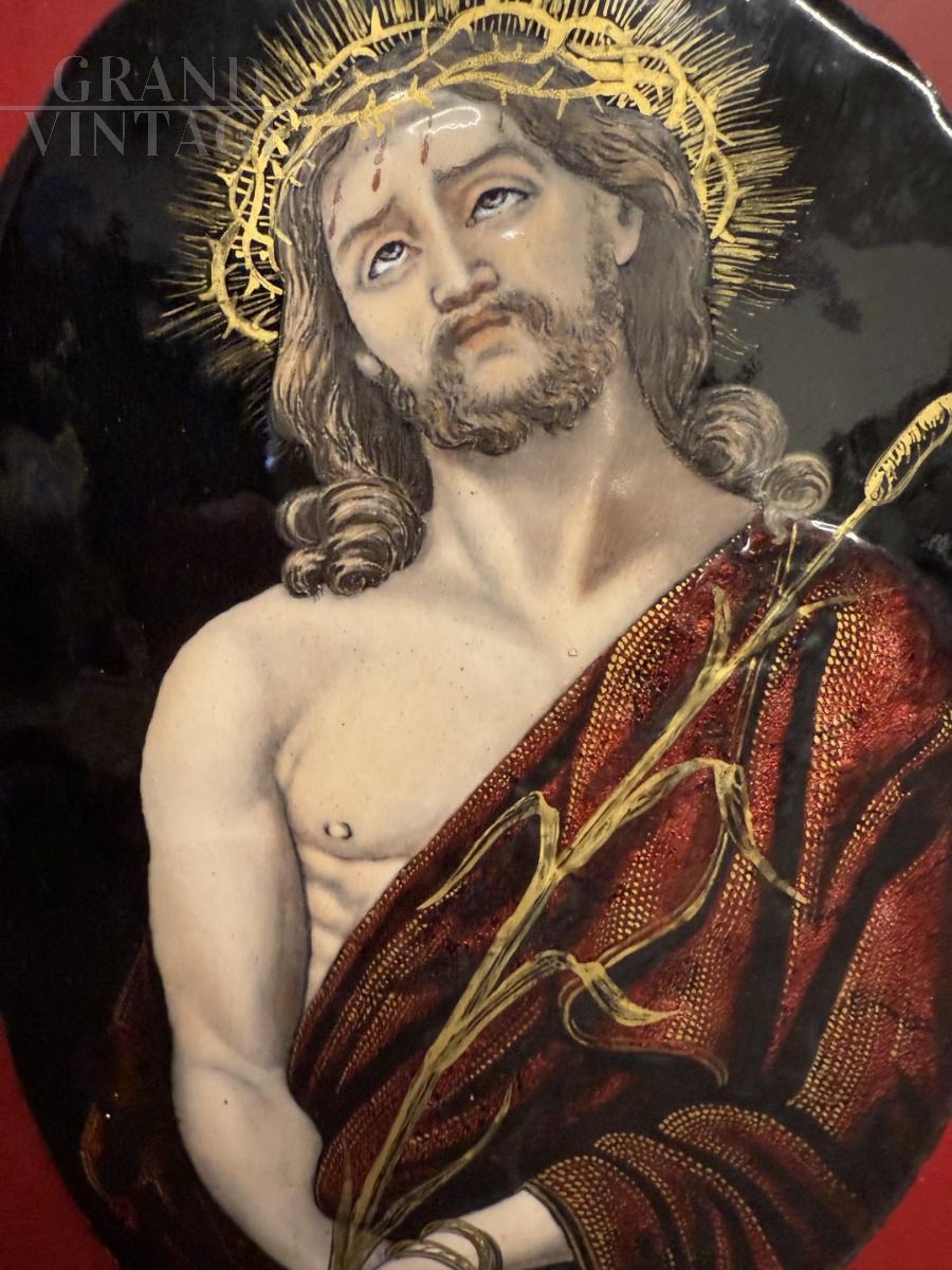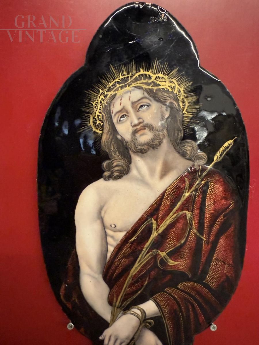 Antica placca in porcellana Limoges con Cristo dipinto a smalto, metà '800
