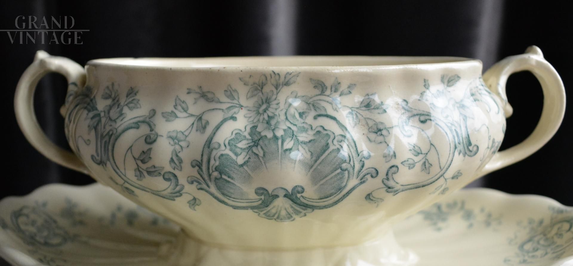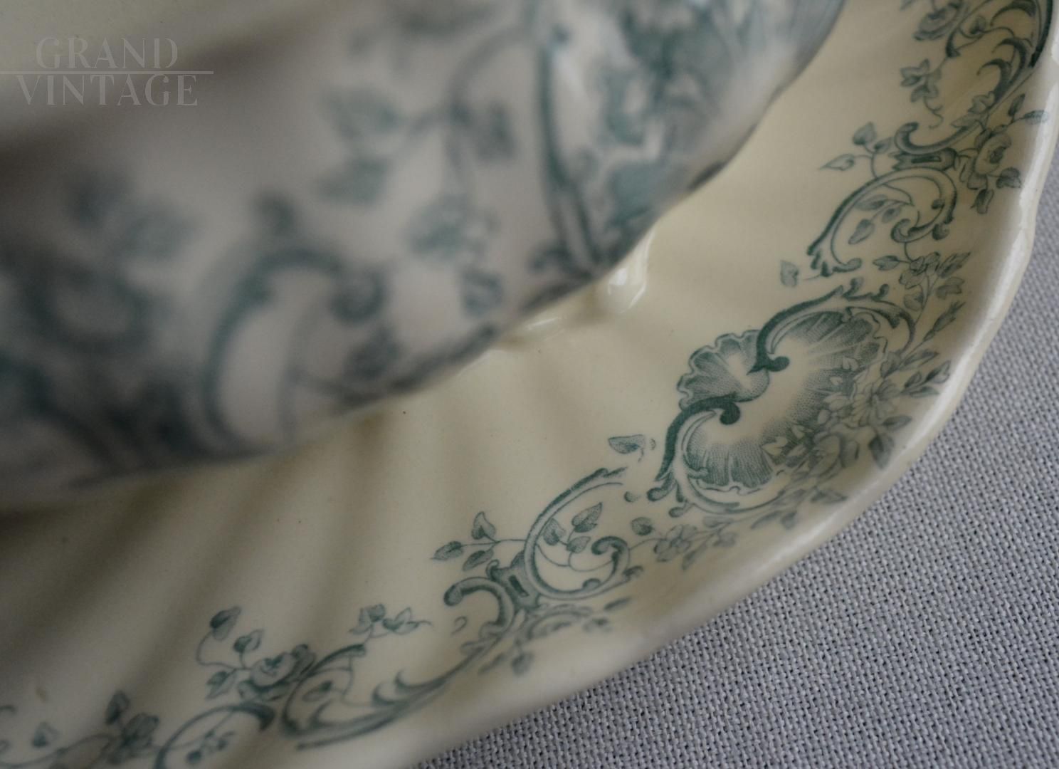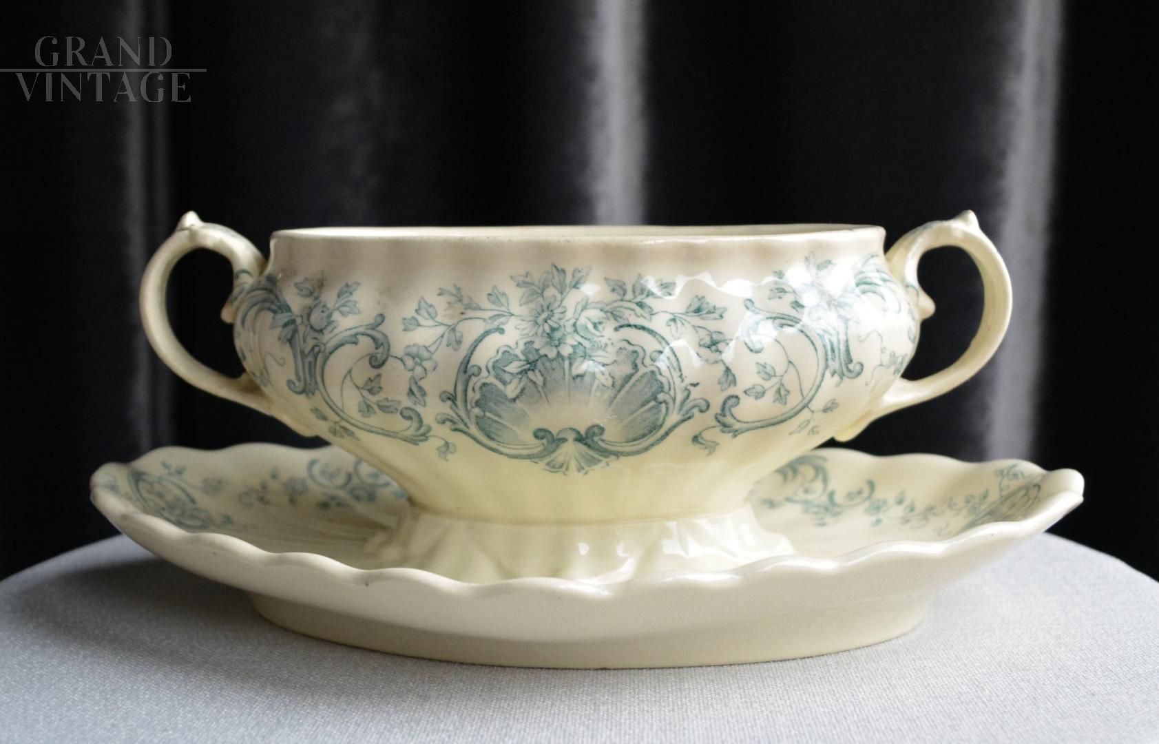 Salsiera vintage di manifattura Francese Terre de Fer, oggetto impreziosito da un decoro molto raffinato, presenta piccoli segni di usura dati dall'epoca dell'oggetto.