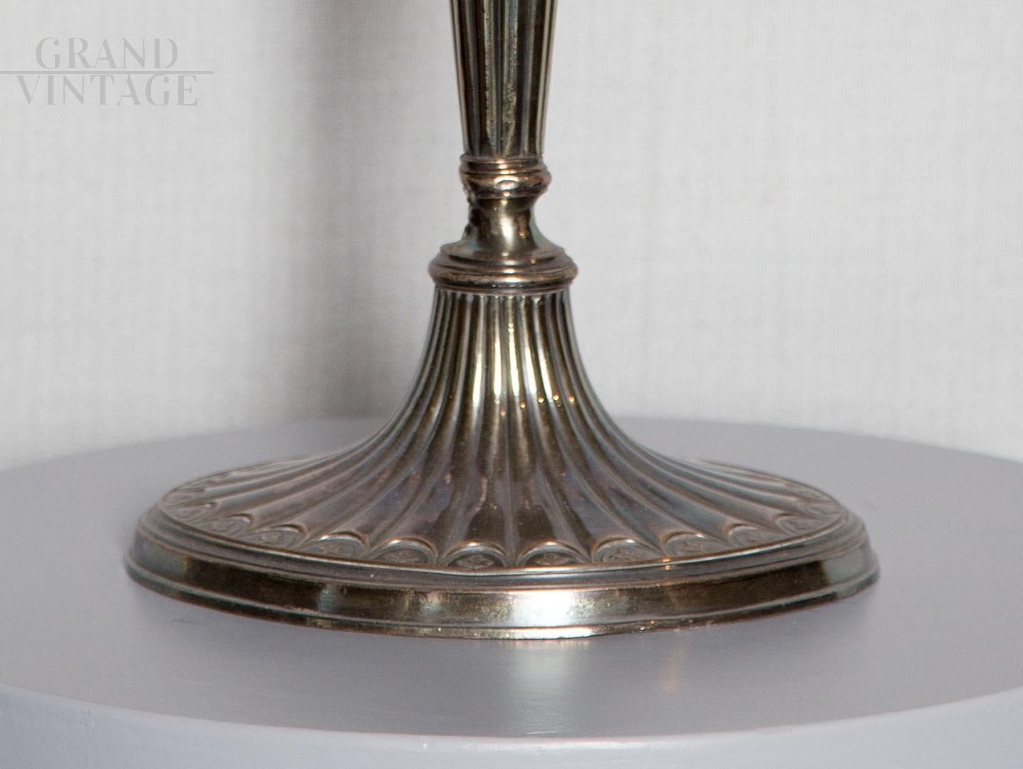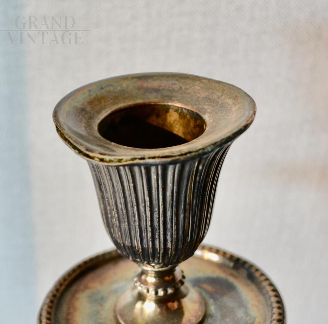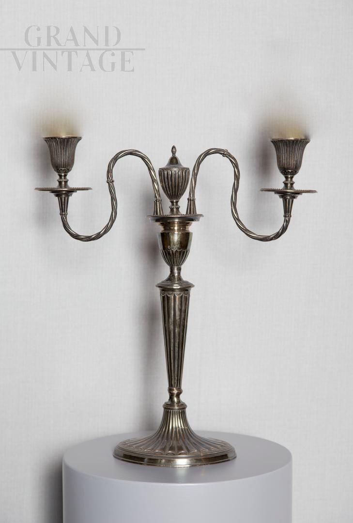 Candeliere di origini Inglesi in metallo argentato del XIX secolo, con lievi difetti come da foto, oggetto che consegnamo pulito, l'argentatura è la sua originale.